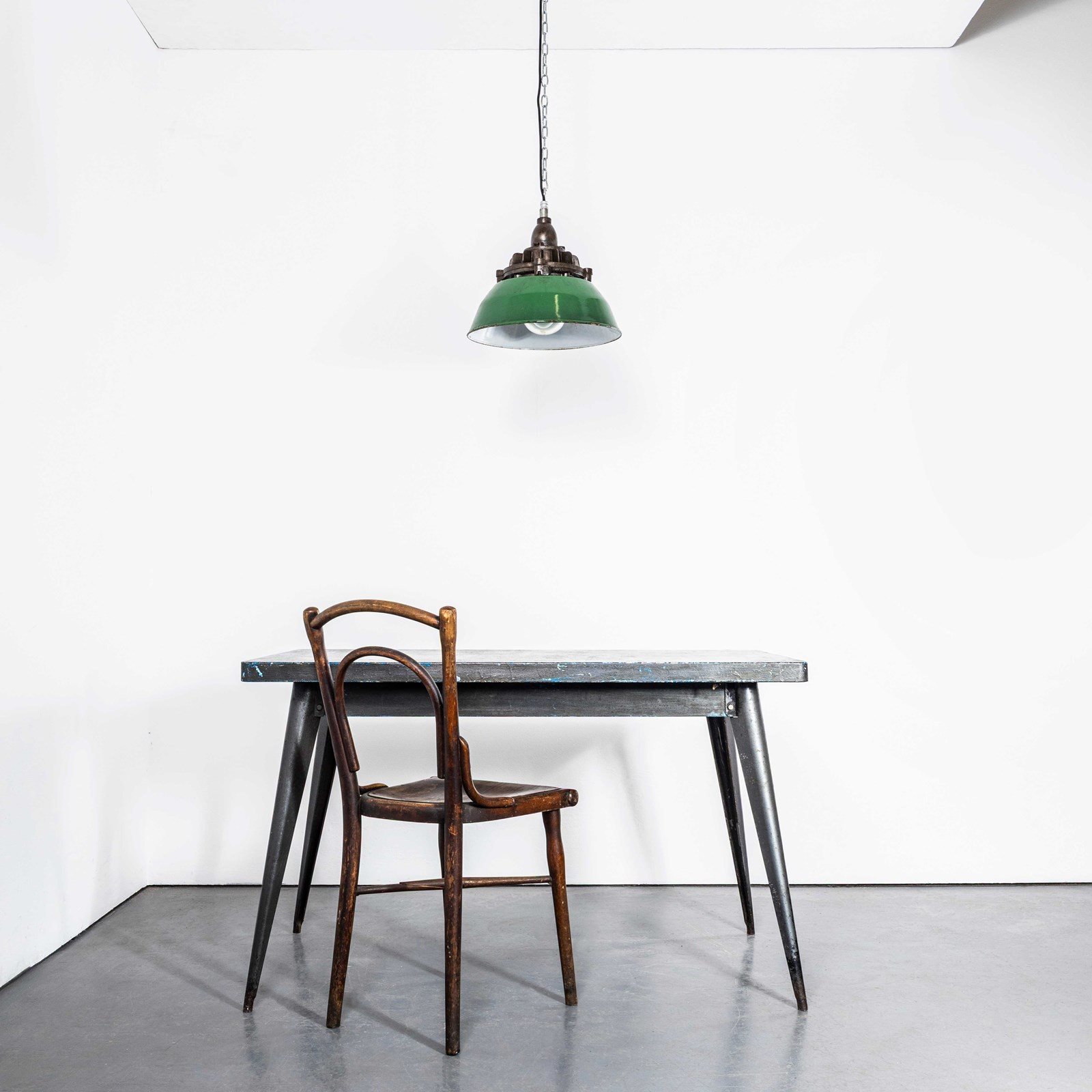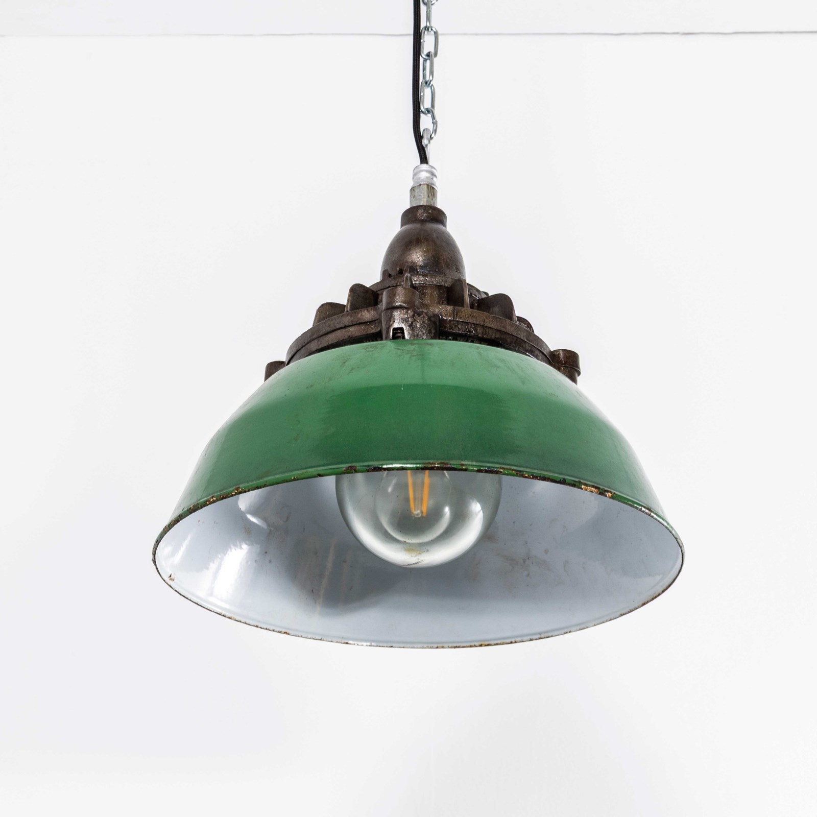 The lamp has been cleaned and restored and all electrical components have been removed and replaced with modern European CE standard components to BS EN 60598. Each lamp is individually tested and labelled to BS EN 60598. INCLUDED: The lamp comes completely wired and ready to install including; 2 metres of chain for hanging the lamps, 2 metres of black silk covered electrical cable and a ceiling hook as shown. The lamp is fitted with a standard E27 threaded lamp holder for which a wide range of modern and vintage style filament bulbs are widely available. We do not currently sell bulbs and recommend LED bulbs 6W maximum. We can supply more than 2 metres of hanging cable/wire/chain etc. as required, please contact us separately to discuss. We are specialists in refurbishment of vintage lighting, please contact us with any questions regarding purchase or installation. Listing is for one lamp. The lamp is currently wired and fitted for UK and EU compliance. The lamp can be wired for compliance in the US or any global market.
