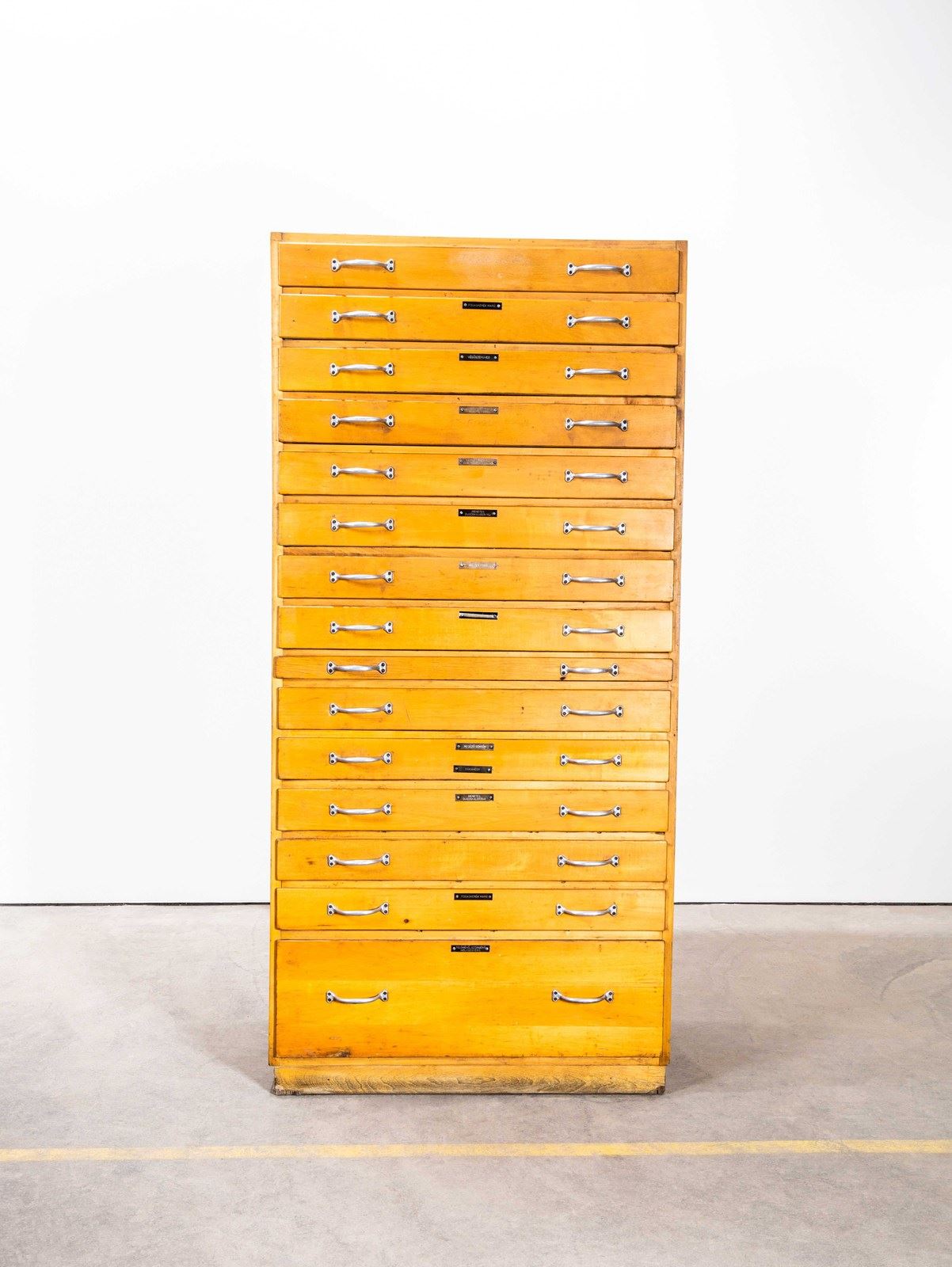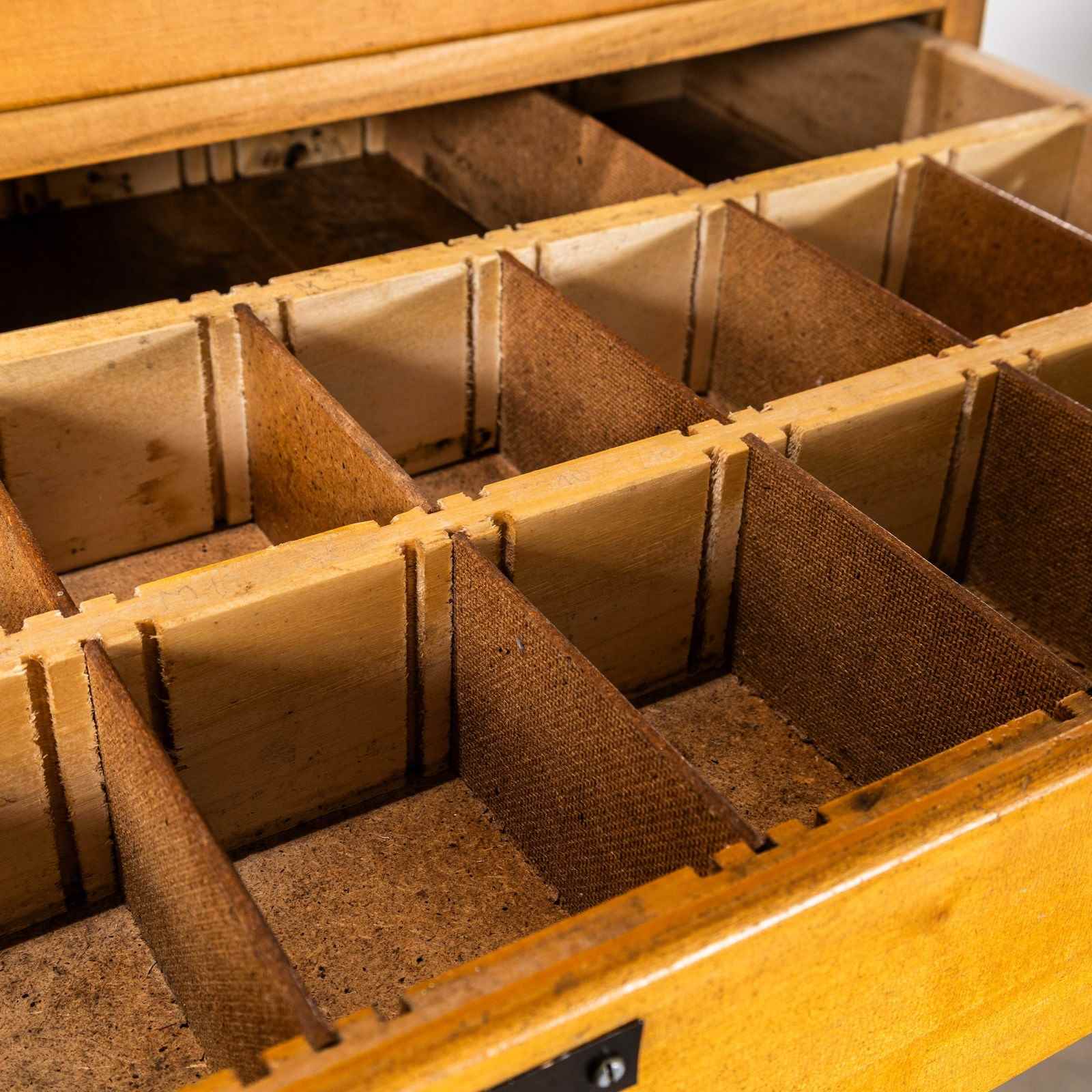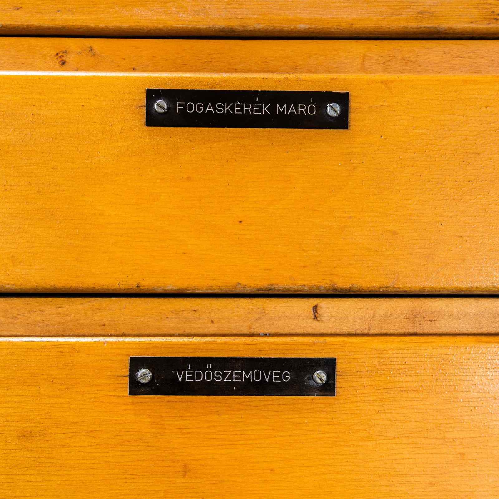 We recently cleared a factory outside Budapest and bought a number of these tall multi drawer cabinets that were used to store tools, components and equipment. Well made in solid beech wood with Masonite drawer bottoms. Our workshop has serviced the cabinet, cleaning and waxing throughout and adjusting the drawers so they run smoothly. The drawers have a mixture of internal dividers that can be adjusted and feature the original pressed metal handles. The cabinet is one piece.