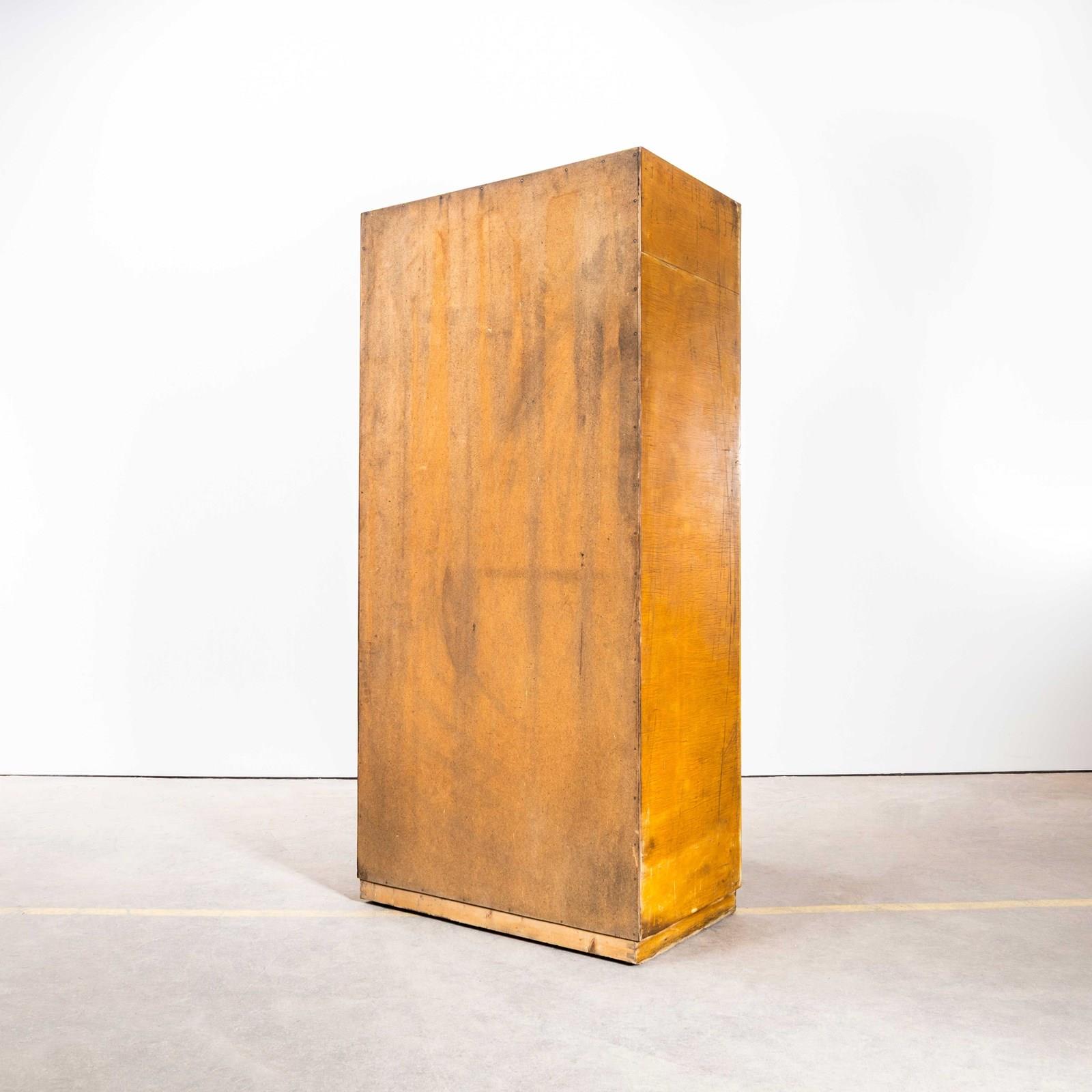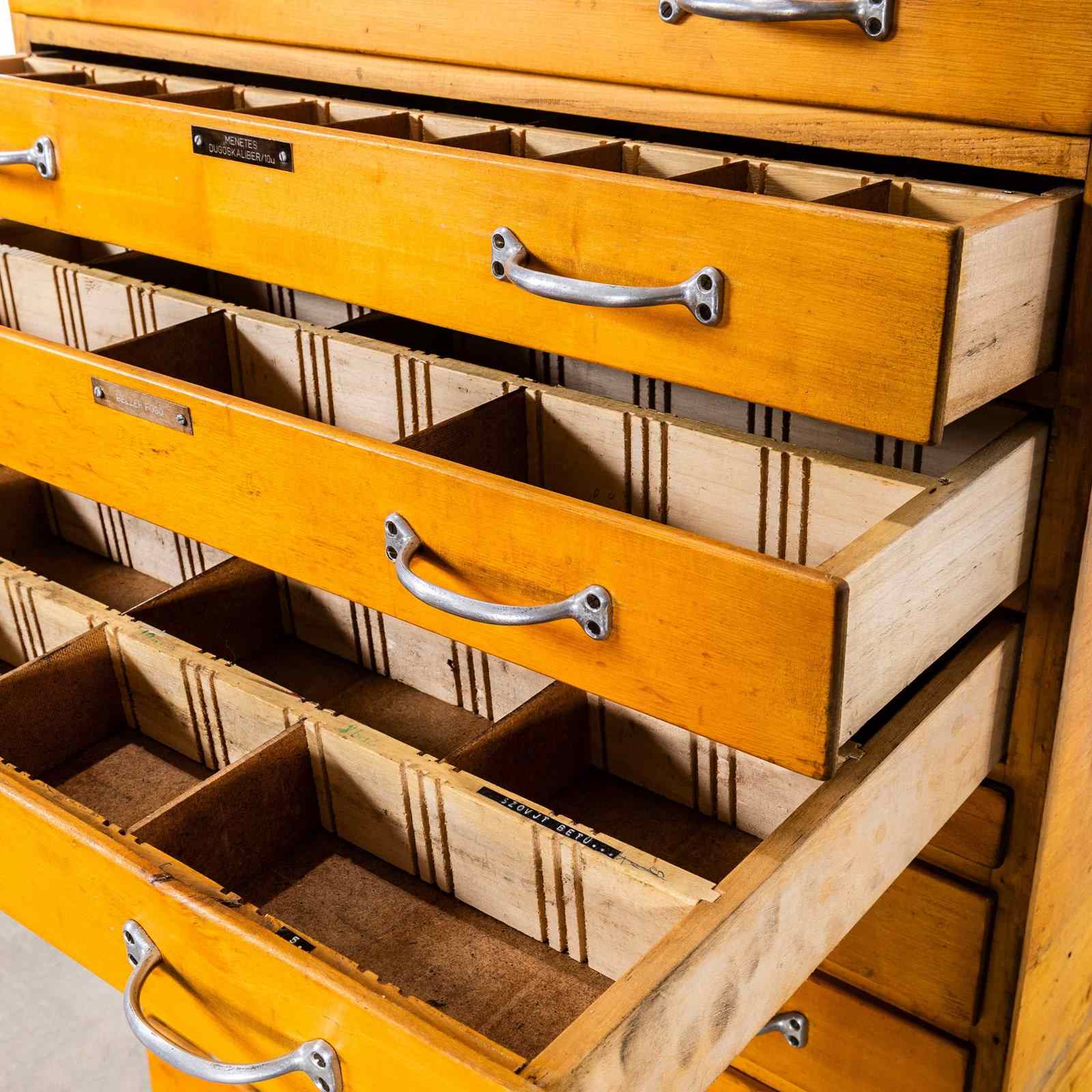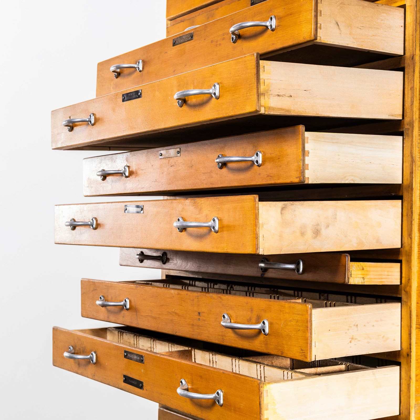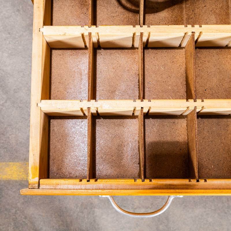 We recently cleared a factory outside Budapest and bought a number of these tall multi drawer cabinets that were used to store tools, components and equipment. Well made in solid beech wood with Masonite drawer bottoms. Our workshop has serviced the cabinet, cleaning and waxing throughout and adjusting the drawers so they run smoothly. The drawers have a mixture of internal dividers that can be adjusted and feature the original pressed metal handles. The cabinet is one piece.