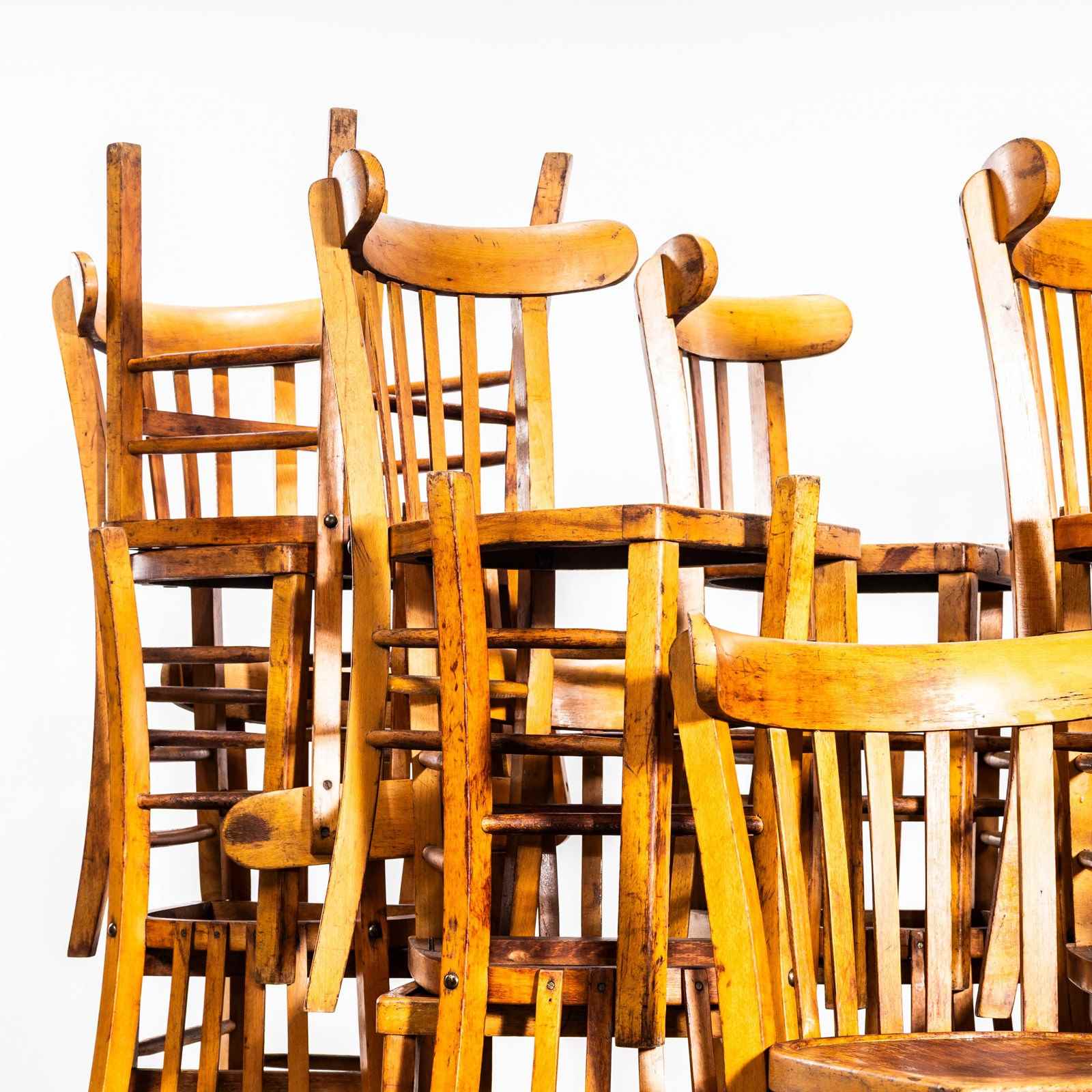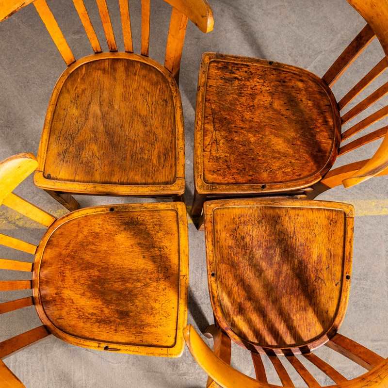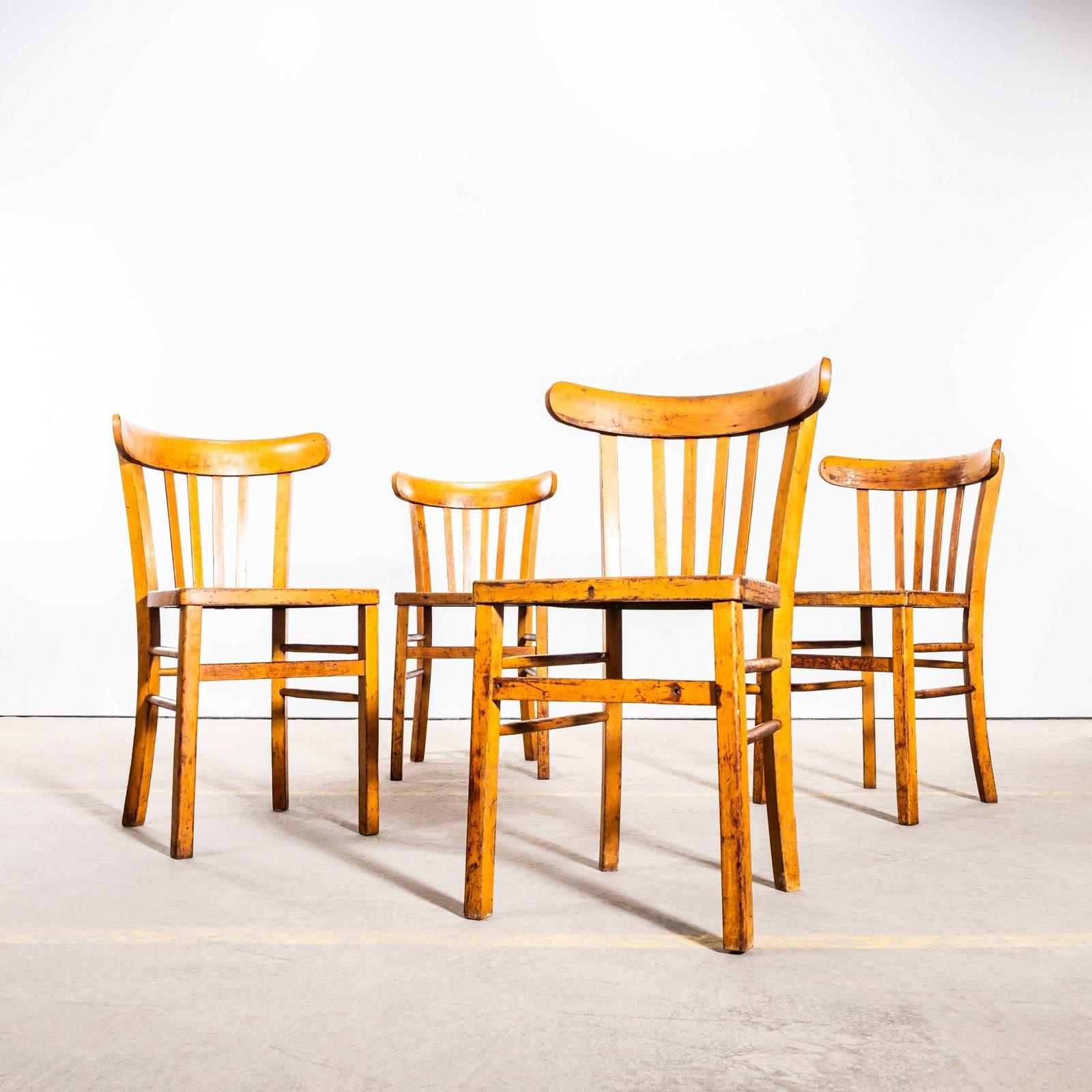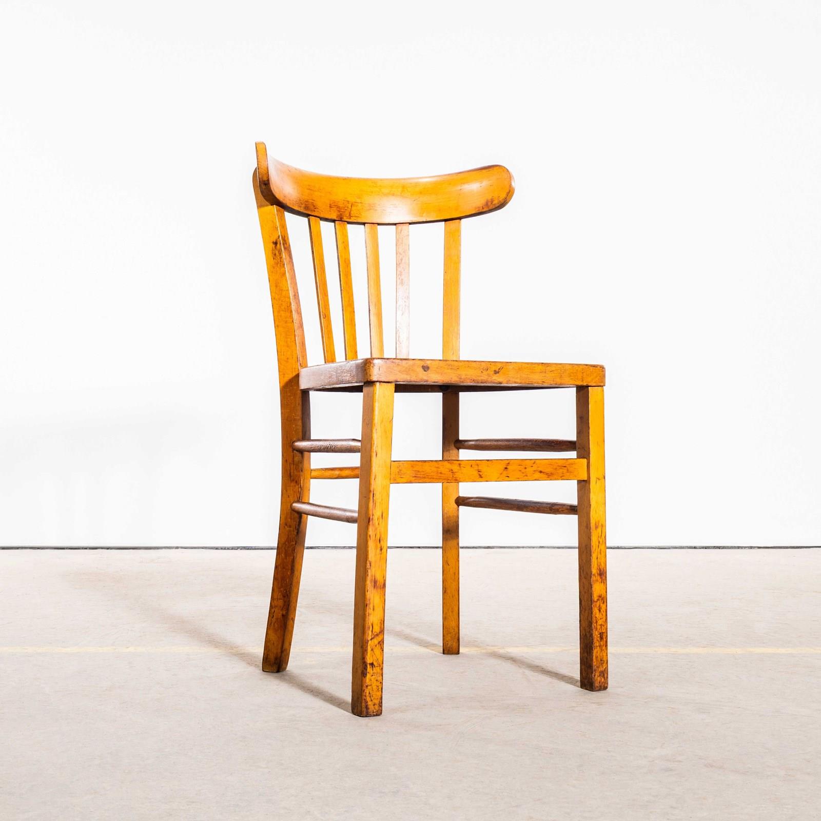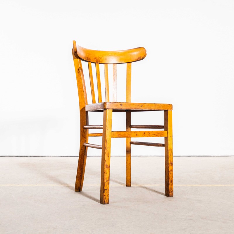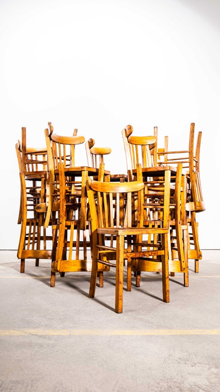 The process of steam bending beech to create elegant chairs was discovered and developed by Thonet, but when its patents expired in 1869, many companies including Luterma launched production. Luterma was one of the brands marketed by Estonian factory A.M. Luther which was founded in the late 19th Century in Tallinn. Luther’s production was principally in Estonia but they also had factories in France for local market production. At the time of the Bauhaus movement Walter Gropius and Marcel Breuer worked with the factory to develop various models. These chairs date from the 1950’s, a simple classic farmhouse shape with a beautiful colour and defined backs. This is a mixed set of chairs, all very very similar but with minor design differences in leg support detail, back width etc. A classic Luterma shape, this is perfect for the hospitality industry, great practical chairs. We service and rejuvenate each chair before it leaves our workshop and we deliver chairs of excellent quality.