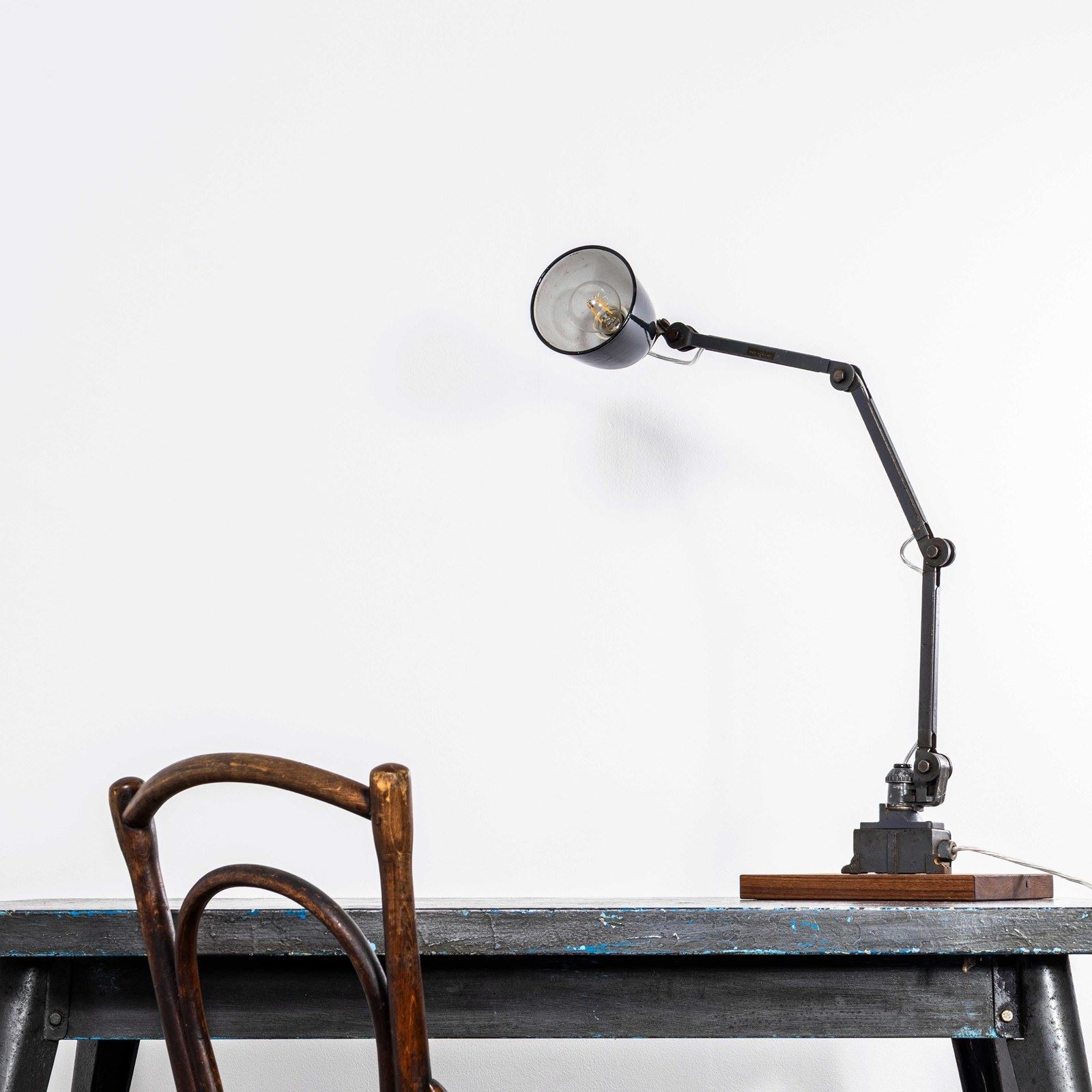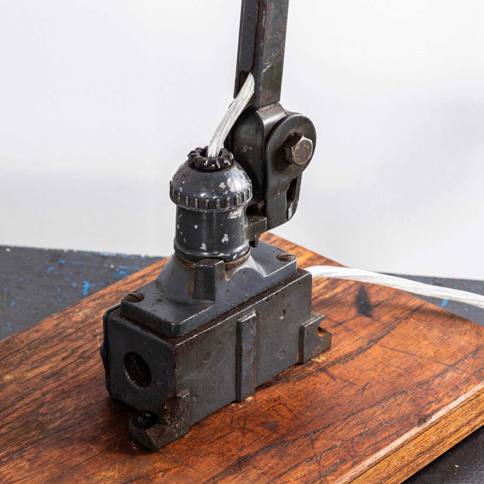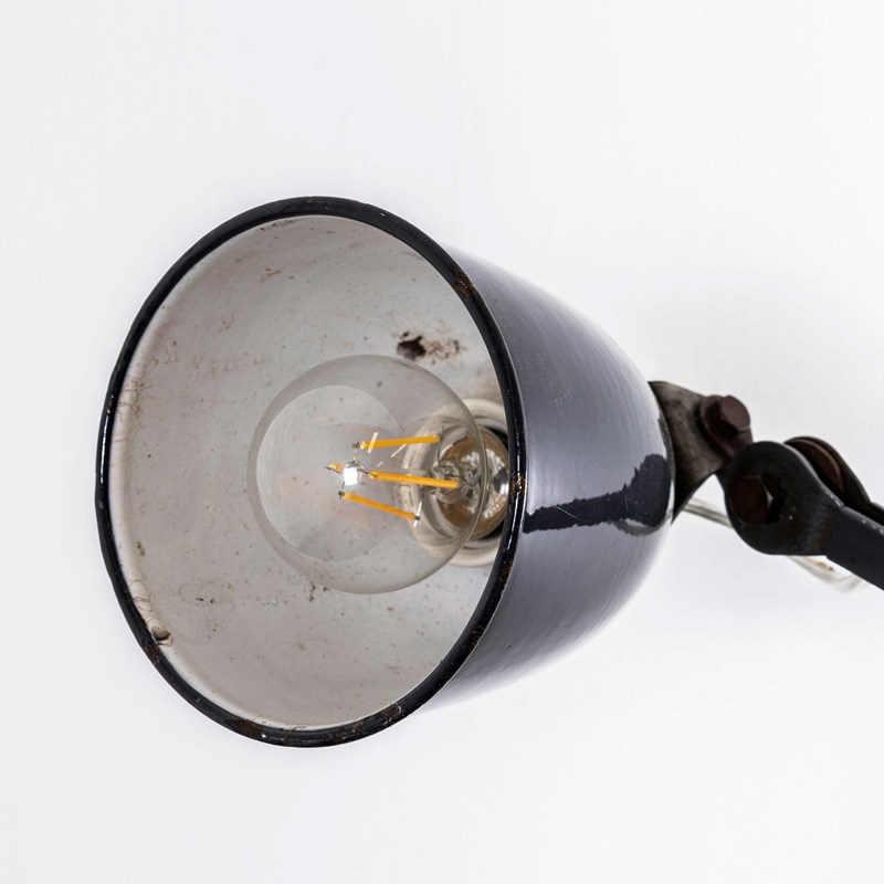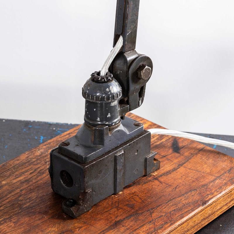 The lamp was produced by EDL Lighting Ltd, a British company founded in Staffordshire in 1922. The lamp has been cleaned and restored but we have left the history and character. The lamp is individually tested and labelled to BS EN 60598. The lamp comes completely wired and ready to use as shown. We have mounted the lamp on a small slab of salvaged Iroko which is counter weighted underneath. The lamp is fitted with a standard E27 threaded lamp holder for which a wide range of modern and vintage style filament bulbs are widely available. We do not currently sell bulbs and recommend LED bulbs 6W maximum. The lamp is currently wired and fitted for UK and EU compliance. Please note the correct plug will be fitted for use in the delivery address country. The height of the lamp is measured when it’s fully extended.