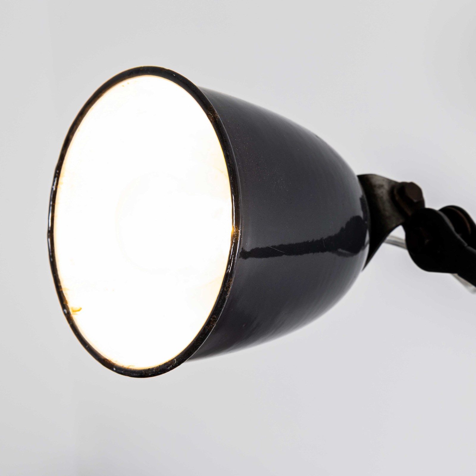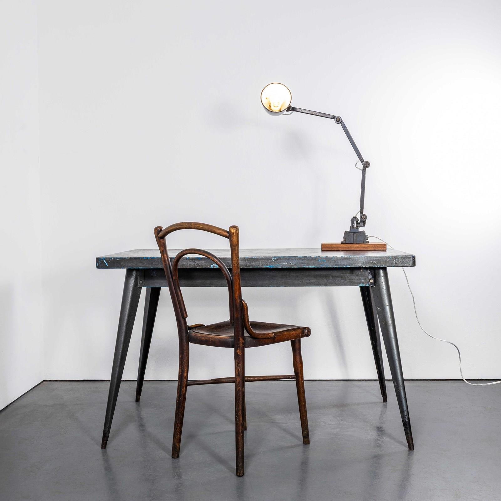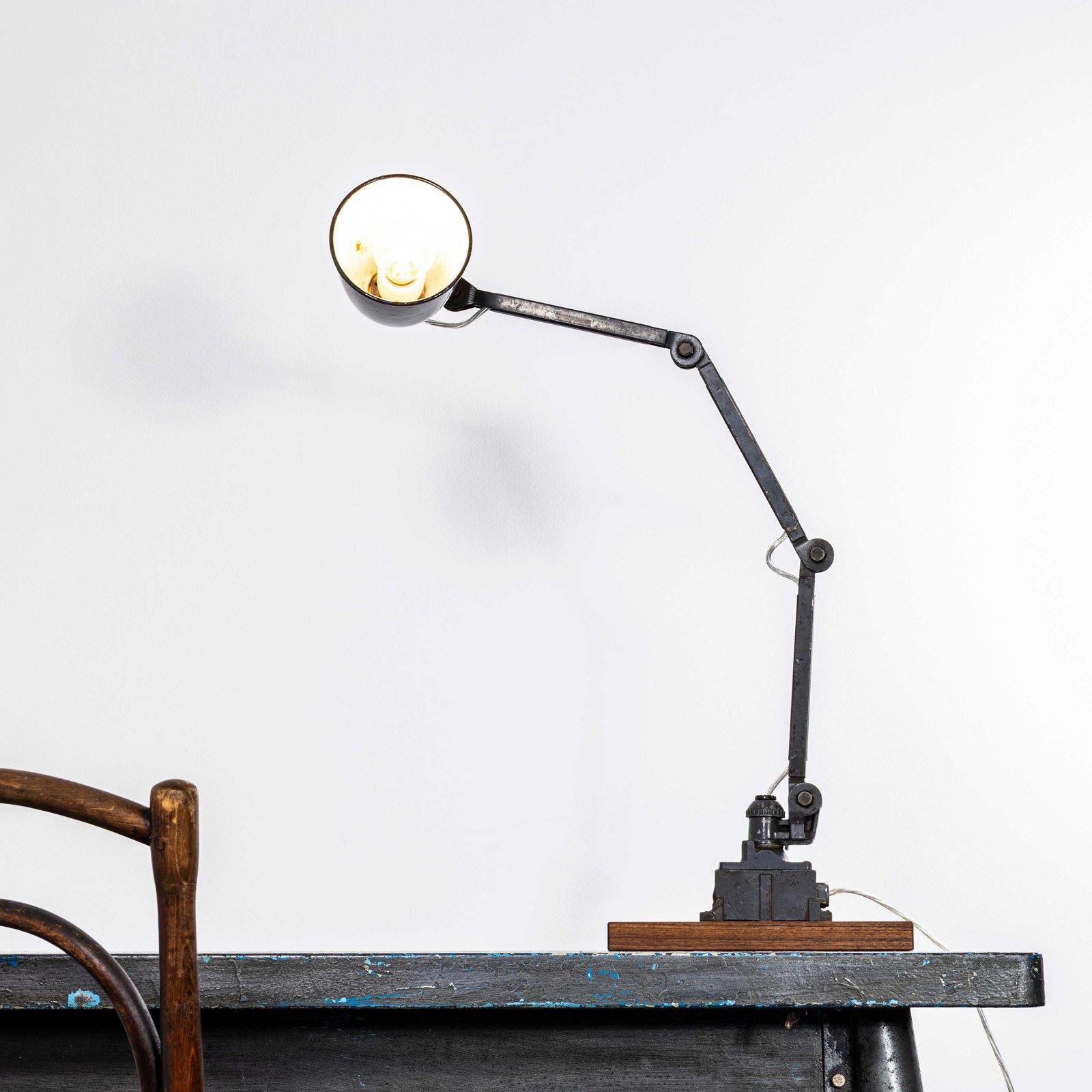 The lamp was produced by EDL Lighting Ltd, a British company founded in Staffordshire in 1922. The lamp has been cleaned and restored but we have left the history and character. The lamp is individually tested and labelled to BS EN 60598. The lamp comes completely wired and ready to use as shown. We have mounted the lamp on a small slab of salvaged Iroko which is counter weighted underneath. The lamp is fitted with a standard E27 threaded lamp holder for which a wide range of modern and vintage style filament bulbs are widely available. We do not currently sell bulbs and recommend LED bulbs 6W maximum. The lamp is currently wired and fitted for UK and EU compliance. Please note the correct plug will be fitted for use in the delivery address country. The height of the lamp is measured when it’s fully extended.