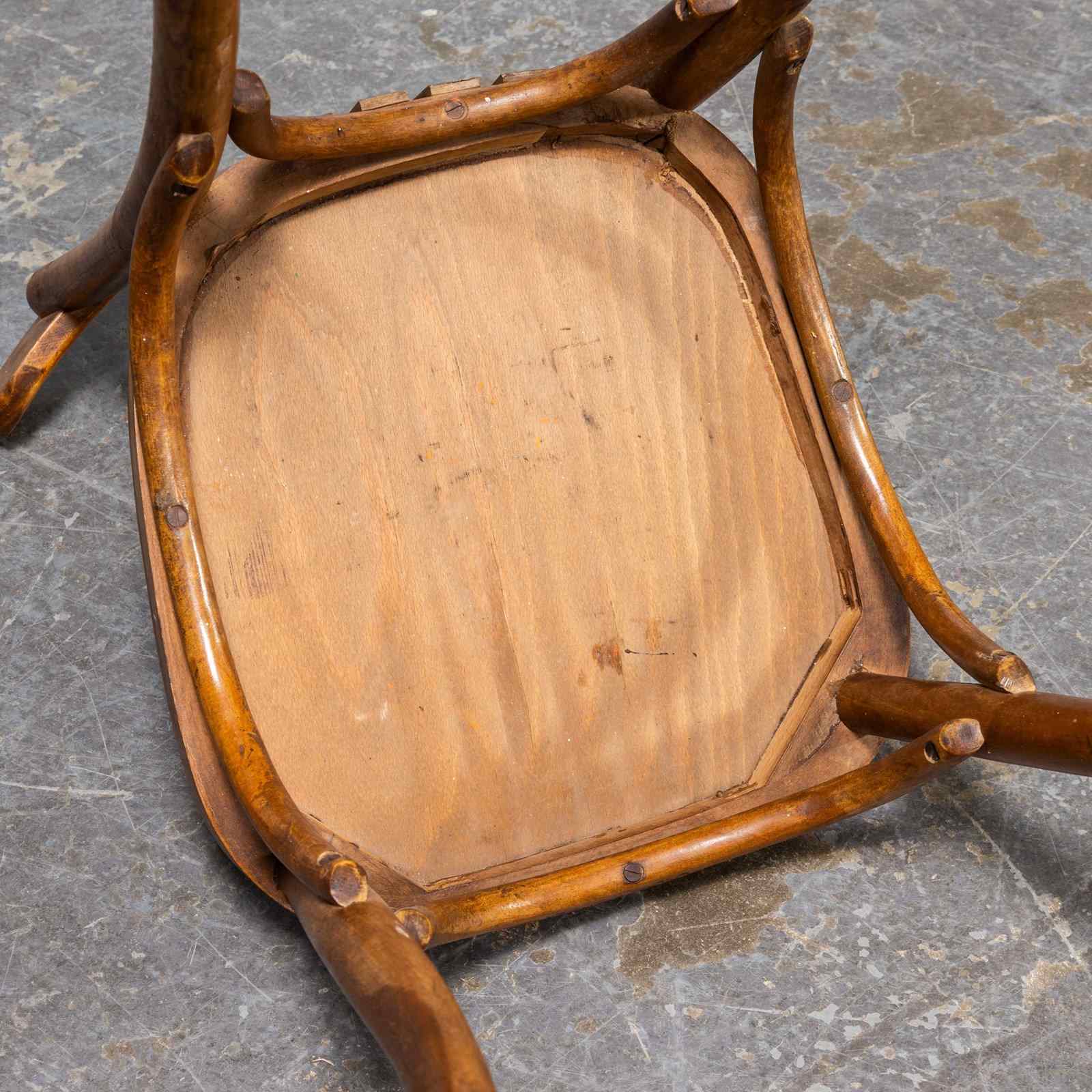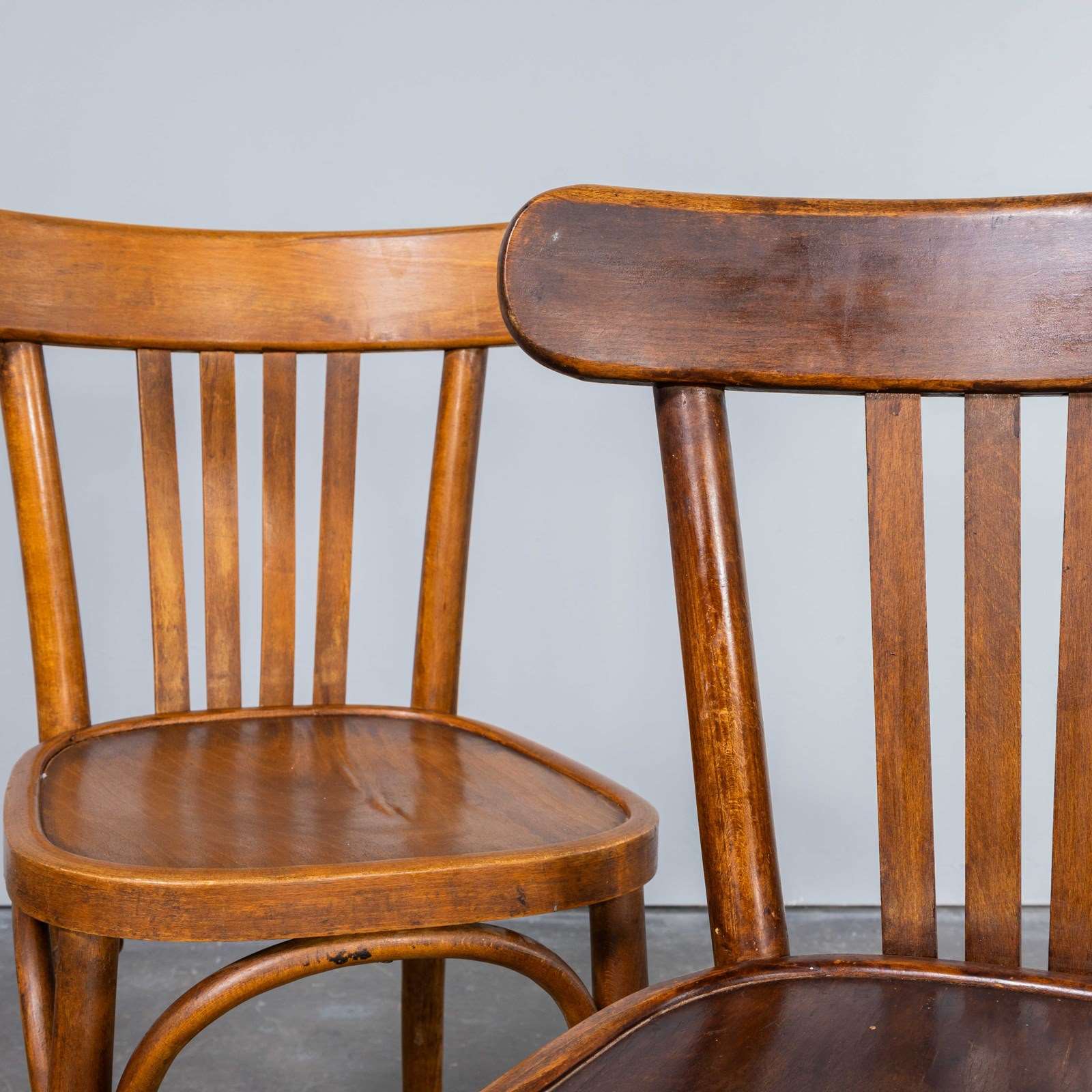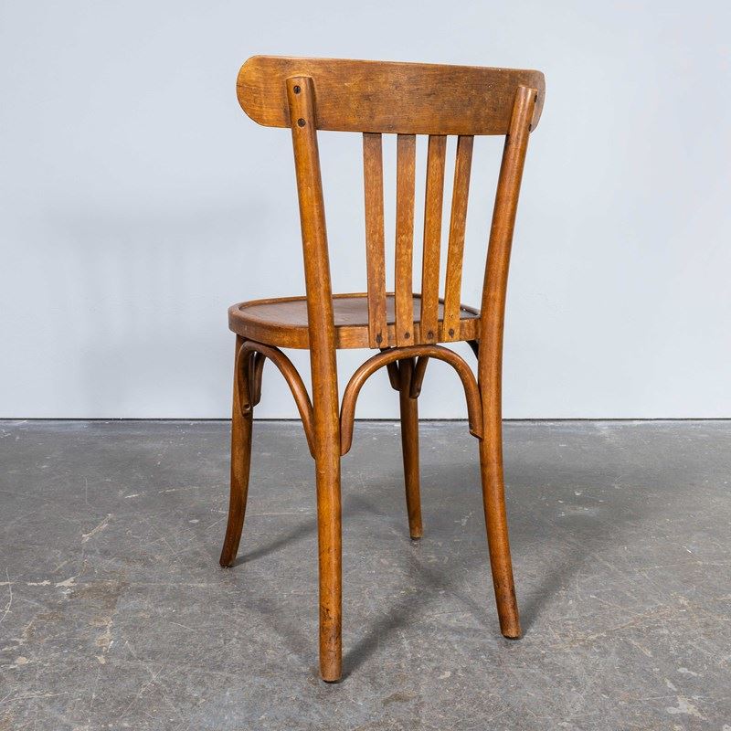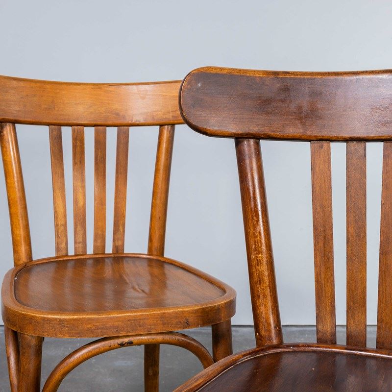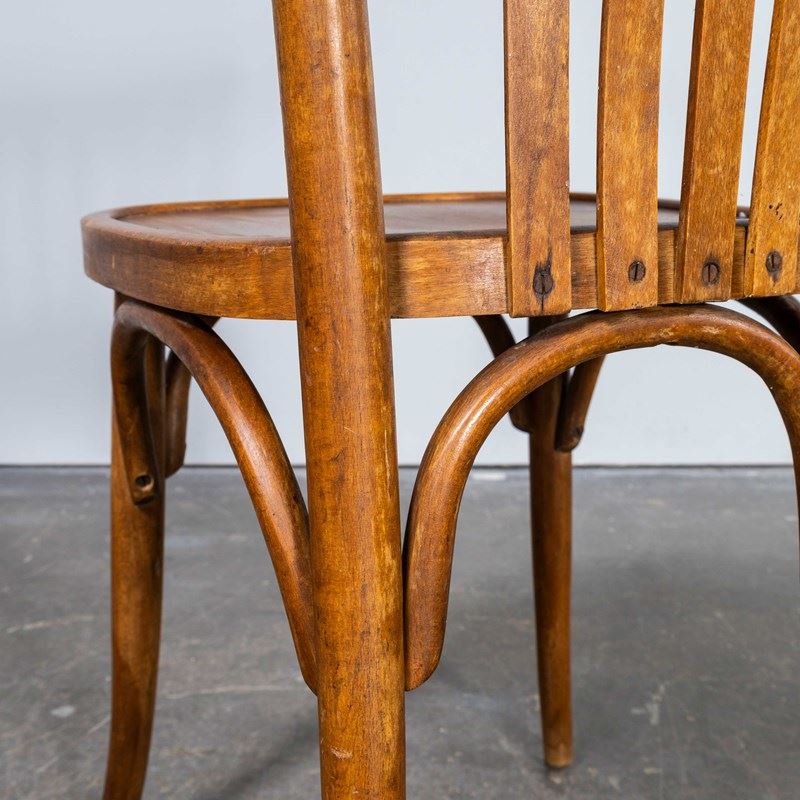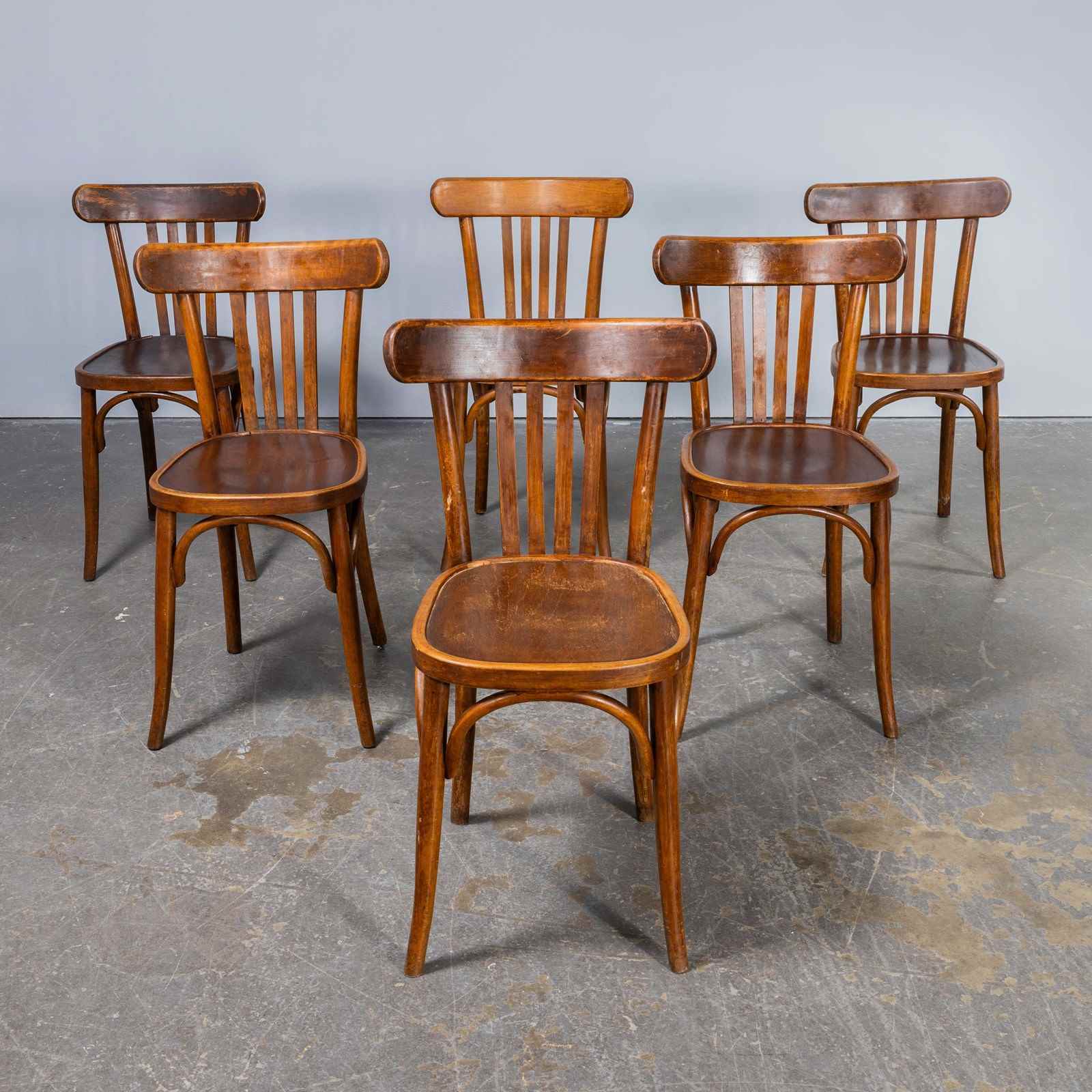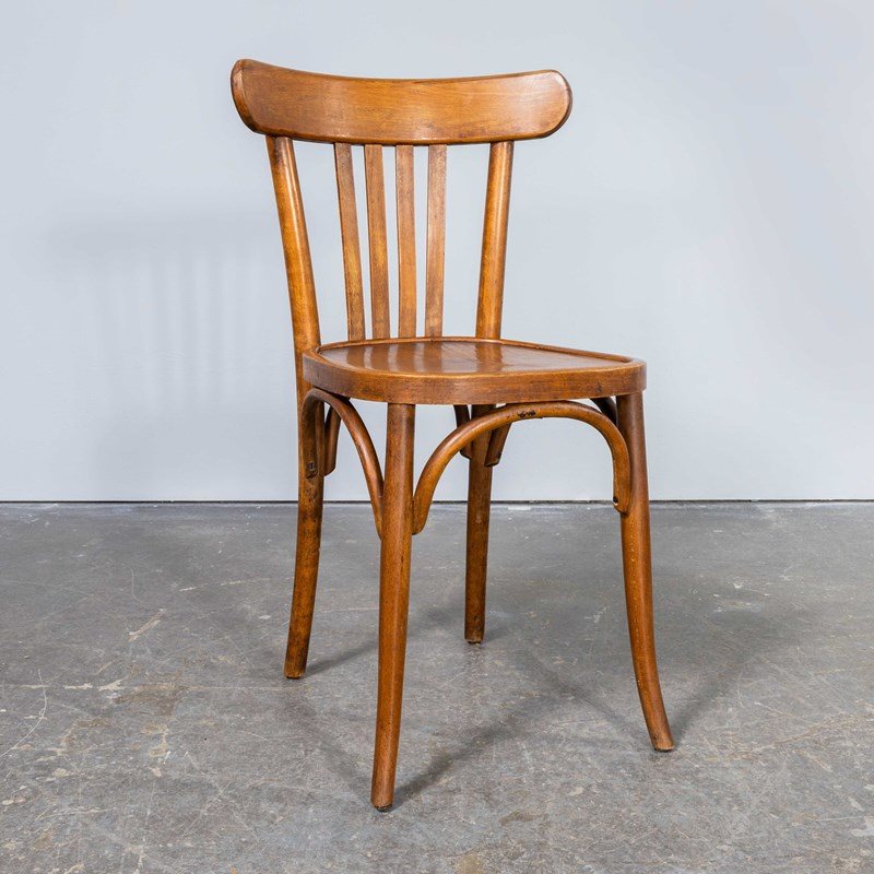 1960's Baumann Warm Oak Bistro Dining Chairs - Set Of Six. Classic bistro chairs made in France by the maker Baumann. Baumann chairs are relatively off the radar and are starting to attract the attention they deserve, beautifully designed and crafted they are now so hard to find. These mid oak chairs are elegant and comfortable with a lovely rich character and colour. We service and wax our chairs before they leave our workshop and we deliver chairs of excellent quality. Seat Height 48cm