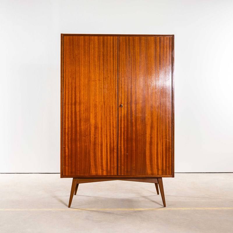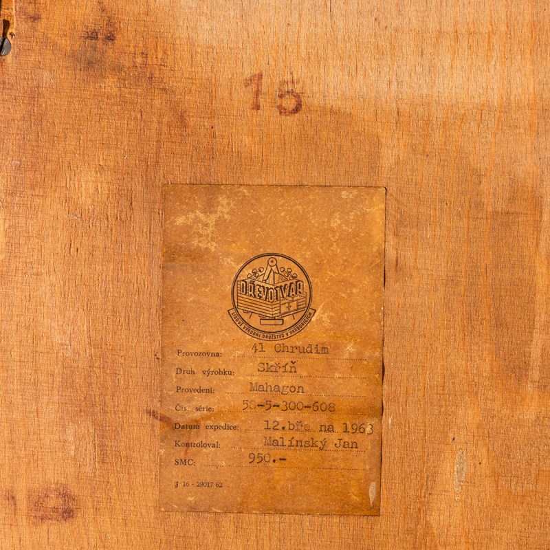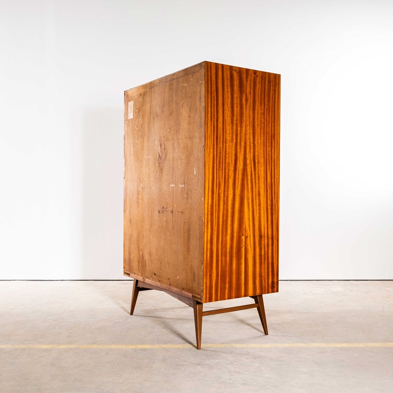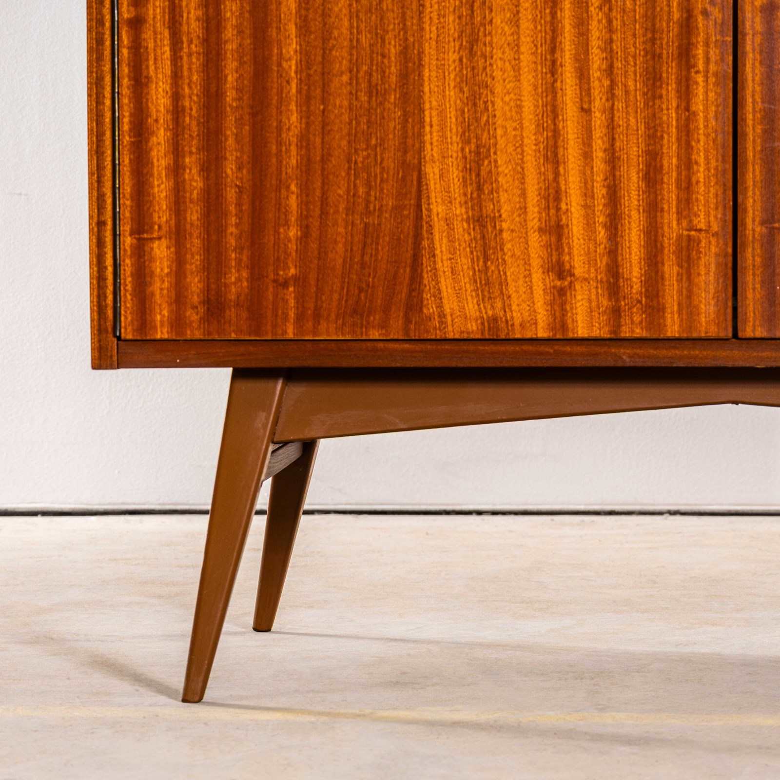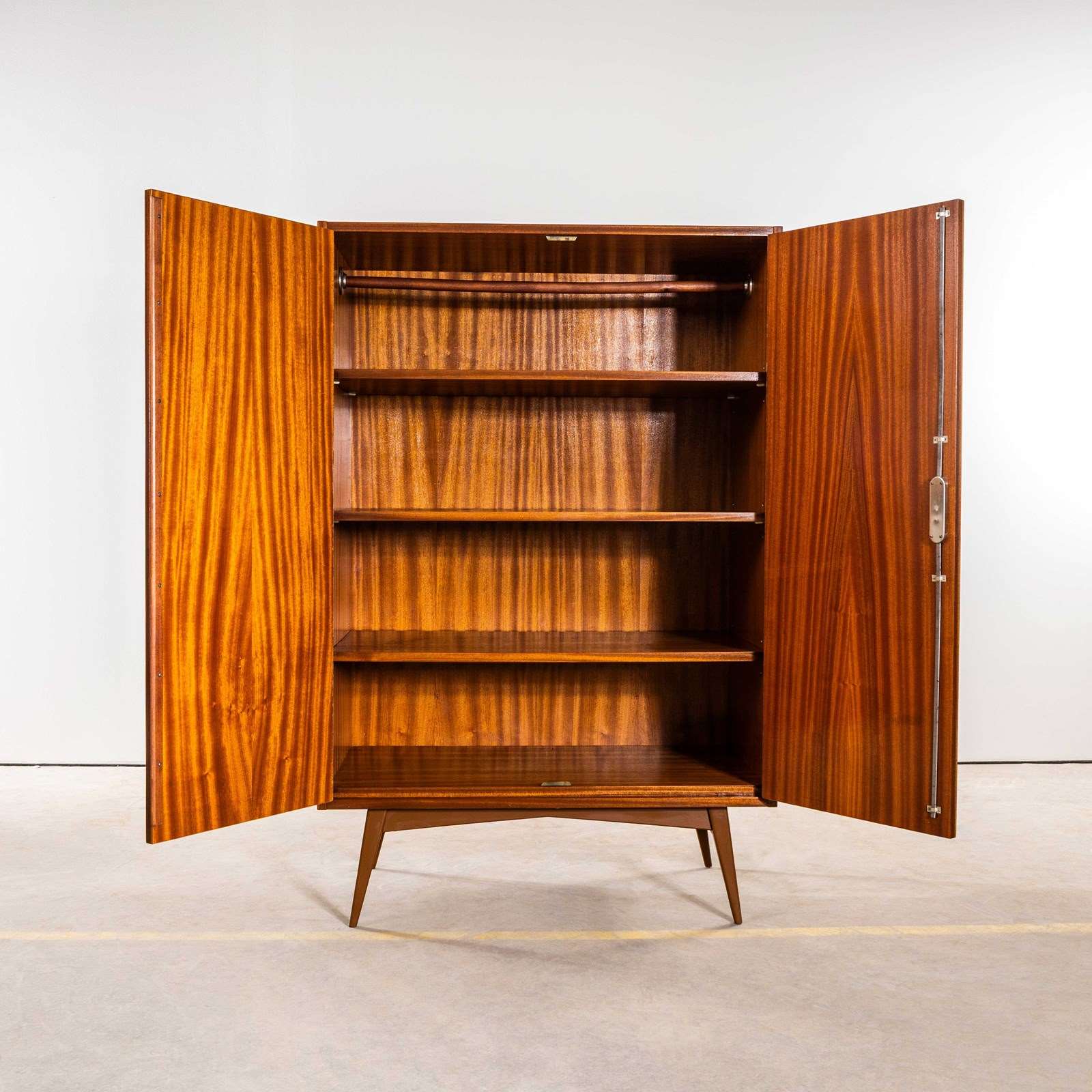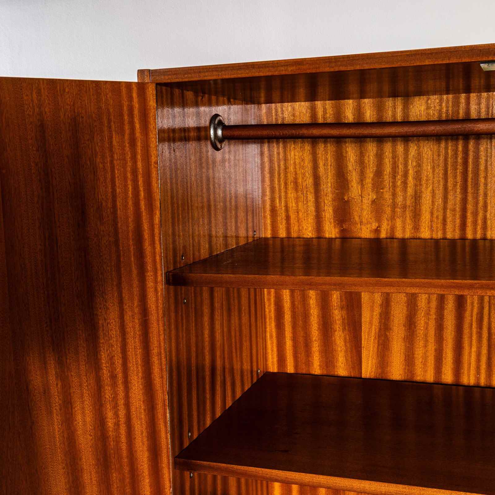 Produced by Dřevotvar in the Czech Republic. Czech design will always be affiliated to the Bauhaus movement which inspired a generation of design and industrial production in Czechia principally during the second half of the 20th Century with producers such as Ton and Up Zavody amongst many others. This is a high quality practical storage cabinet made in a rich dark sapele with a contrasting sapele interior. In exceptional original condition the cabinet has been sensitively restored in our own workshop. The cabinet features three full width adjustable shelves which are original plus an original wardrobe shelf which gives flexibility as the shelves are removeable (and adjustable). The cabinet sits on a graceful painted base. Internal dimensions: 47L x 90W. The shelves are set at 27H each. All in cm.