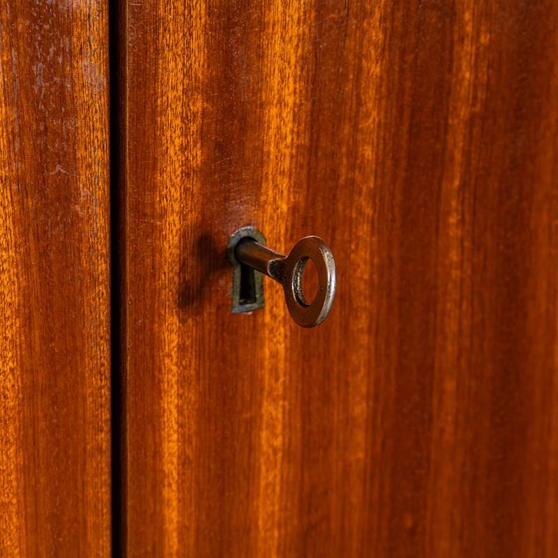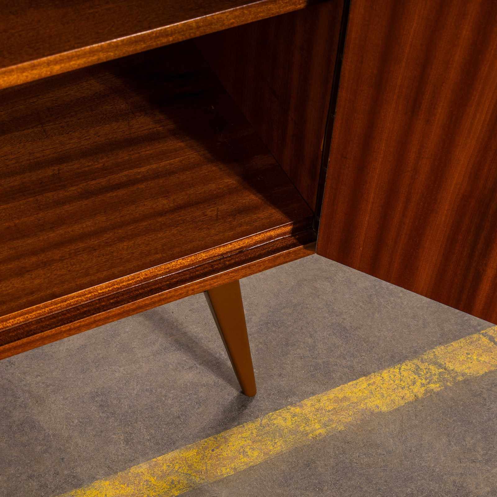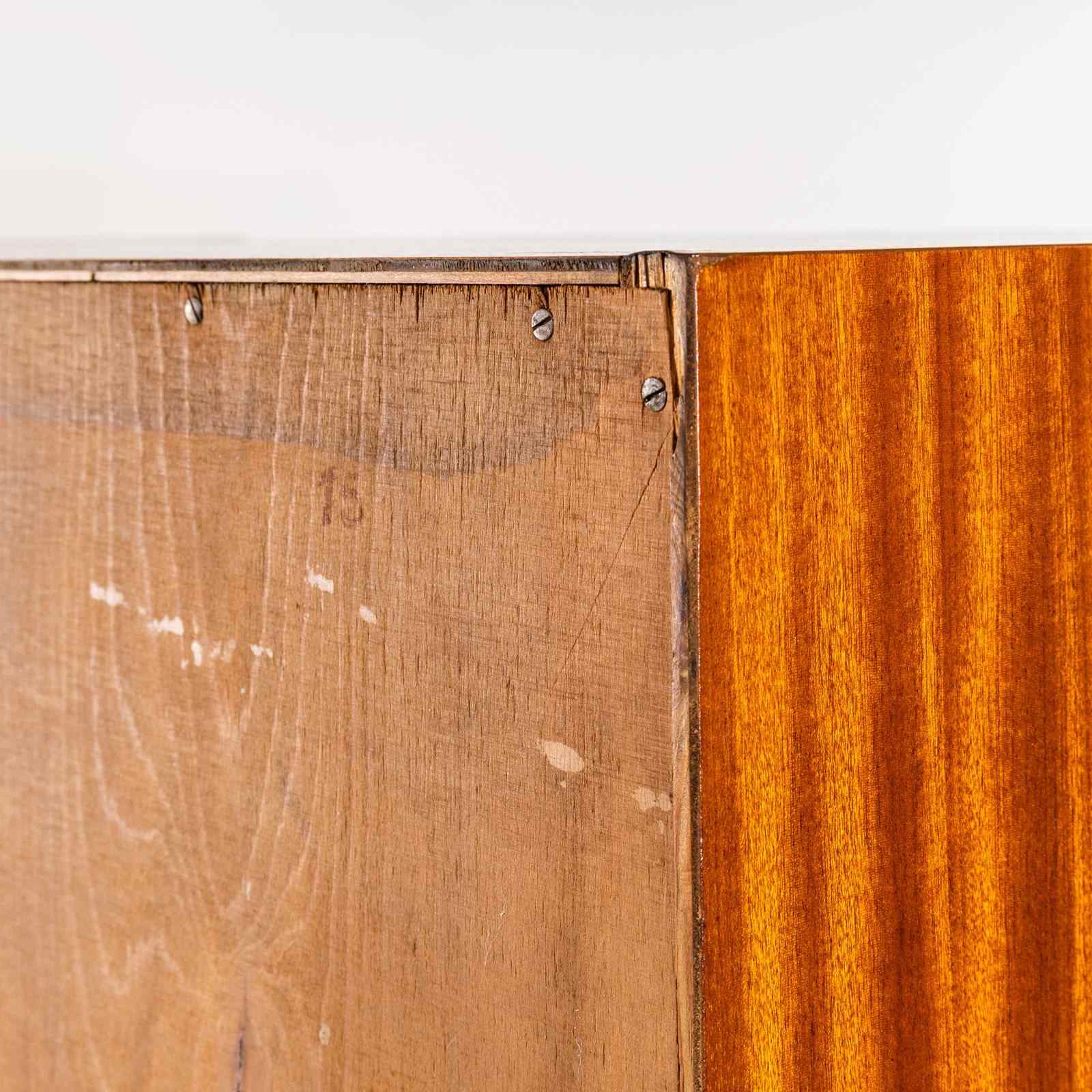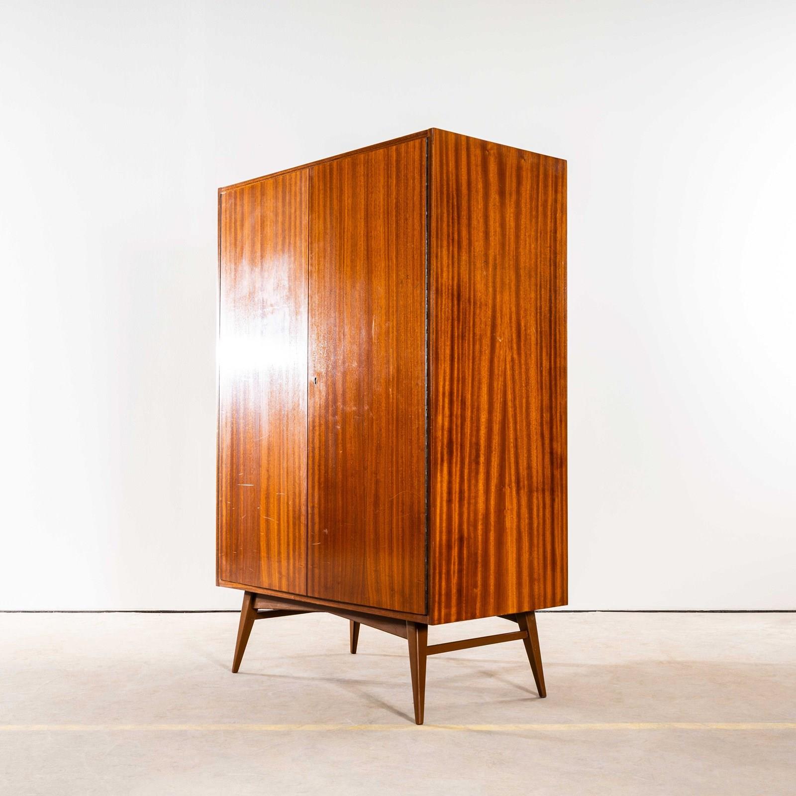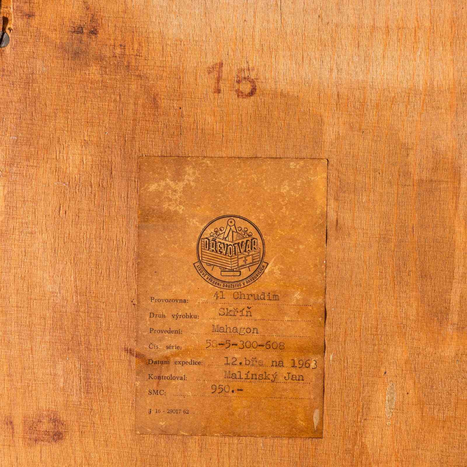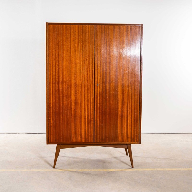 Produced by Dřevotvar in the Czech Republic. Czech design will always be affiliated to the Bauhaus movement which inspired a generation of design and industrial production in Czechia principally during the second half of the 20th Century with producers such as Ton and Up Zavody amongst many others. This is a high quality practical storage cabinet made in a rich dark sapele with a contrasting sapele interior. In exceptional original condition the cabinet has been sensitively restored in our own workshop. The cabinet features three full width adjustable shelves which are original plus an original wardrobe shelf which gives flexibility as the shelves are removeable (and adjustable). The cabinet sits on a graceful painted base. Internal dimensions: 47L x 90W. The shelves are set at 27H each. All in cm.
