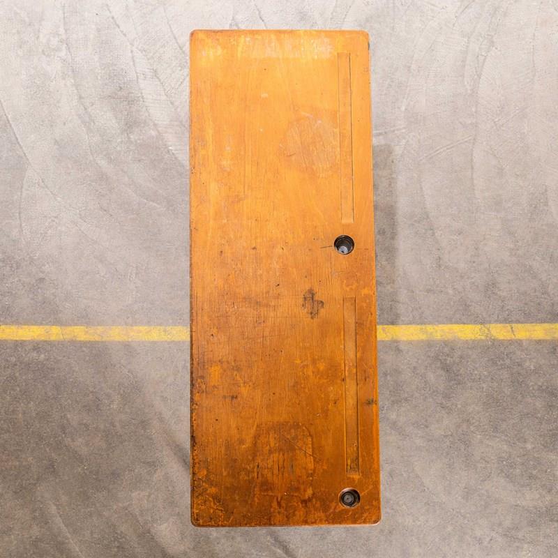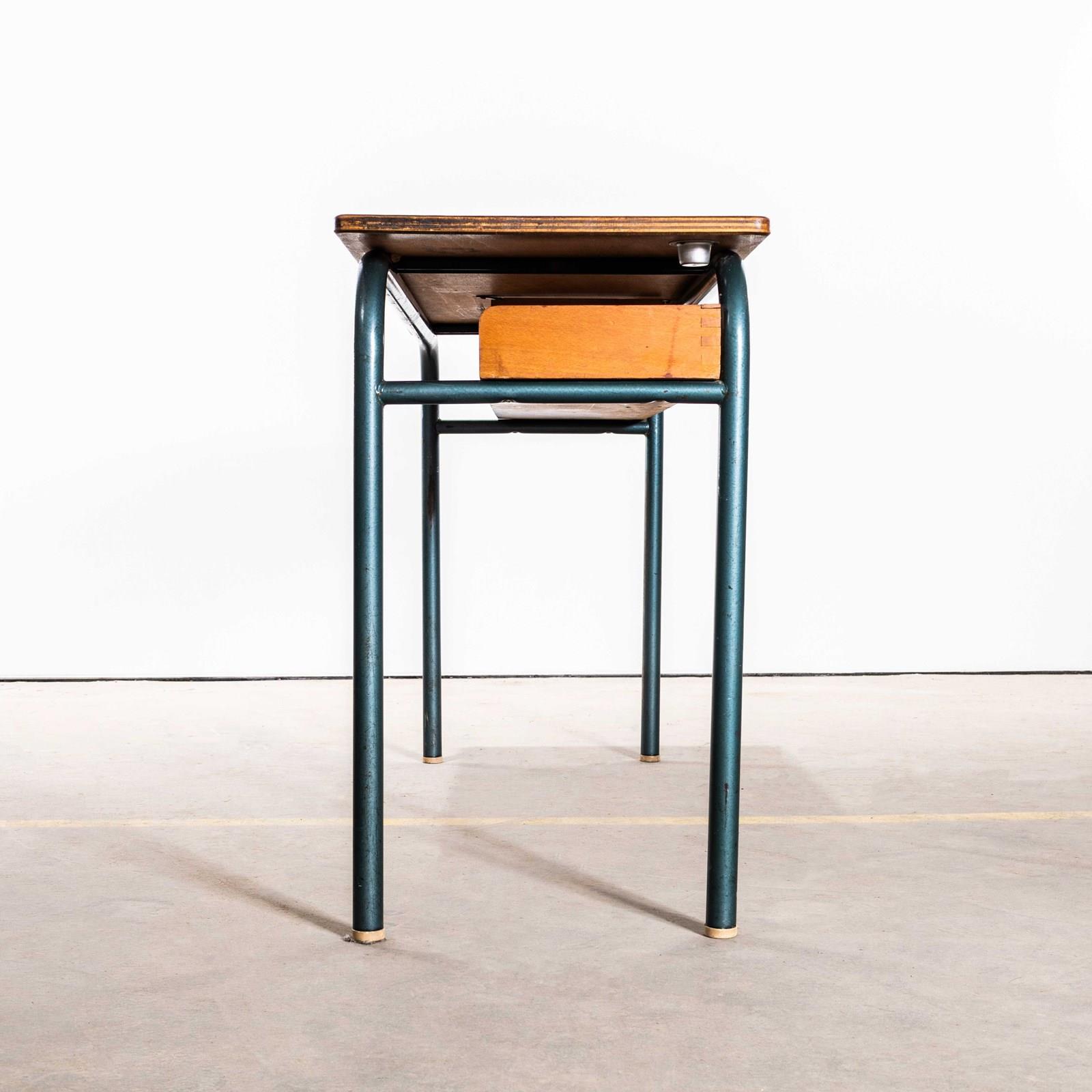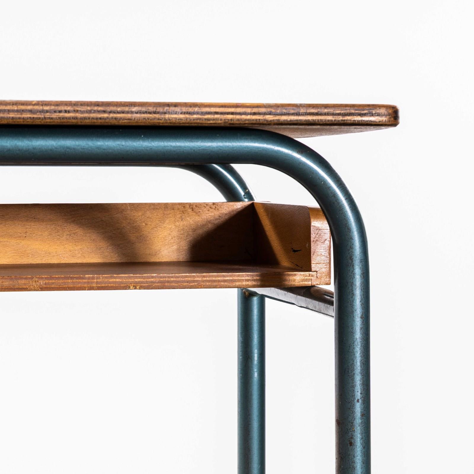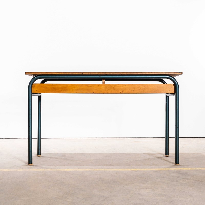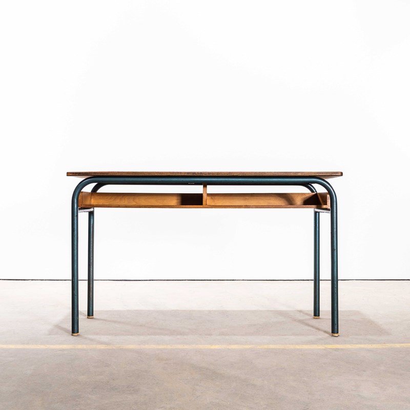 In 1947 Robert Muller and Gaston Cavaillon created the company that went on to develop arguably the most famous French school furniture brand Mullca. Sadly the company no longer exists but vintage chairs and desks can still be found. This desk is a classic sixties school desk, tubular metal legs in the classic Mullca aqua green with a well used beech top and practical second shelf storage.