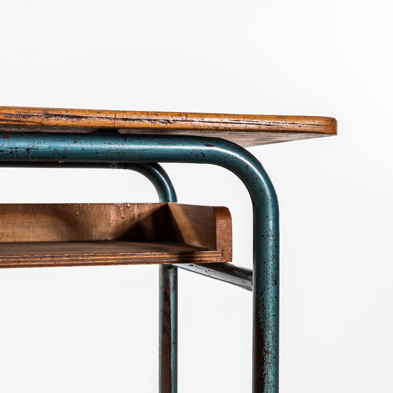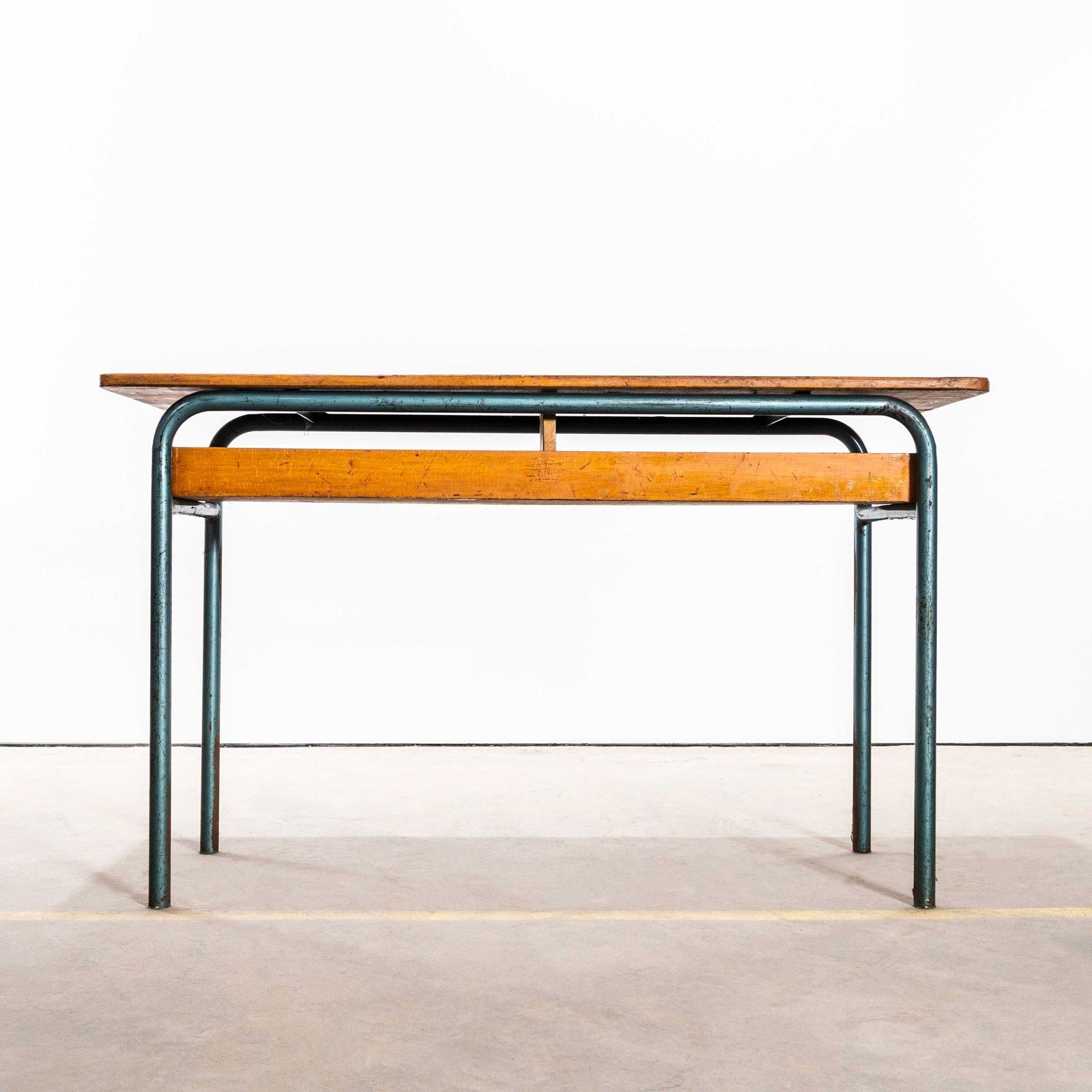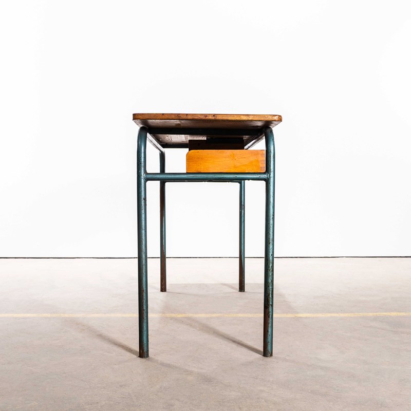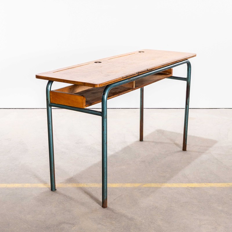 In 1947 Robert Muller and Gaston Cavaillon created the company that went on to develop arguably the most famous French school furniture brand Mullca. Sadly the company no longer exists but vintage chairs and desks can still be found. This desk is a classic sixties school desk, tubular metal legs in the classic Mullca aqua green with a well used beech top and practical second shelf storage.