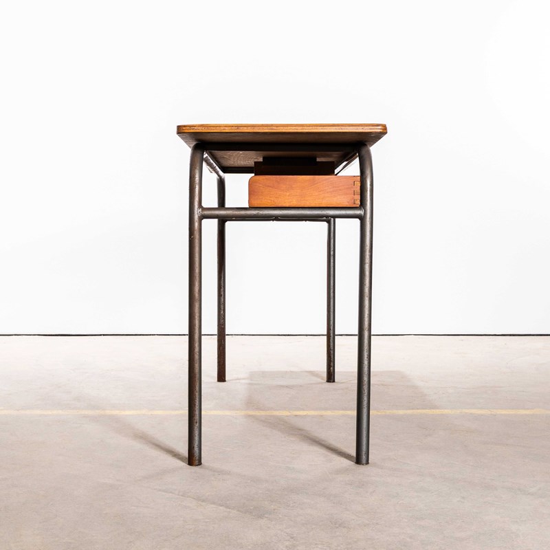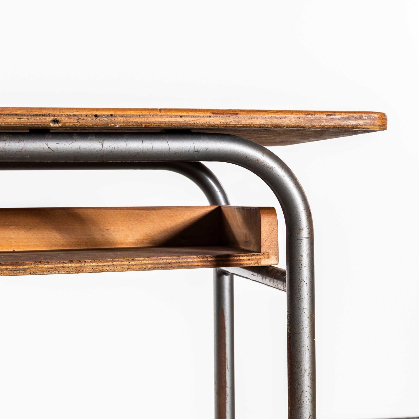 In 1947 Robert Muller and Gaston Cavaillon created the company that went on to develop arguably the most famous French school furniture brand Mullca. Sadly the company no longer exists but vintage chairs and desks can still be found. This desk is a classic sixties school desk, tubular metal legs in the classic Mullca silver with a well used beech top and practical second shelf storage.