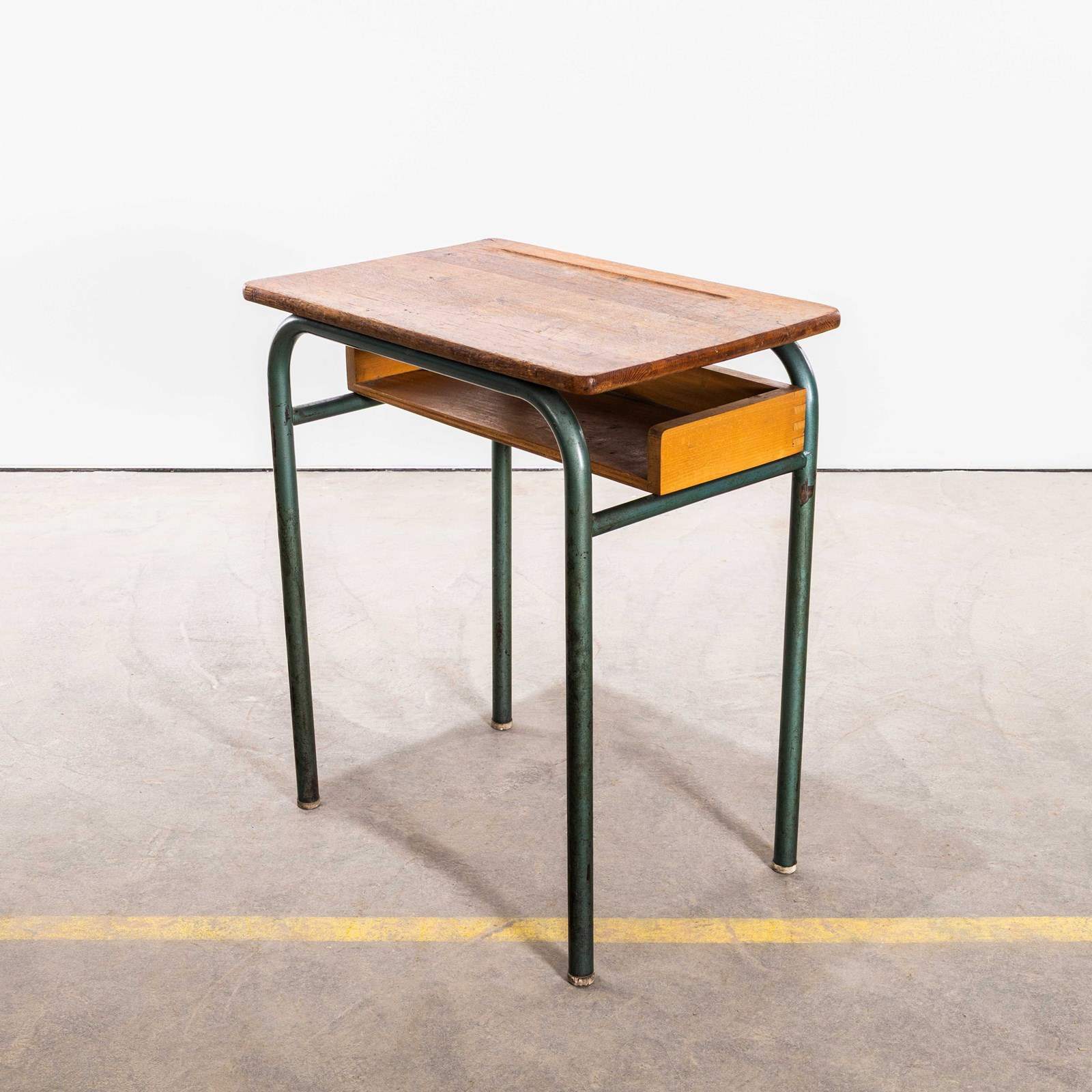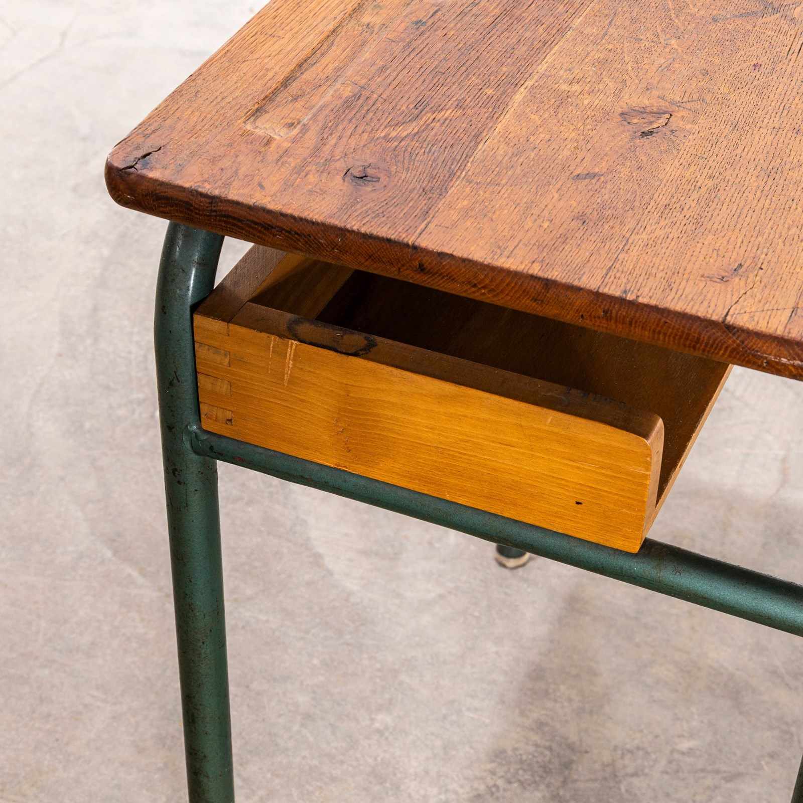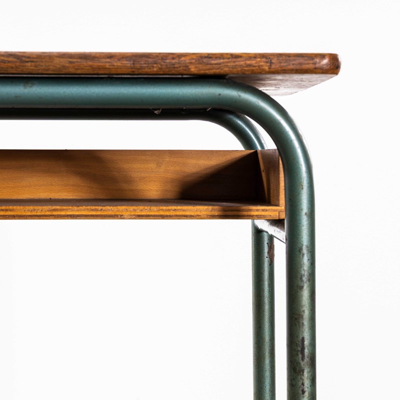 In 1947 Robert Muller and Gaston Cavaillon created the company that went on to develop arguably the most famous French school furniture brand Mullca. Sadly the company no longer exists but vintage chairs and desks can still be found. This desk is a classic sixties school desk, tubular metal legs in the classic Mullca aqua green with a well used beech top and practical second shelf storage.