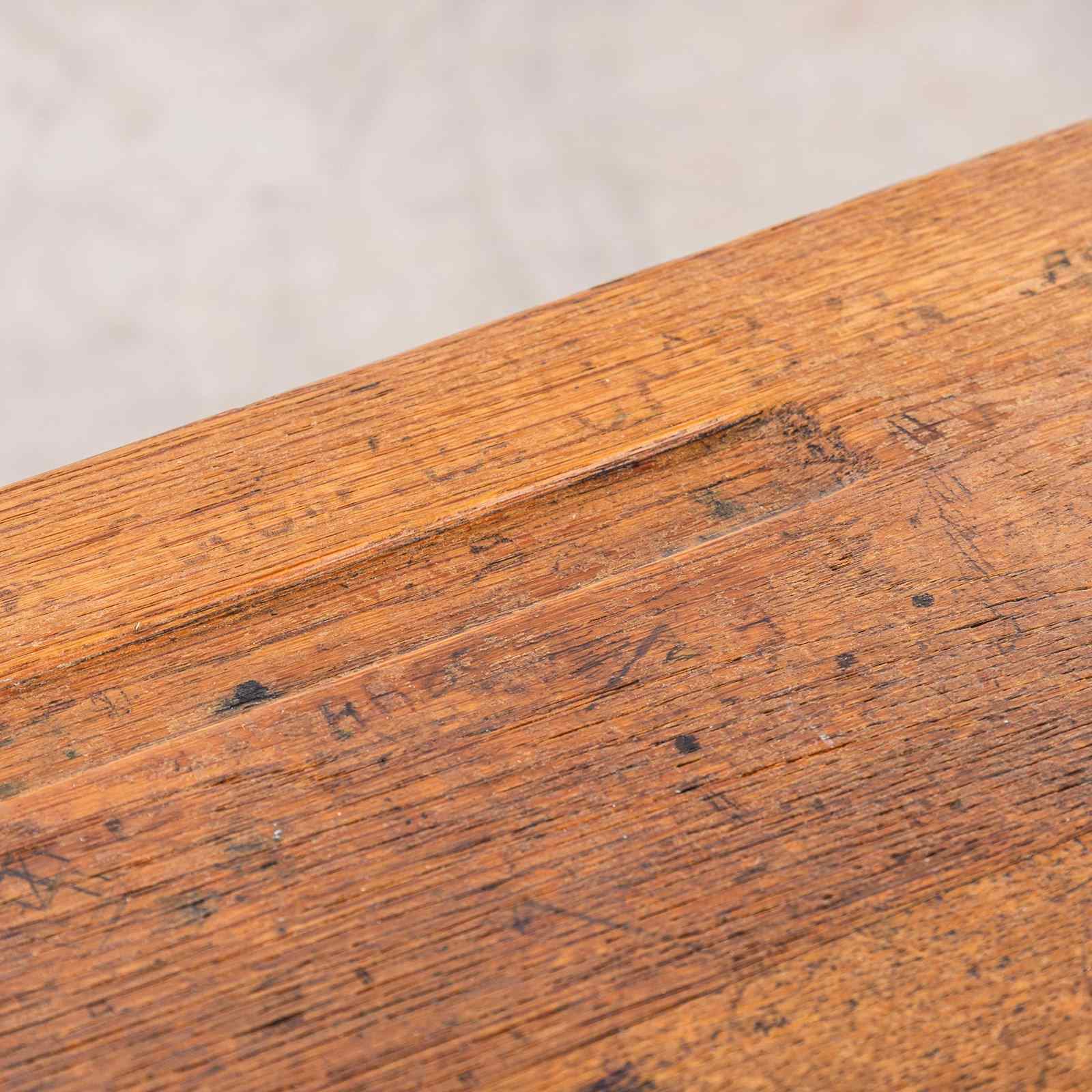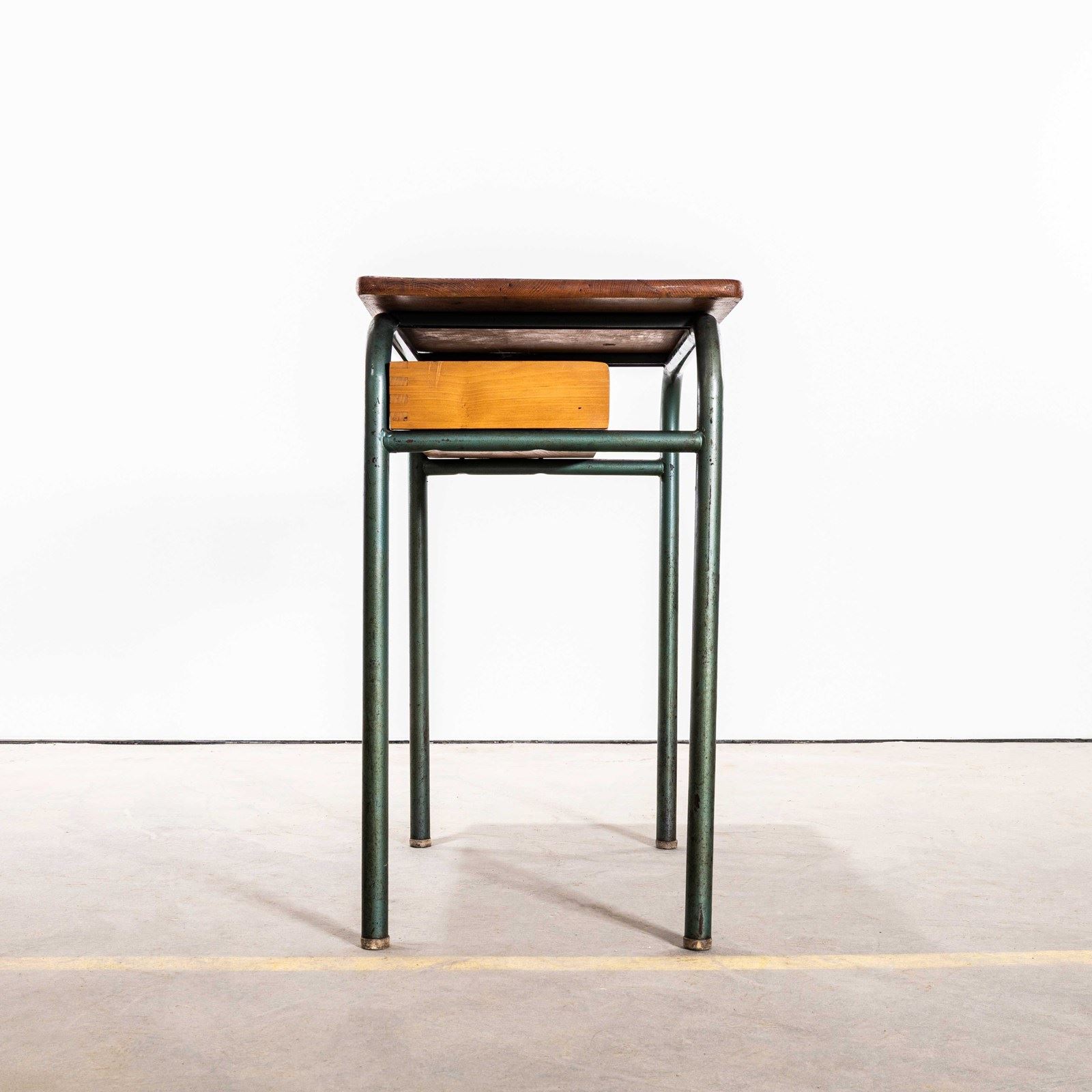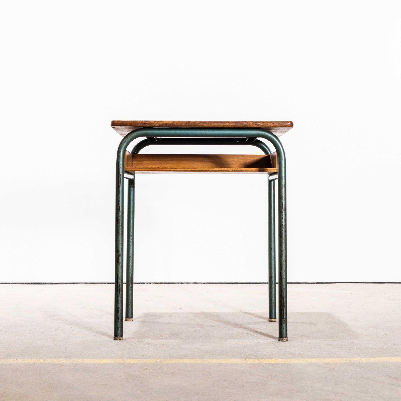 In 1947 Robert Muller and Gaston Cavaillon created the company that went on to develop arguably the most famous French school furniture brand Mullca. Sadly the company no longer exists but vintage chairs and desks can still be found. This desk is a classic sixties school desk, tubular metal legs in the classic Mullca aqua green with a well used beech top and practical second shelf storage.