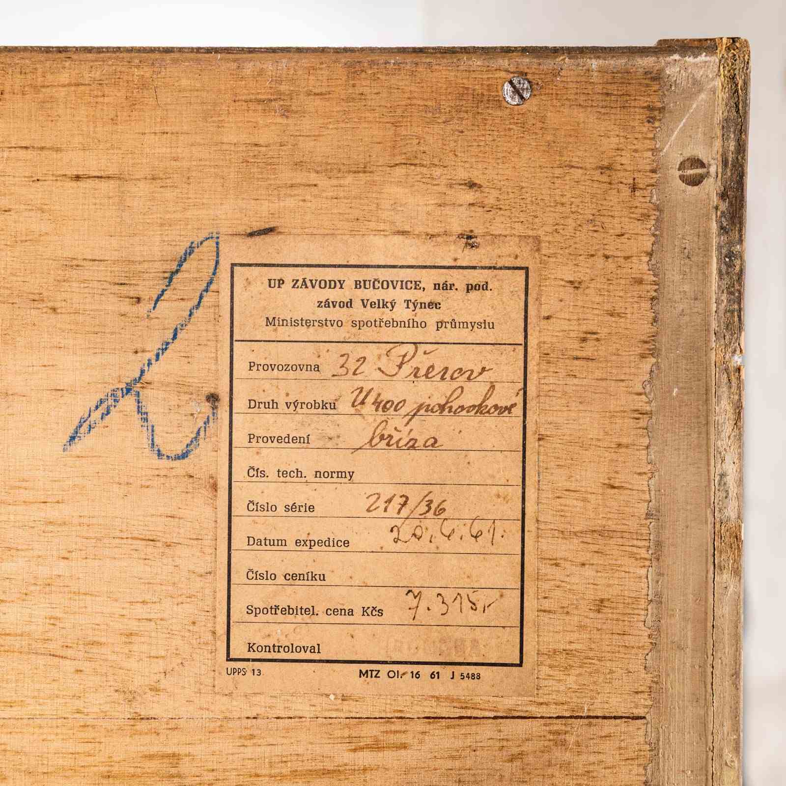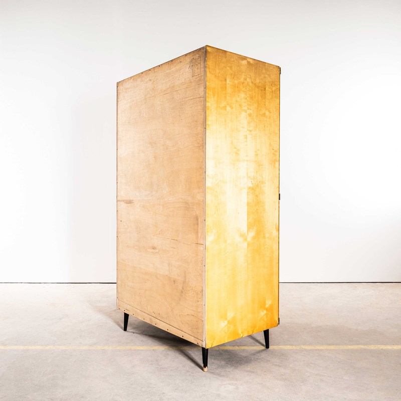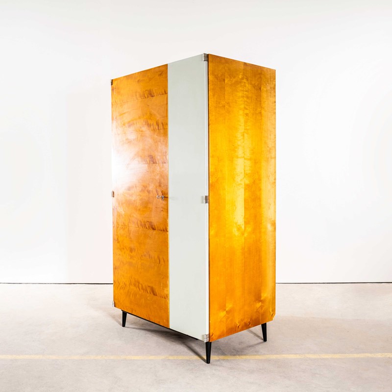 Superb practical piece of mid century storage by the Czech maker Up Zavody and designed by Frantisek Mezulanik. Czech was a large producer of high quality mid century furniture following the surge of modernism originated by the Bauhaus school. The main cabinet is made from well figured birch with a contrasting interior. The whole cabinet is beautifully made sitting on dark sapele pin legs. The interior features a full hanging rail space. Our workshop has gently restored the cabinet and it comes with the original key.