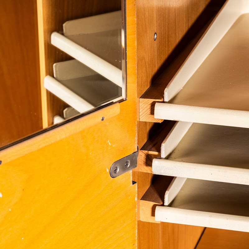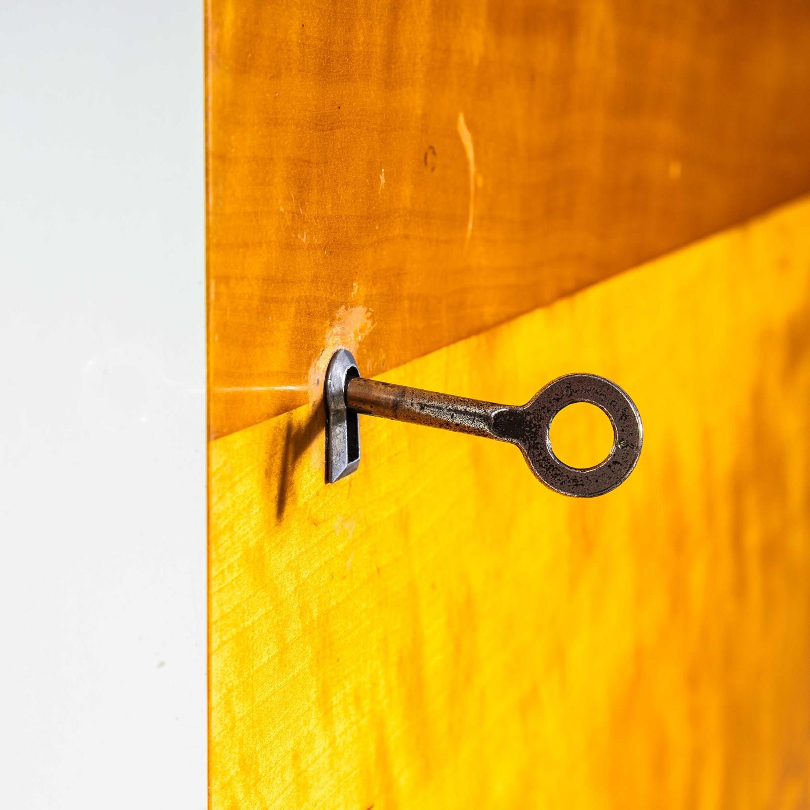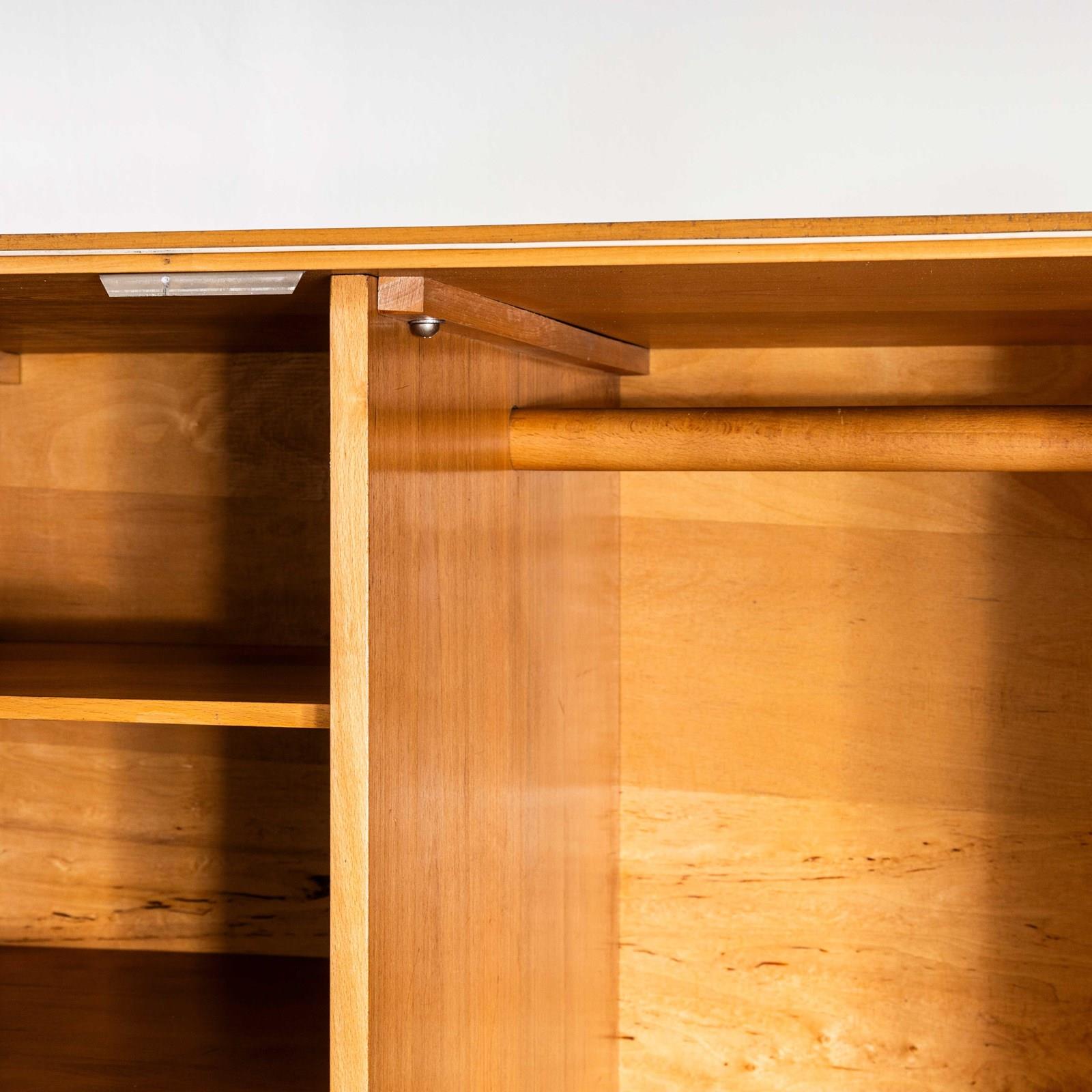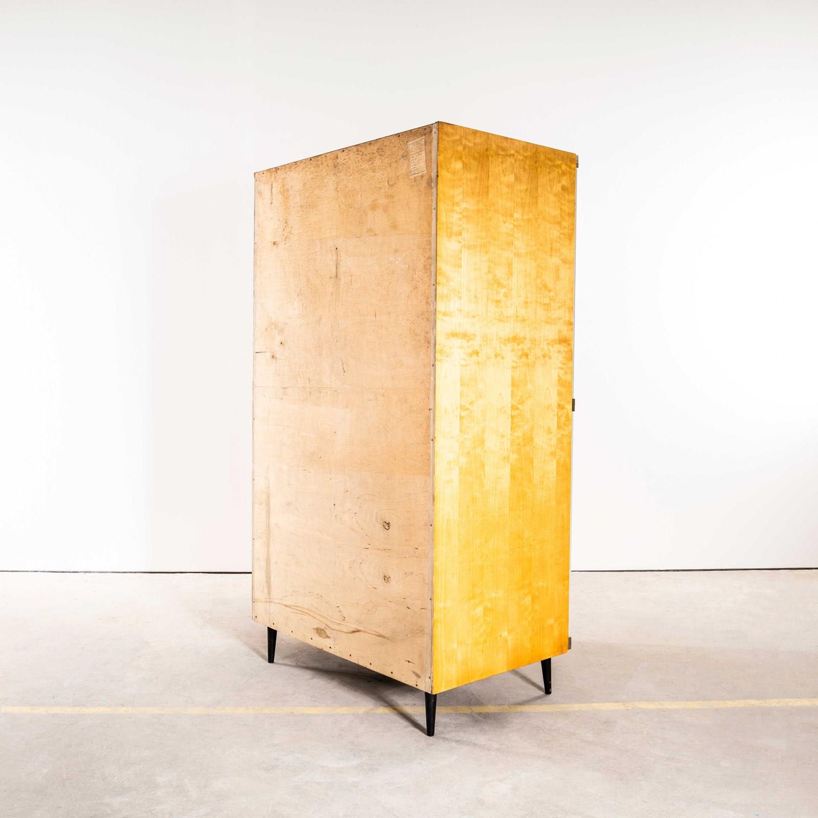 Superb practical piece of mid century storage by the Czech maker Up Zavody and designed by Frantisek Mezulanik. Czech was a large producer of high quality mid century furniture following the surge of modernism originated by the Bauhaus school. The main cabinet is made from well figured birch with a contrasting interior. The whole cabinet is beautifully made sitting on dark sapele pin legs. The interior features a full hanging rail space on the right and a number shelves on the left. It comes with a mirror on the inside lefthand door and an extra hanging rail on the inside of the righthand door. Our workshop has gently restored the cabinet so all drawers and doors run well.