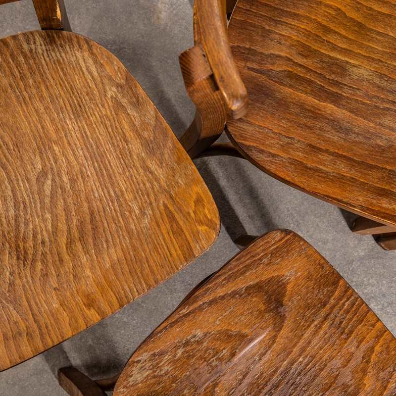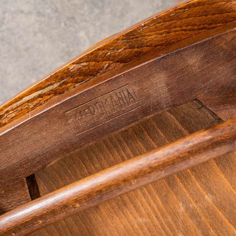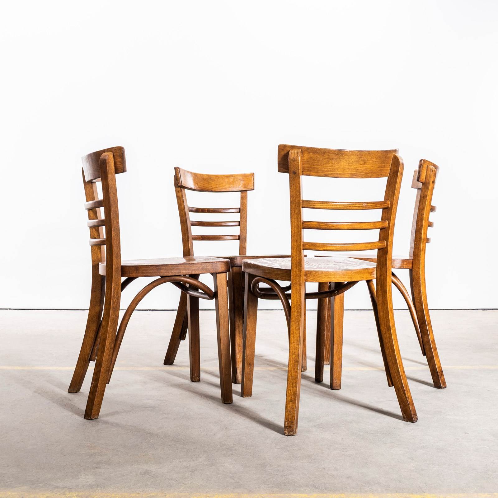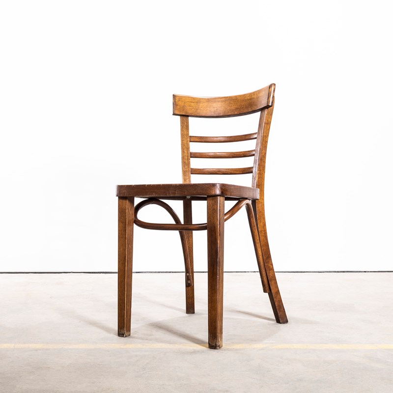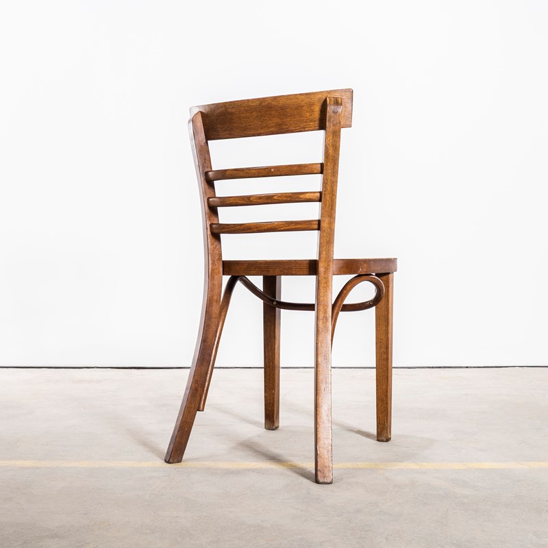 1960’s Ladderback Mid Oak Bentwood Dining Chairs. Good quality classic bentwood chairs with a typical 60’s deep dark oak colour and later ladder back design. The chairs were hand made in Romania using solid steam bent beech. The leg support is a single piece of wood beautifully curved and designed to bring elegance to the chair. They are a heavy weight robust chair with a good wear and age.