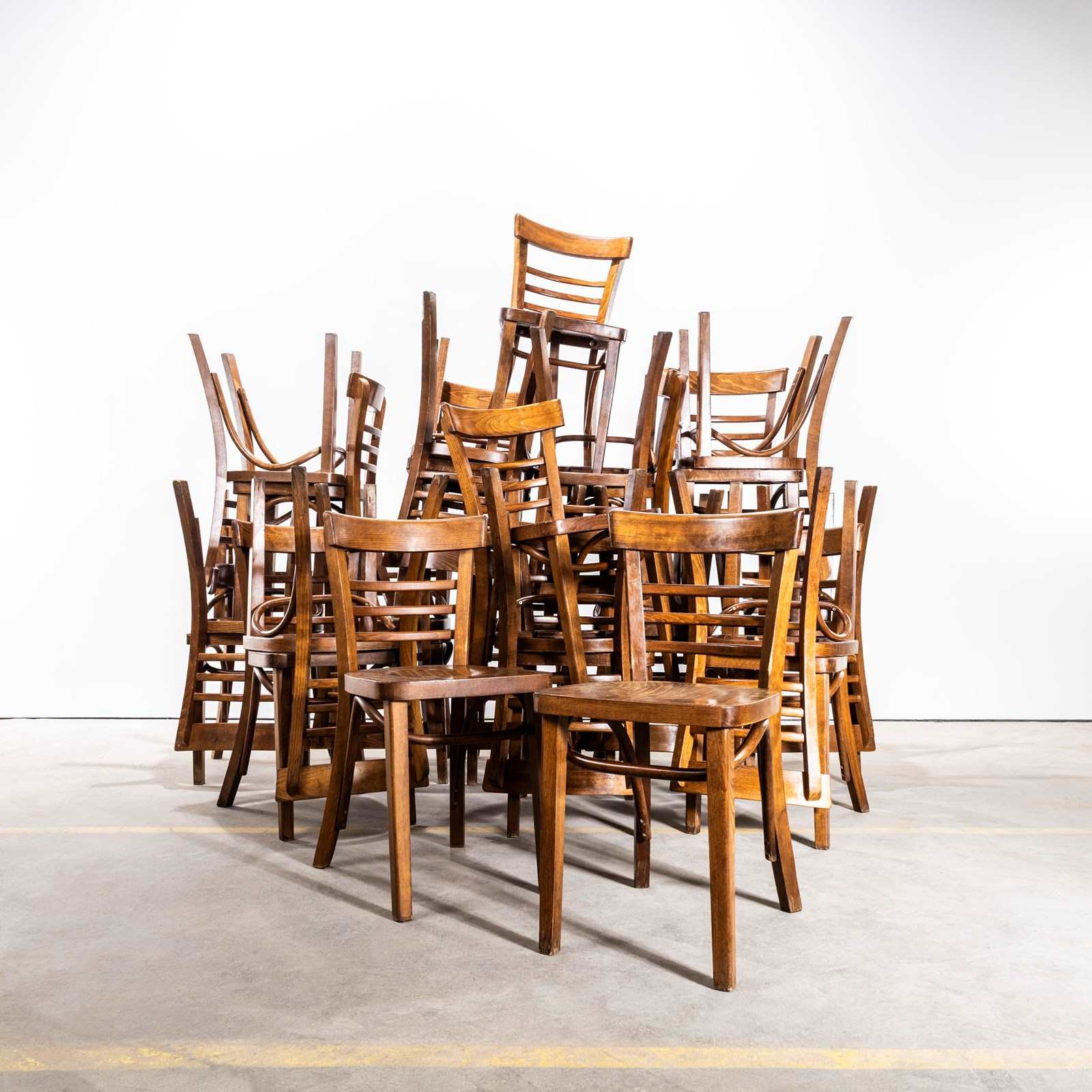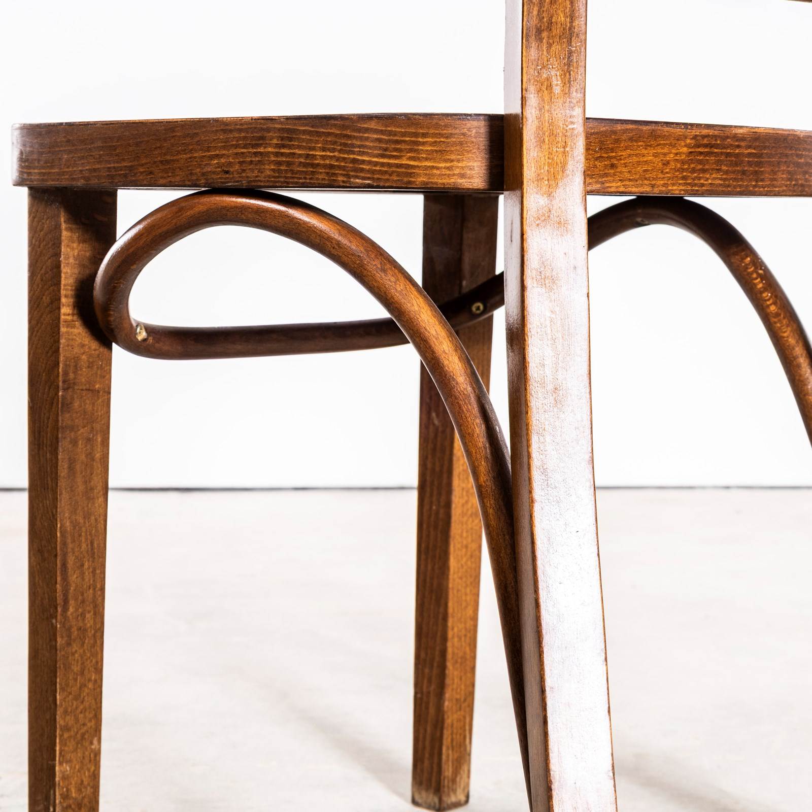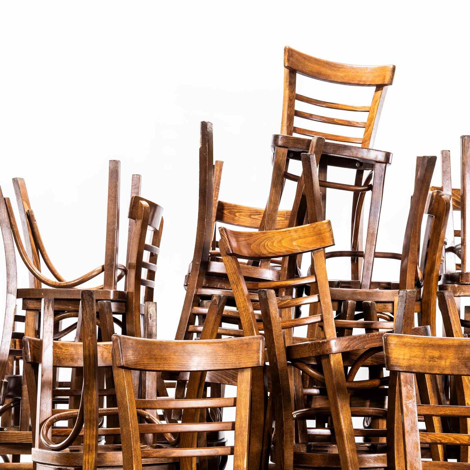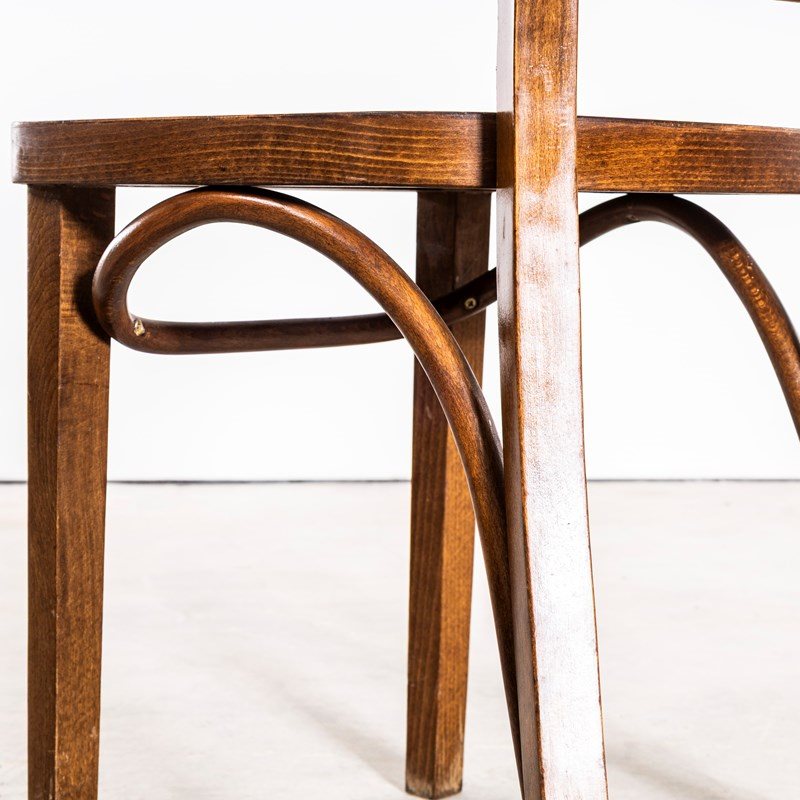 1960’s Ladderback Mid Oak Bentwood Dining Chairs. Good quality classic bentwood chairs with a typical 60’s deep dark oak colour and later ladder back design. The chairs were hand made in Romania using solid steam bent beech. The leg support is a single piece of wood beautifully curved and designed to bring elegance to the chair. They are a heavy weight robust chair with a good wear and age.