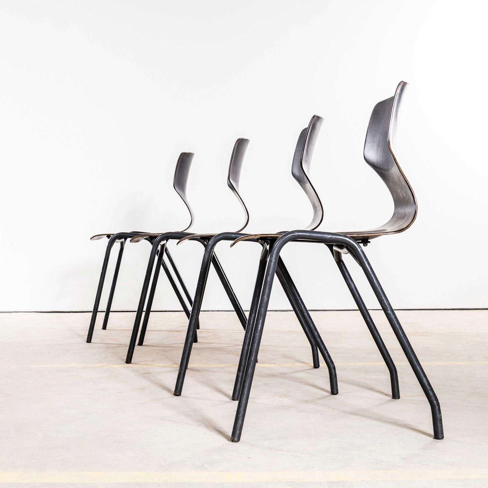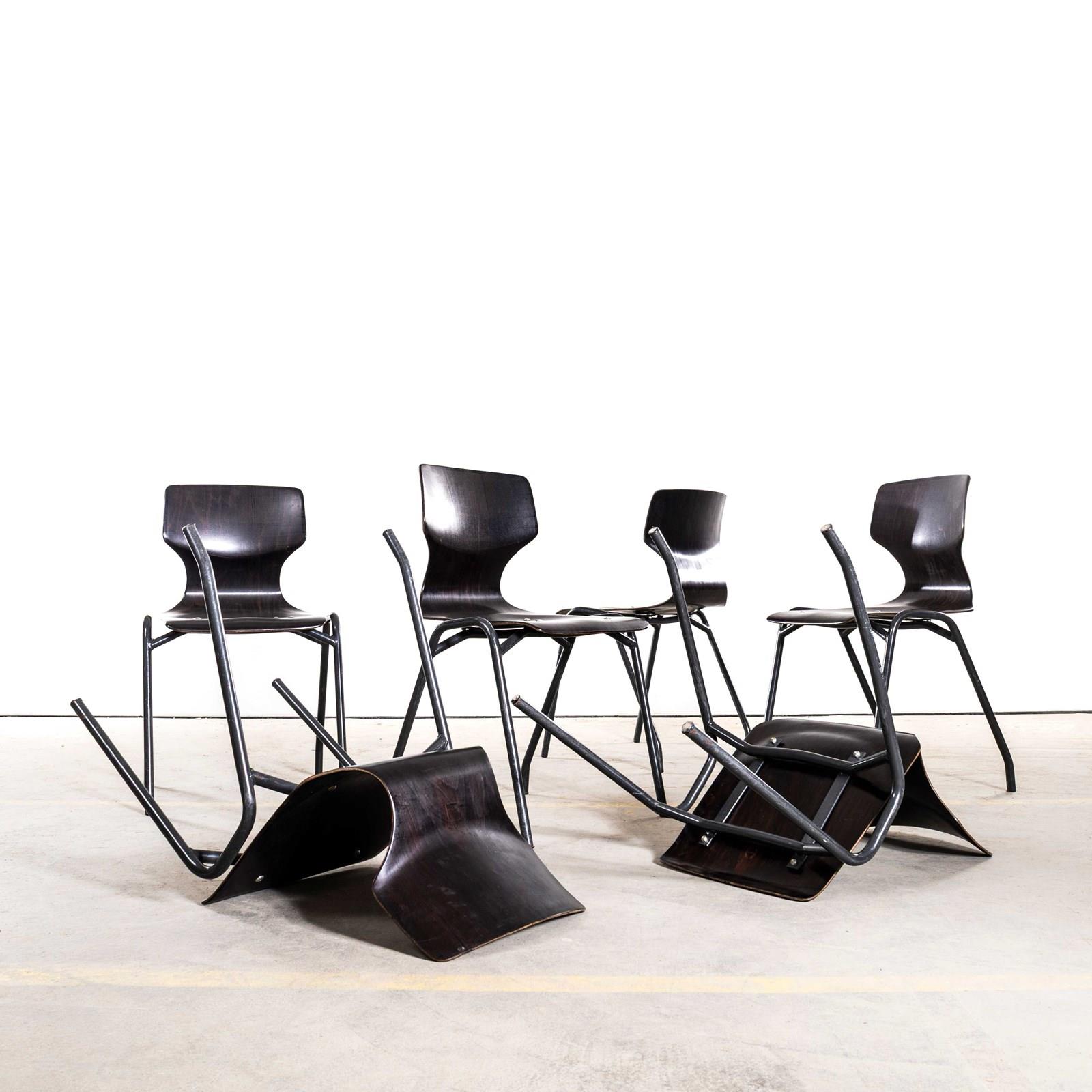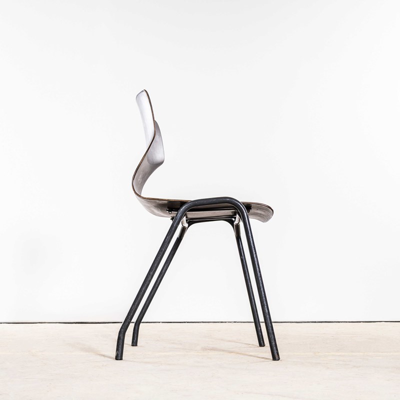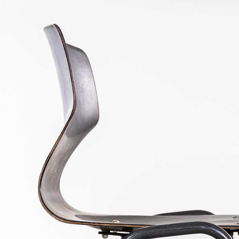 Pagholz is an interesting West German company that perfected the manufacturing technique to make laminated furniture with complex multiple shapes. Pagholz seats are used by the famous chair manufacturer Flototto. This chair was designed in the late 60’s by Jahre von Thur-Op. Hardwood laminated seats with unusual ebonised gun metal grey frames, the chairs are in excellent condition and are very comfortable. We service each chair individually before they leave our workshop and we deliver chairs of excellent quality.