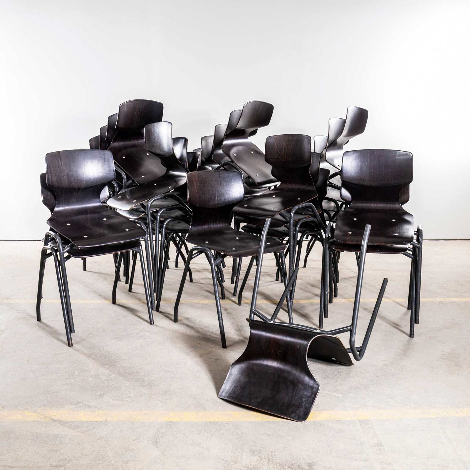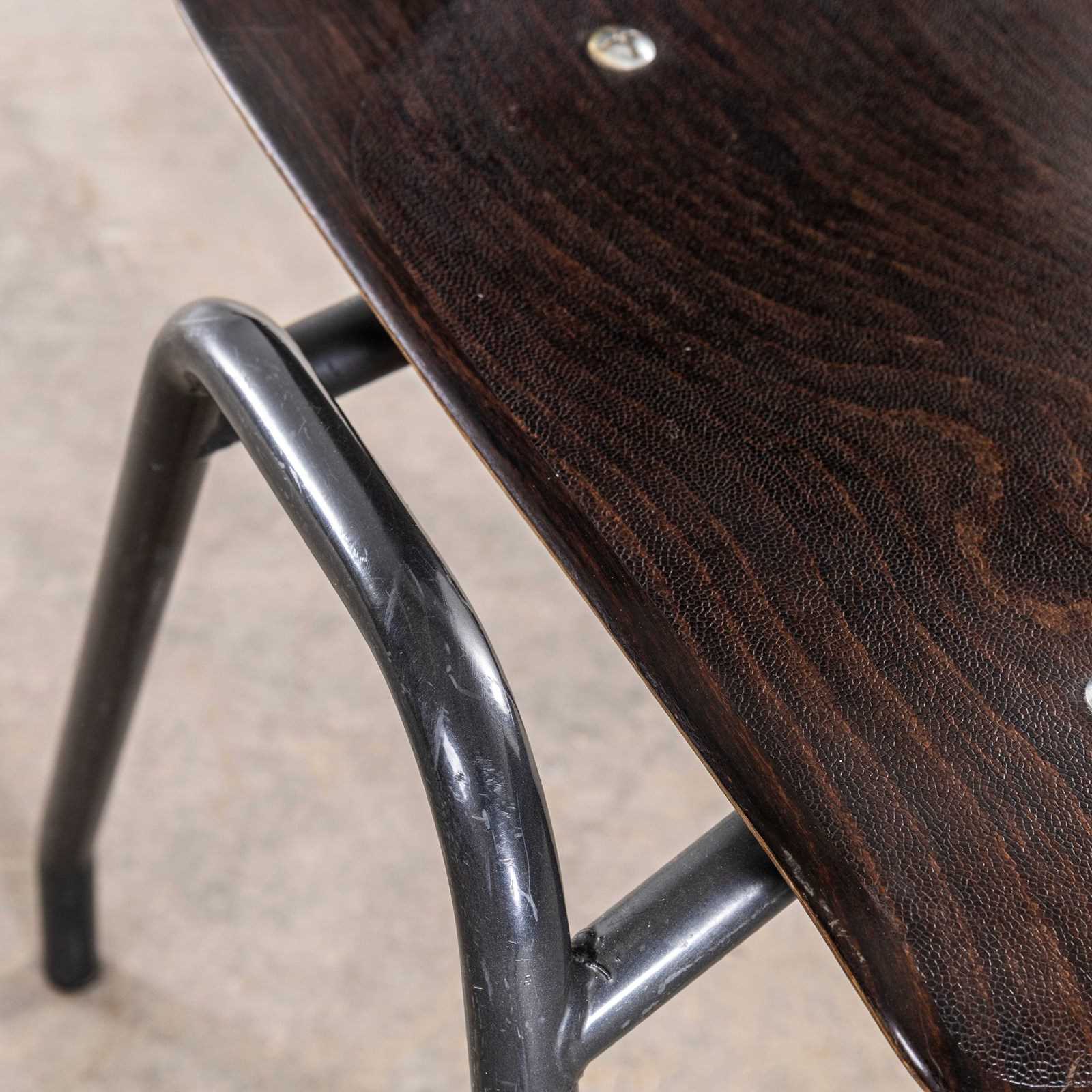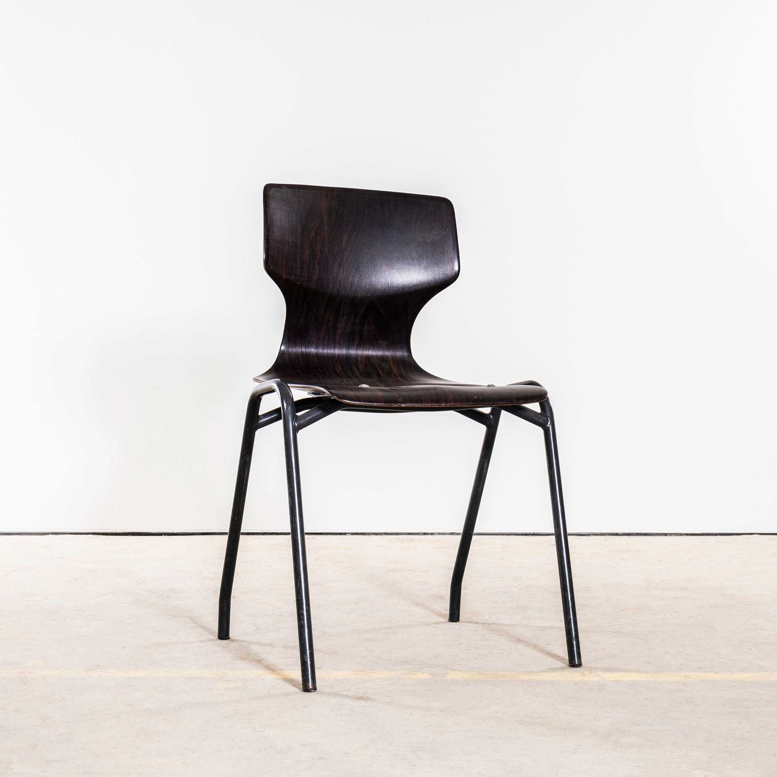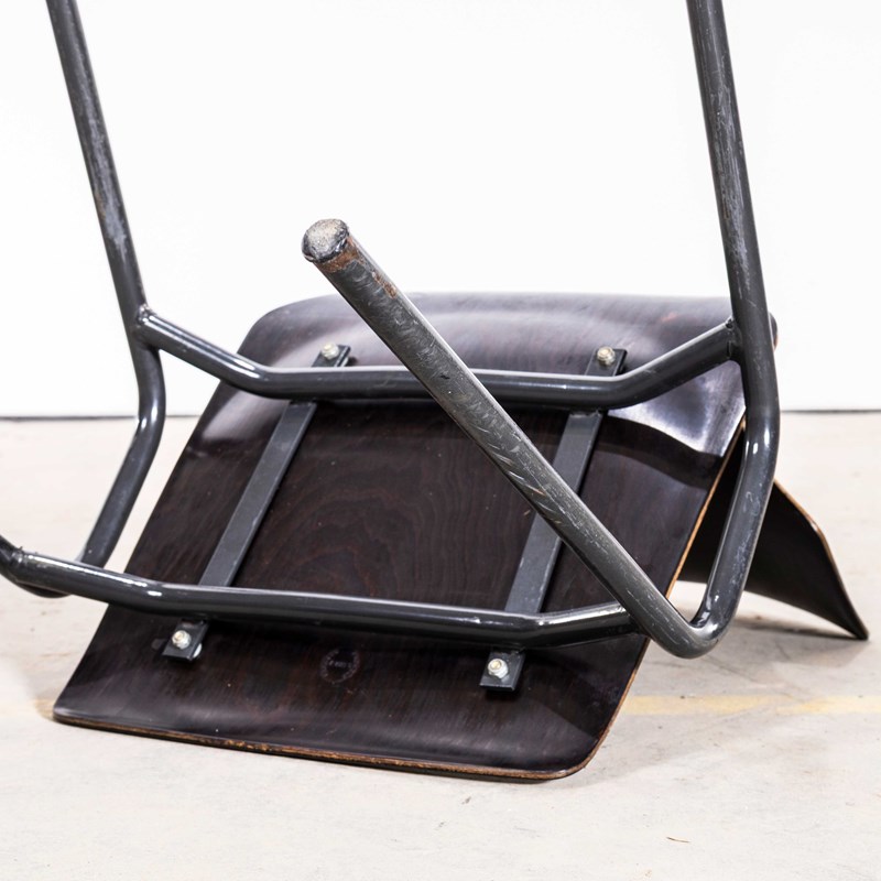 Pagholz is an interesting West German company that perfected the manufacturing technique to make laminated furniture with complex multiple shapes. Pagholz seats are used by the famous chair manufacturer Flototto. This chair was designed in the late 60’s by Jahre von Thur-Op. Hardwood laminated seats with unusual ebonised gun metal grey frames, the chairs are in excellent condition and are very comfortable. We service each chair individually before they leave our workshop and we deliver chairs of excellent quality.