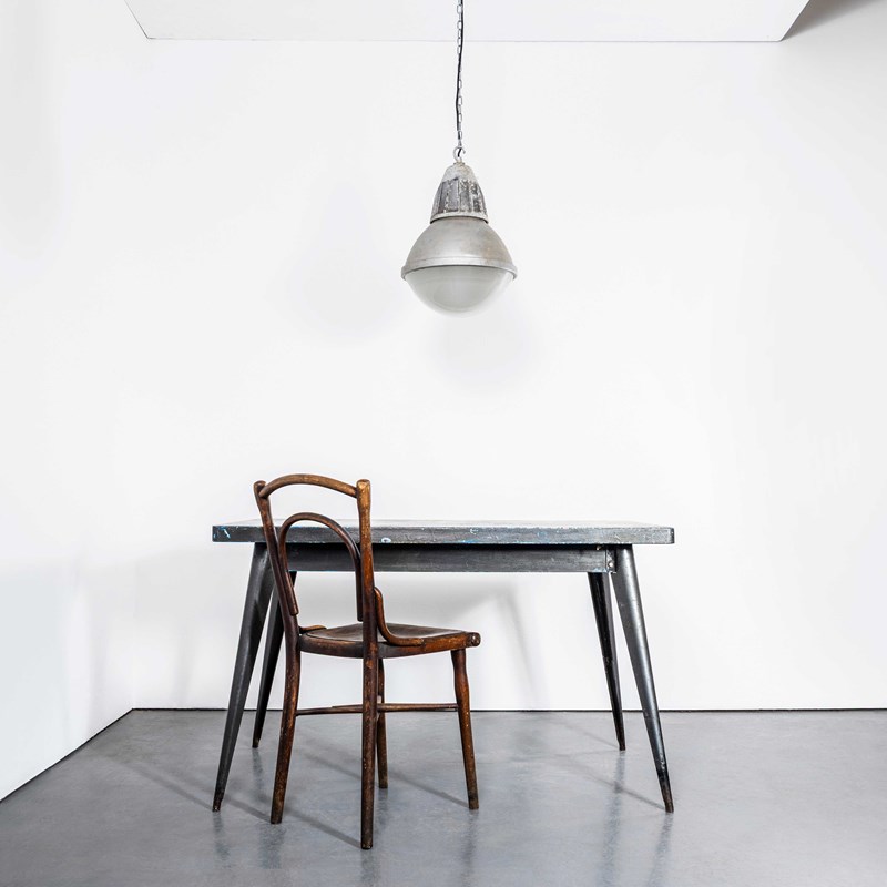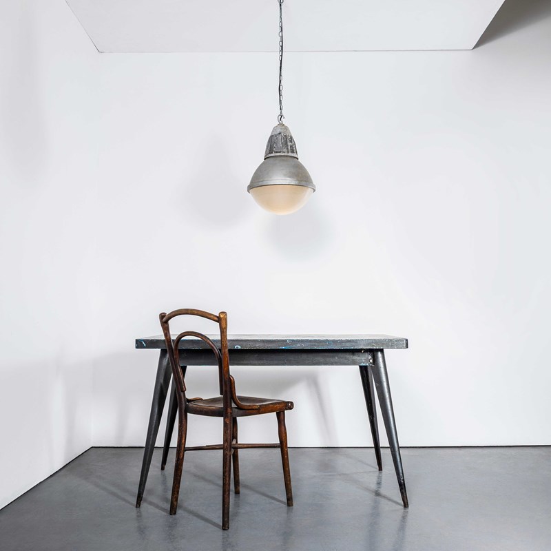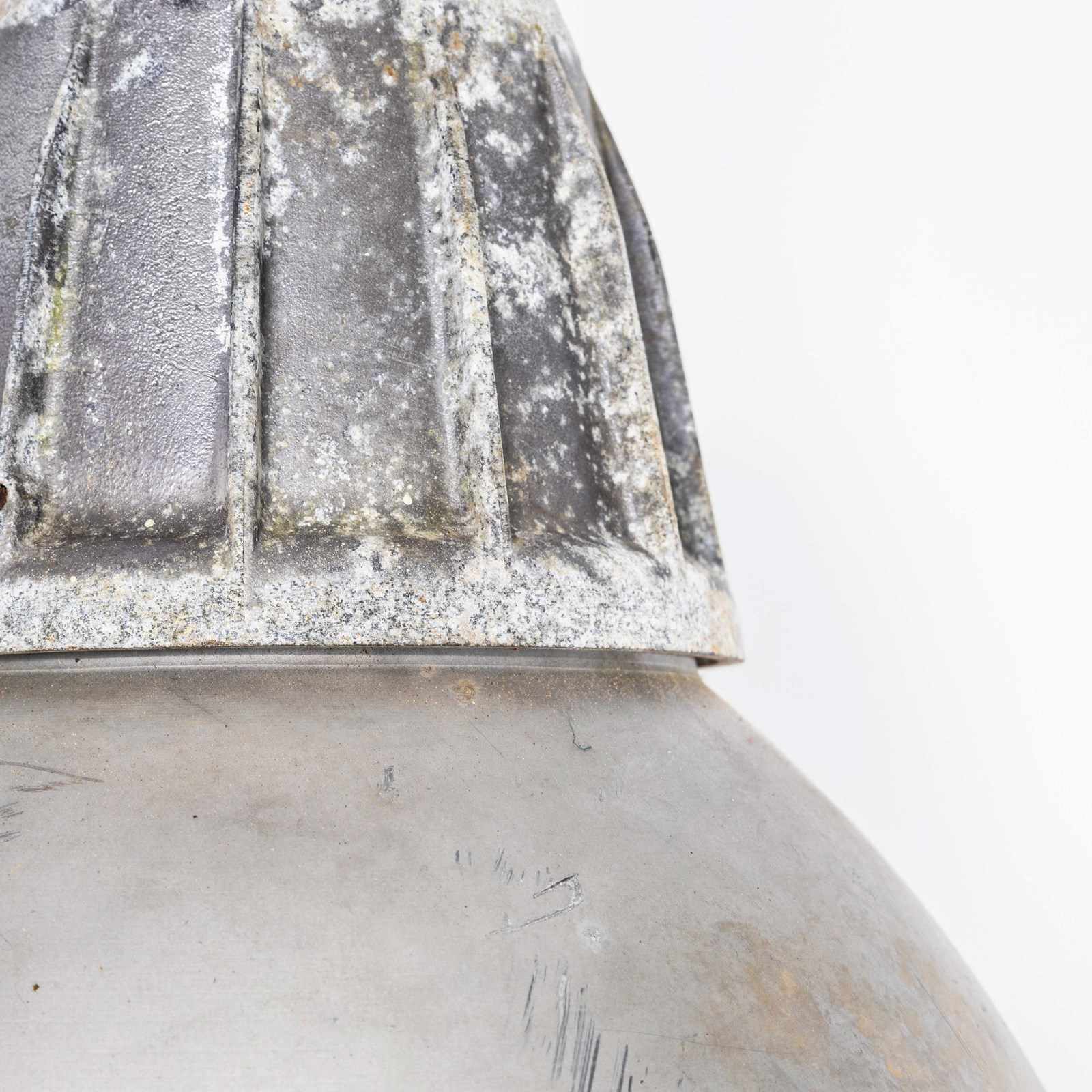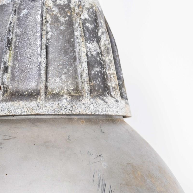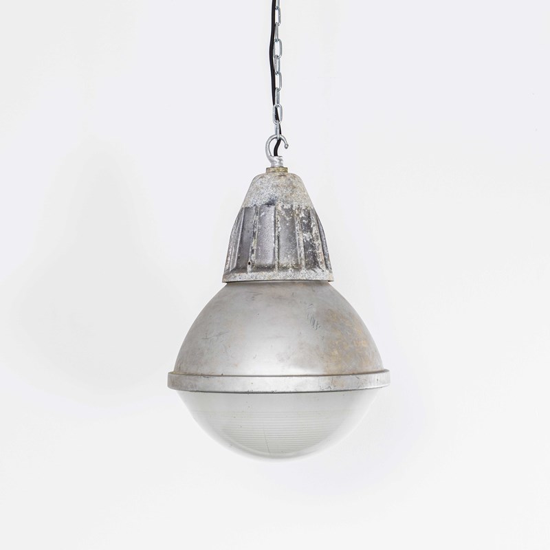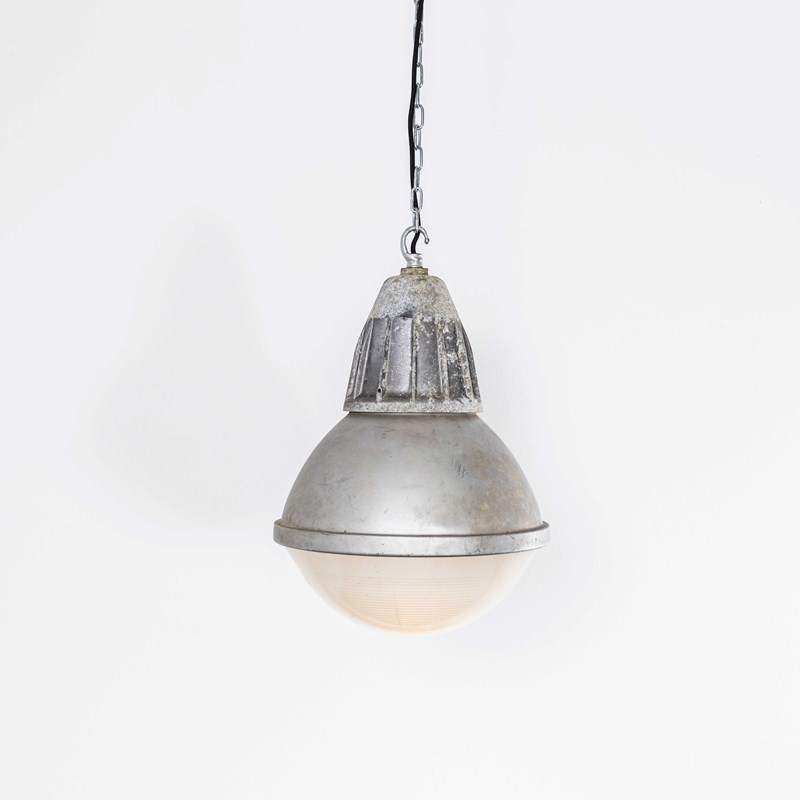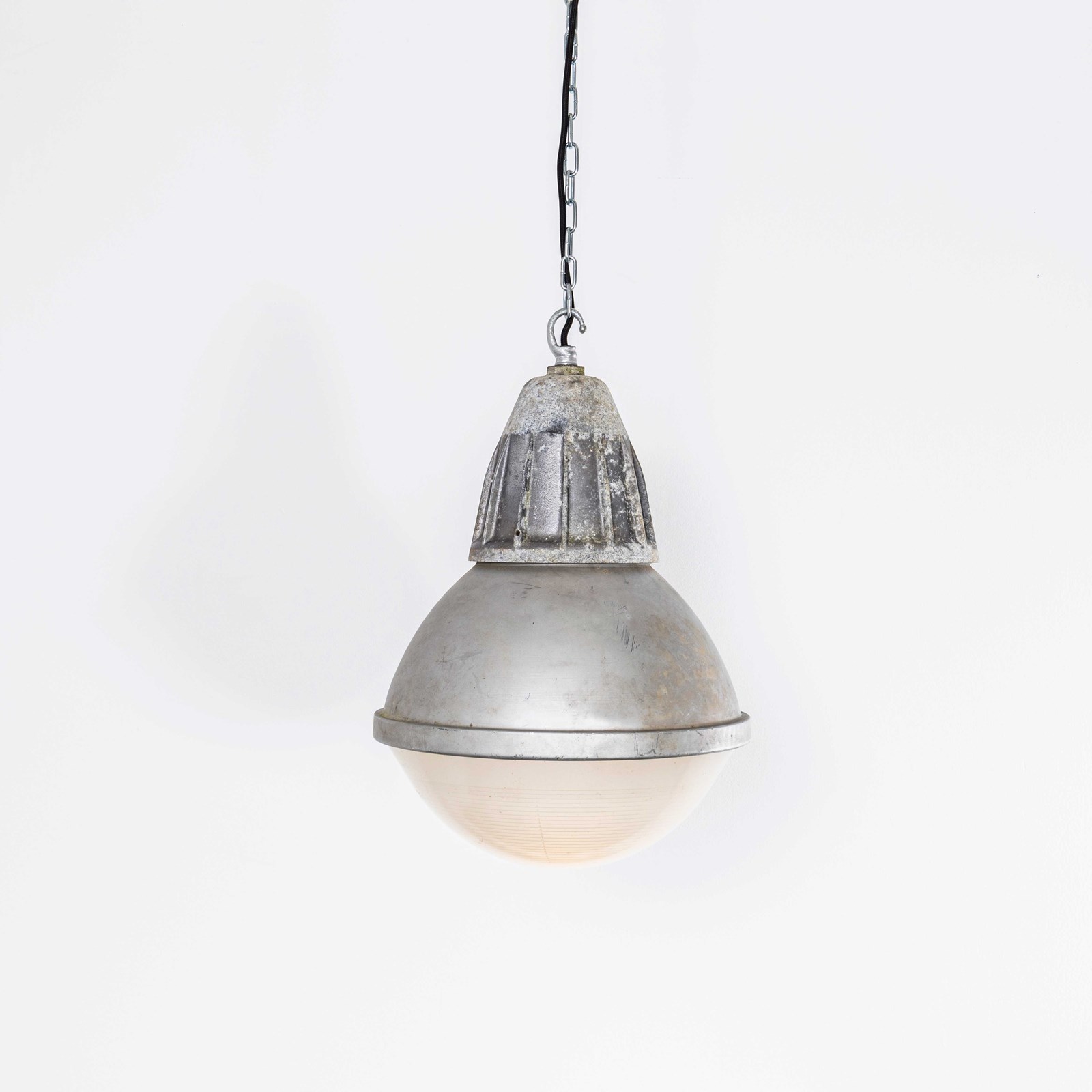 Holophane was founded in France in the late 19th Century and they are famous for their inventing and perfecting borosilicate glass reflectors often with intricate cast glass patterns which give a diffused and beautiful light. These lamps are large scale factory light produced by Holophane and increasingly hard to find. The lamp body is cast aluminium, the light source is a huge heavy Holophane glass globe shade. Each lamp has been cleaned and restored and all electrical components have been removed and replaced with modern European CE standard components to BS EN 60598. Each lamp is individually tested and labelled to BS EN 60598. INCLUDED: Each lamp comes completely wired and ready to install including; 2 metres of wire for hanging the lamps, 2 metres of black fabric covered electrical cable and a ceiling anchor point as shown. Each lamp is fitted with a standard E27 threaded lamp holder for which a wide range of modern and vintage style filament bulbs are widely available. We do not currently sell bulbs and recommend LED bulbs 6W maximum. We can also supply more than 2 metres of hanging cable/wire/chain etc. as required, please contact us separately to discuss. We are specialists in refurbishment of vintage lighting, please contact us with any questions regarding purchase or installation. Please note this is a heavy lamp approximately 15kg and secure hanging points must be used. The lamp is currently wired and fitted for UK and EU compliance. The lamp can be wired for compliance in the US or any global market. Listing is for one lamp.
