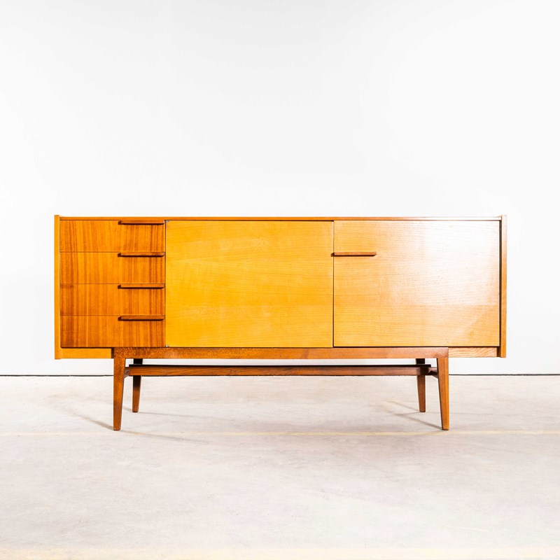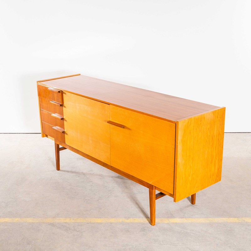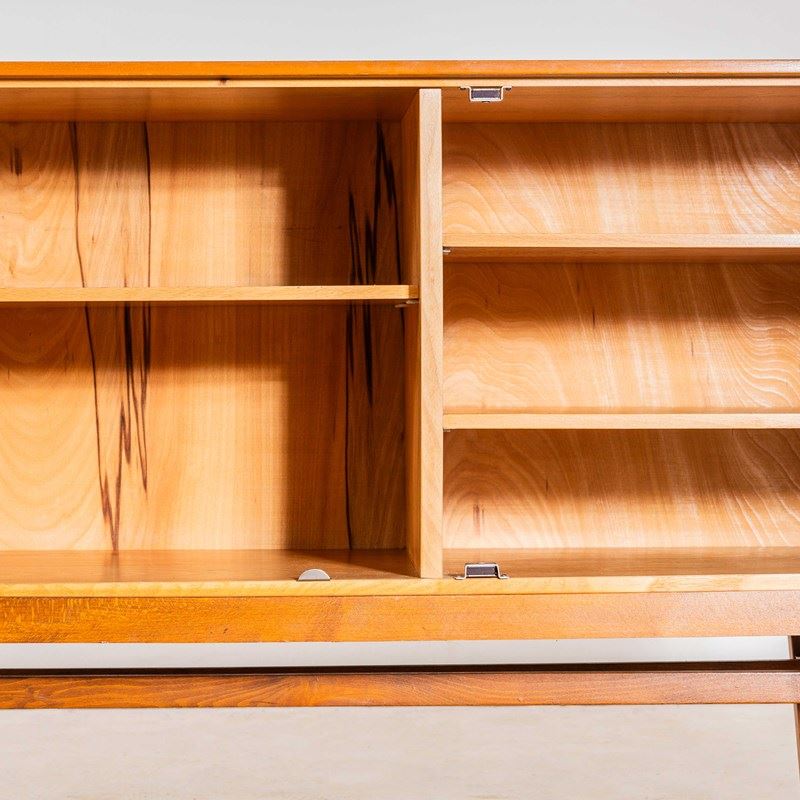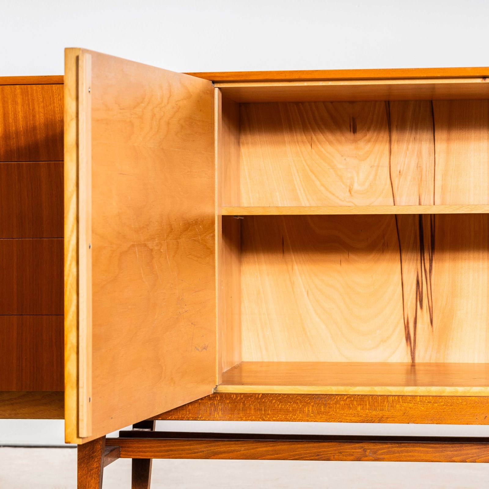 Superb practical piece of mid century storage by the Czech maker Up Zavody and designed by Frantisek Mezulanik. Czech was a large producer of high quality mid century furniture following the surge of modernism originated by the Bauhaus school. The left side of the cabinet features four small drawers, to the right sits a good sized cabinet with a central divide (Internal dimensions 41L x 56/60W x 43H all CM with adjustable shelves as shown). The whole cabinet is beautifully made in a mix of Sapele timber with birch contrasting. The cabinet sits on a beech base. Our workshop has gently restored the cabinet so all drawers and doors run well and the cabinet is in exceptional original condition.