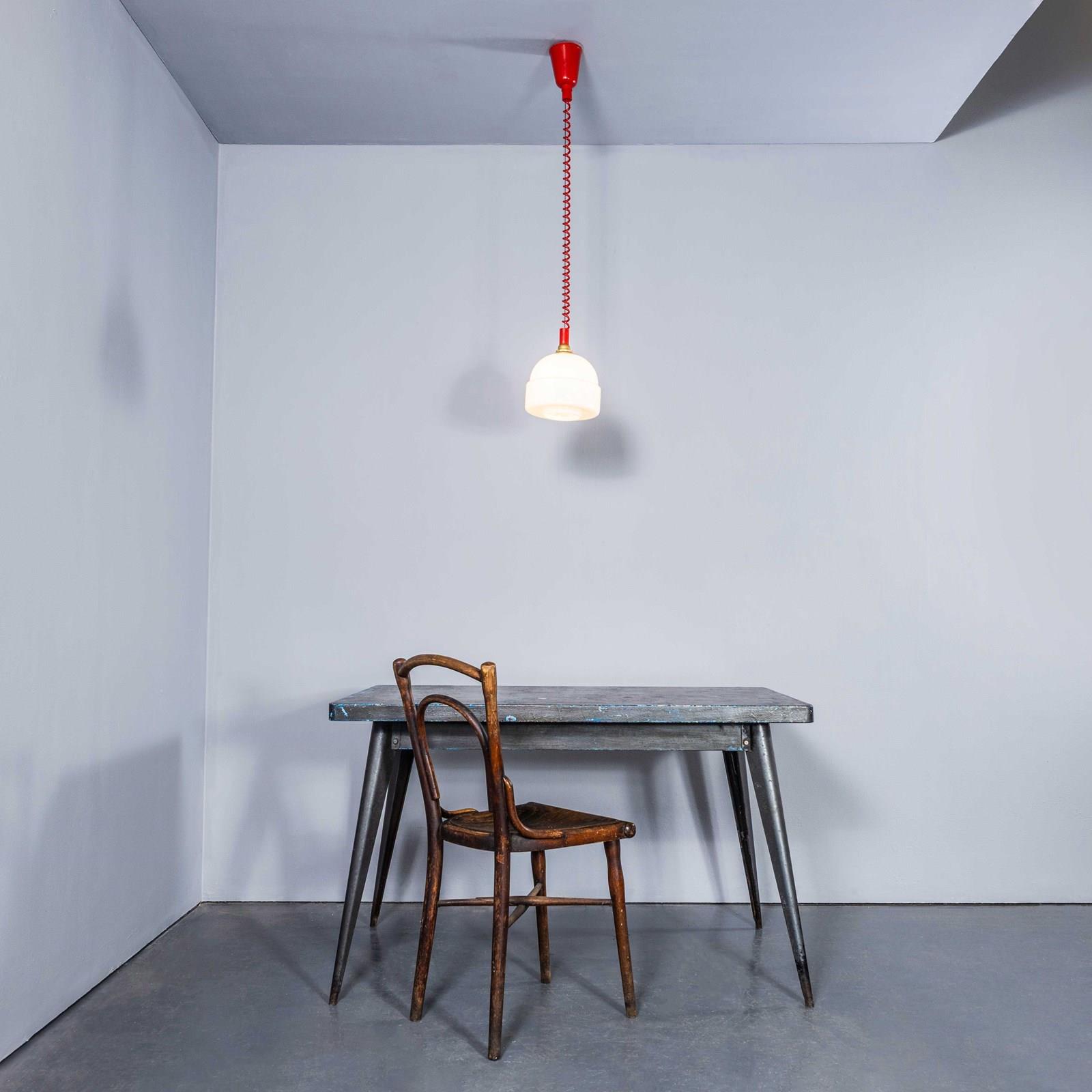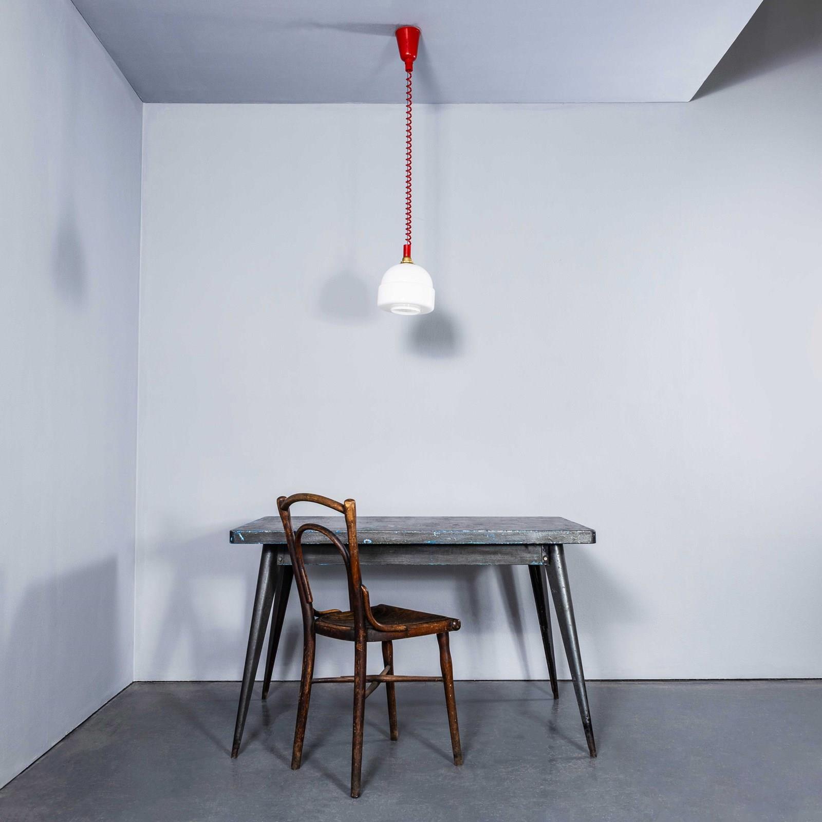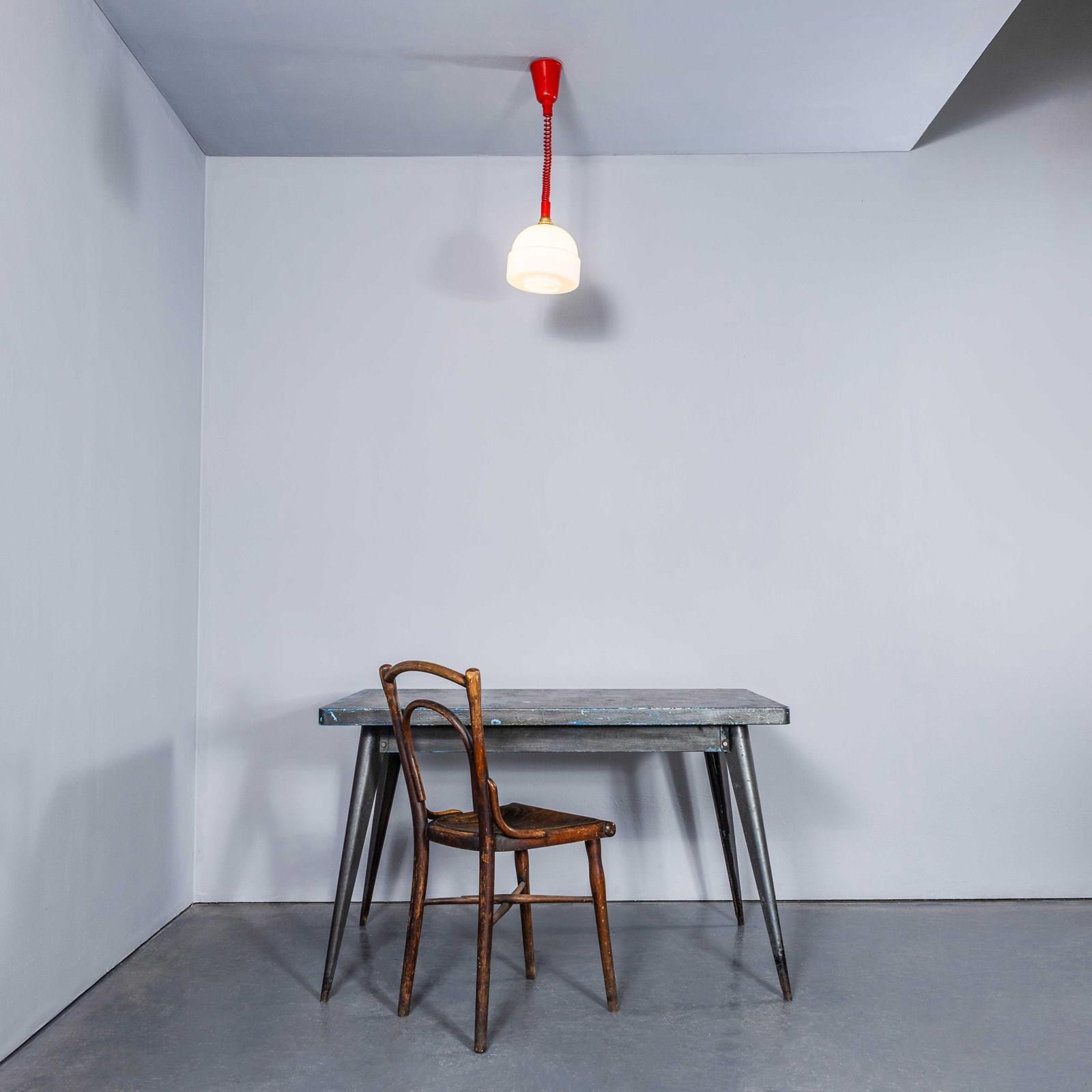 We recently cleared a lamp factory in the Czech Republic and we found these exceptional original new old stock bobble hat opaline lamps complete with the original height adjustable cable and mechanism. Simply pull the lamps down and the mechanism will lock them at the selected height, to raise the lamps pull them down to release the tension and they can be adjusted again. The gallery tops and ceiling cup and cable are as new. Each lamp has been cleaned and restored. Each lamp is individually tested and labelled. INCLUDED: Each lamp comes completely wired and ready to install as shown. The lamp is fitted with a standard E27 threaded lamp holder for which a wide range of modern and vintage style filament bulbs are widely available. We do not currently sell bulbs and recommend LED bulbs 6W maximum. We are specialists in refurbishment of vintage lighting, please contact us with any questions regarding purchase or installation. The lamp is currently wired and fitted for UK and EU compliance. Due to the original nature of the mechanism the lamp cannot be rewired for non EU markets. Listing is for one lamp.