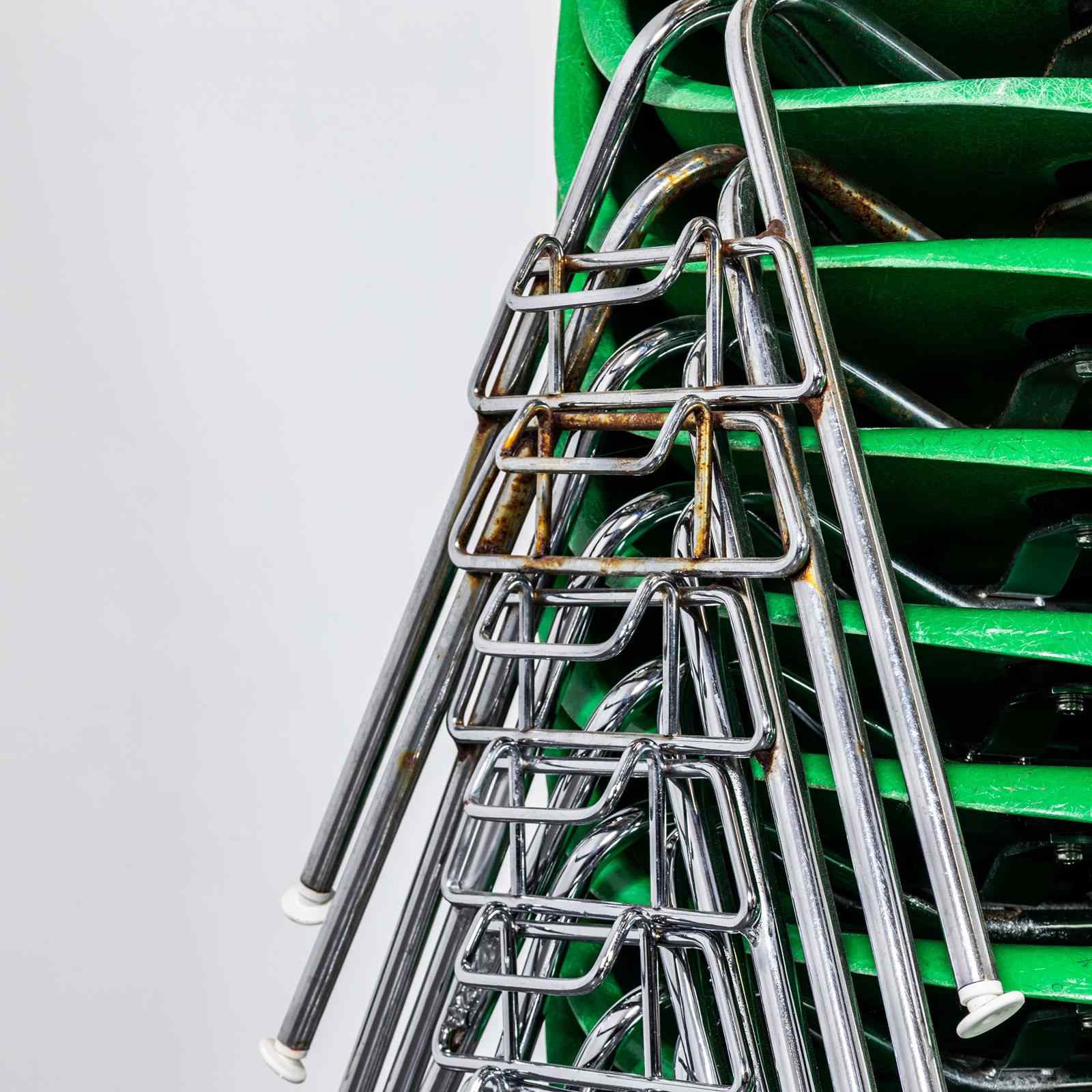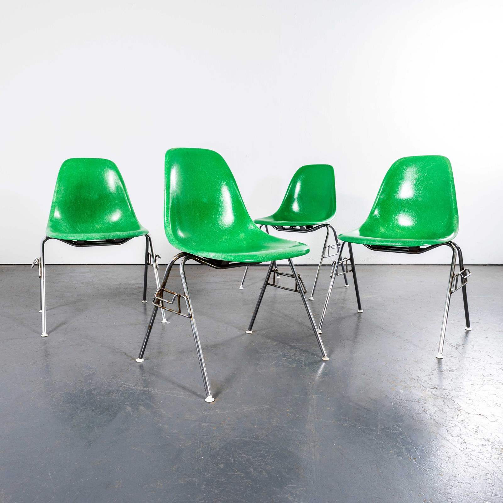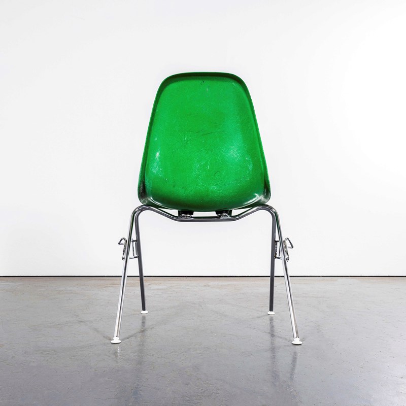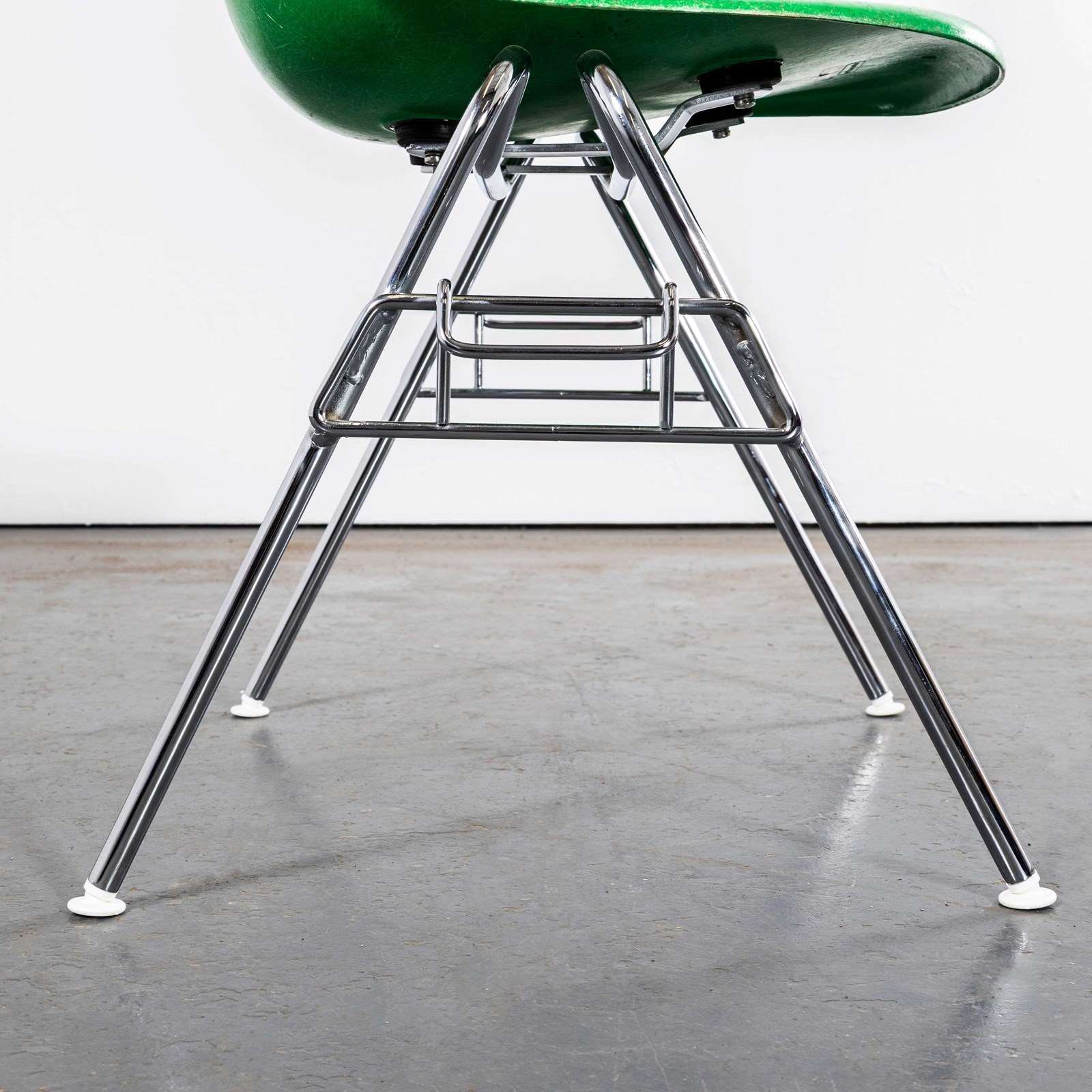 The iconic DSS side chair designed by Eames and produced in a wonderful vivid green. These are 100% original Herman Miller fiberglass shells all with original rubber mounts in good condition and Hermann Miller embossed branding in the shells. The fiberglass shells are in excellent condition, the chrome bases are in perfect structural condition although please note the chrome has, as expected, deteriorated in some areas as photographed. Any damaged or missing swivel feet have have been replaced with original Vitra swivelling feet as per the original design. Our workshop has inspected the chairs, cleaned and gently buffed the fiberglass and gently cleaned the chrome bases. Exceptionally rare chairs, these came from a community hall in the middle of Wales where they had been stored for over twenty chairs, they were originally supplied to a local hospital and donated to the hall. The DSS denotes – Dining Side Stacking. Often used in public settings the chairs are very practical, they can be stacked 8/10 high and also easily linked to form groupings in rows.