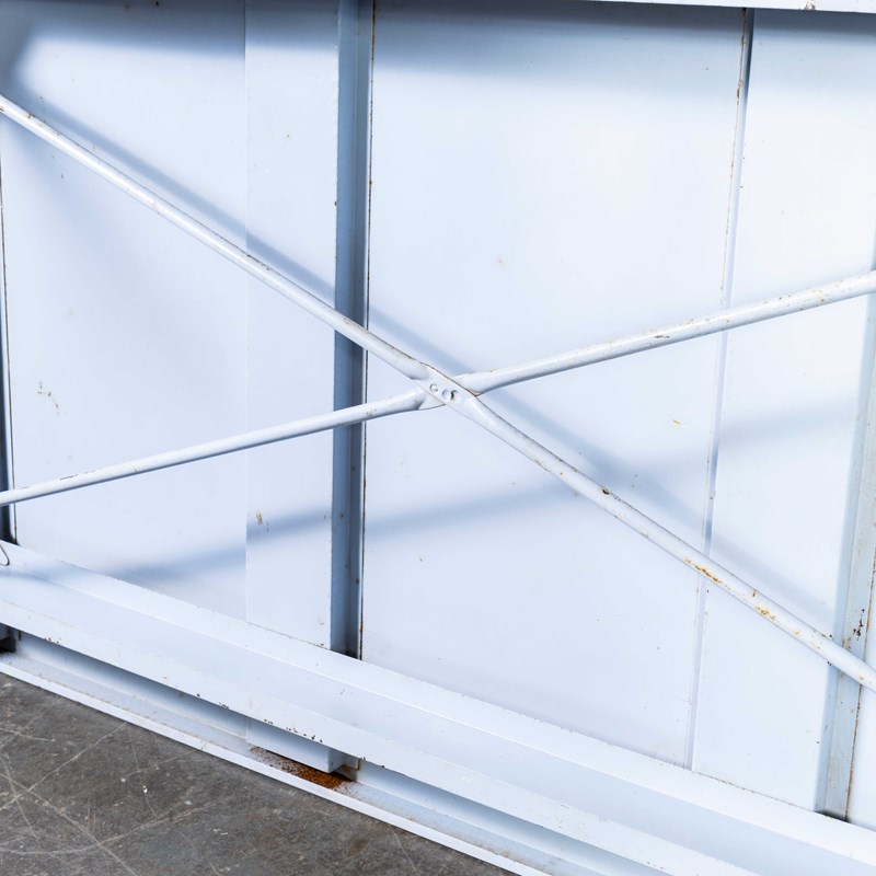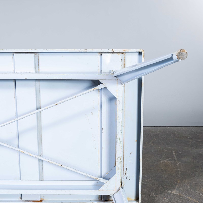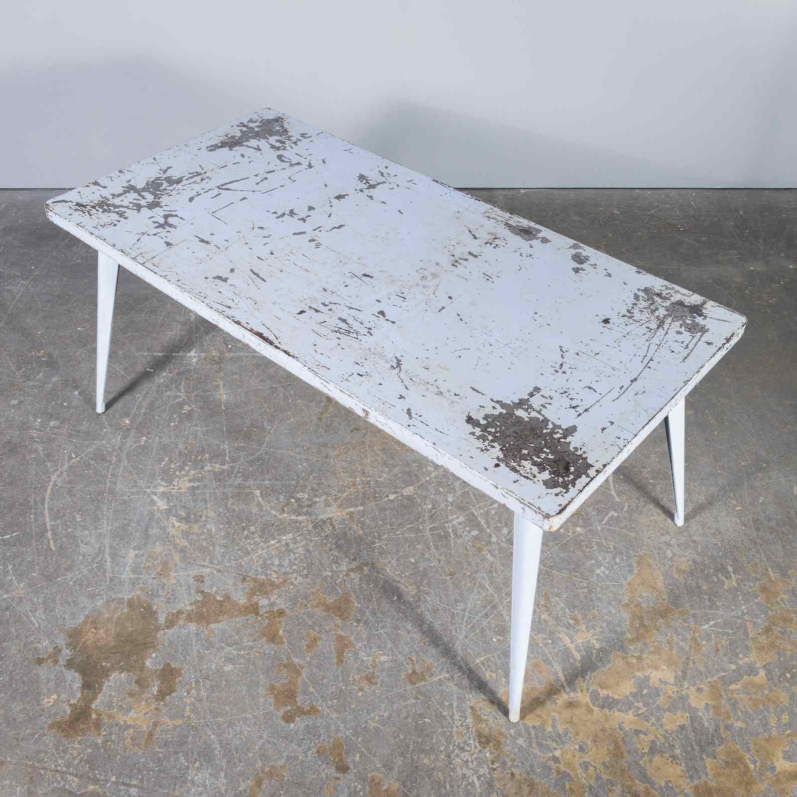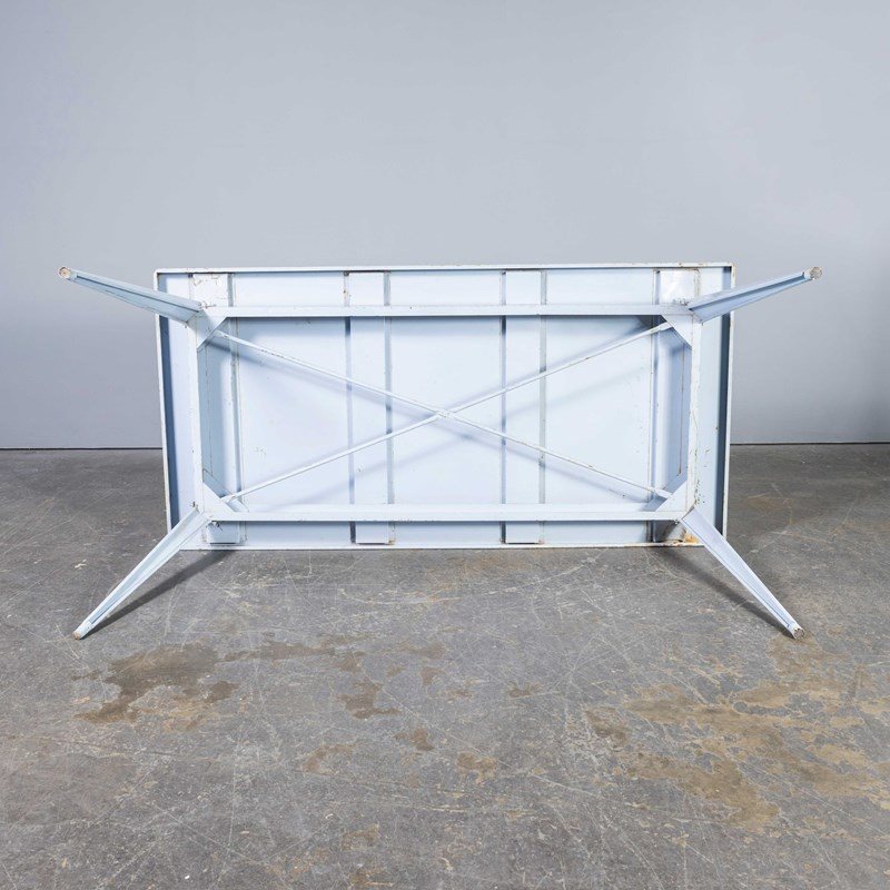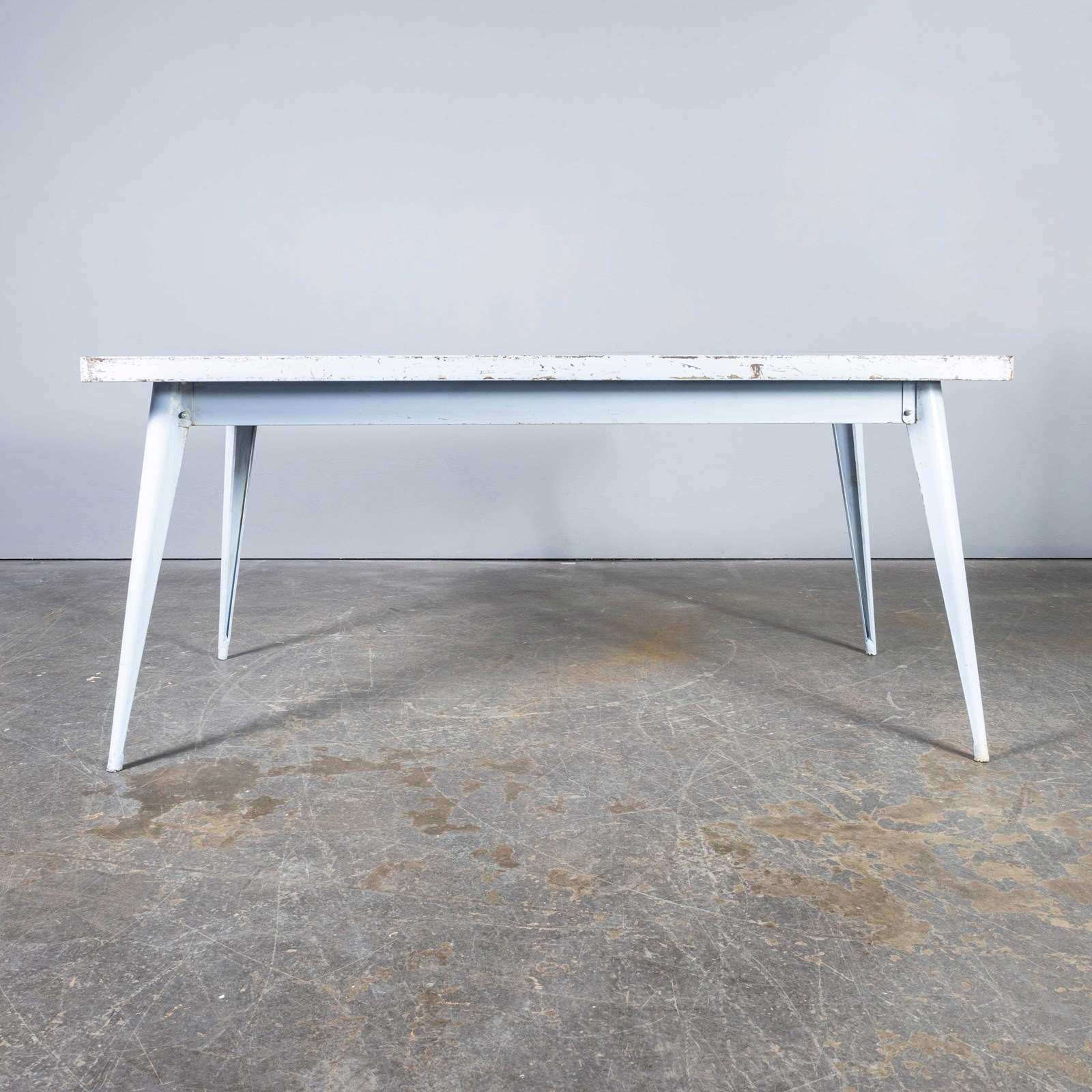 1960's Original French T55 Tolix Rectangular Dining Table - 160cm (Model 1330). Tolix is one of our all time favourite companies. In 1907 Frenchman Xavier Pauchard discovered that he could protect sheet metal from rusting by dipping it in molten zinc (galvanisation) and a few years later he set up his factory producing steel furniture. Tolix was the creator and founder of perhaps the most iconic café chair of all time, the Tolix model A, designed in 1934. Tolix used their metal working skill to also produce exquisitely designed but practical café/dining tables to partner their chairs. The T55 is the iconic Tolix table and this is an unusual and practical 160cm size. This table comes in a beautiful soft sky blue paint with hints of overpainting, giving the most exceptional character. Knee height: 62cm.