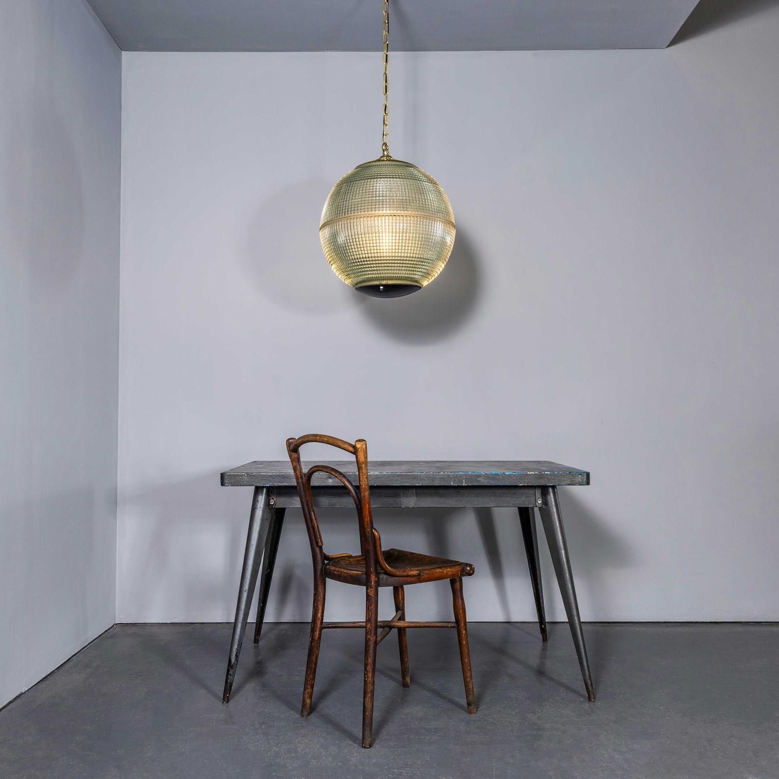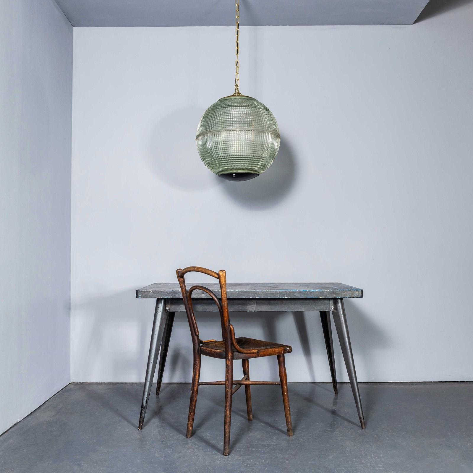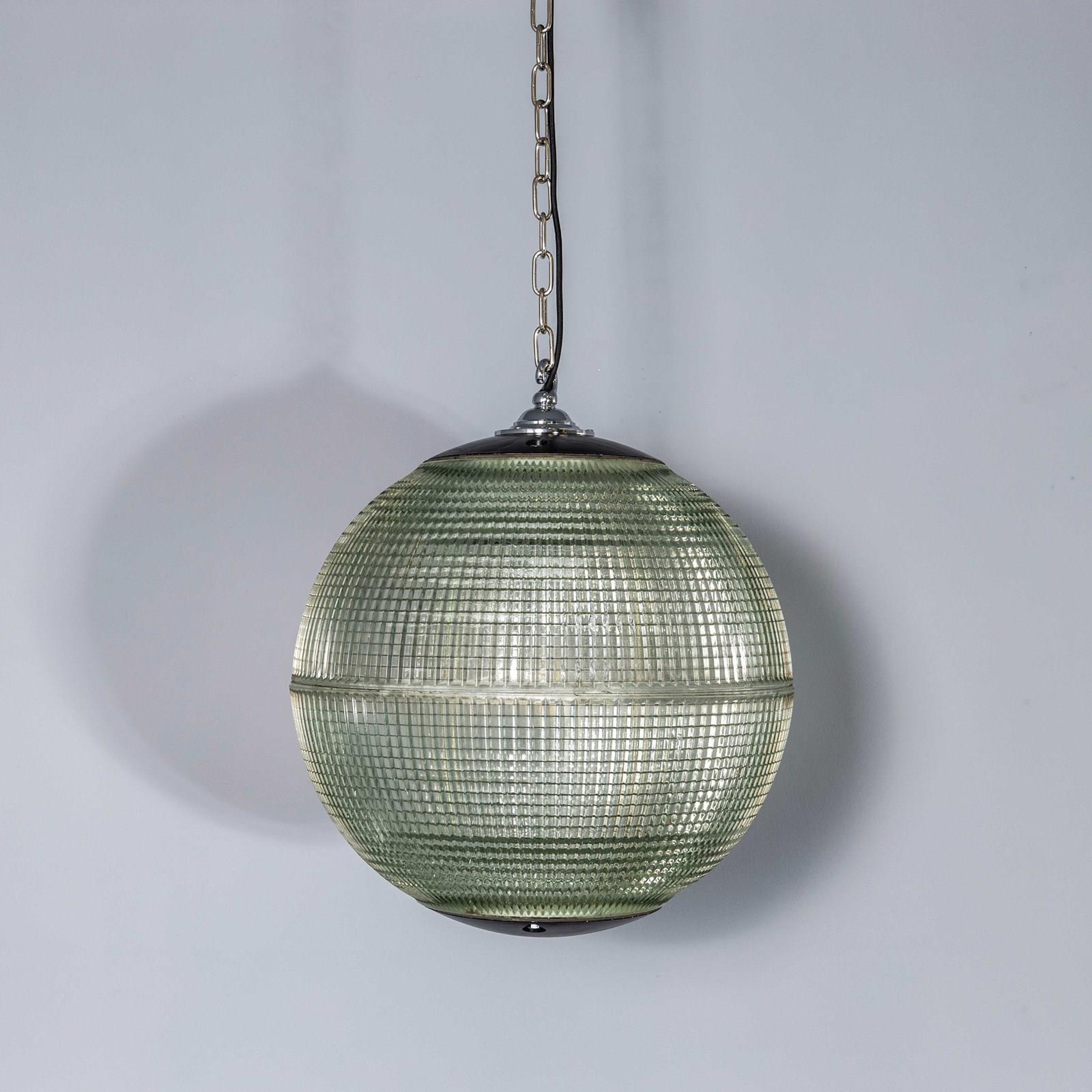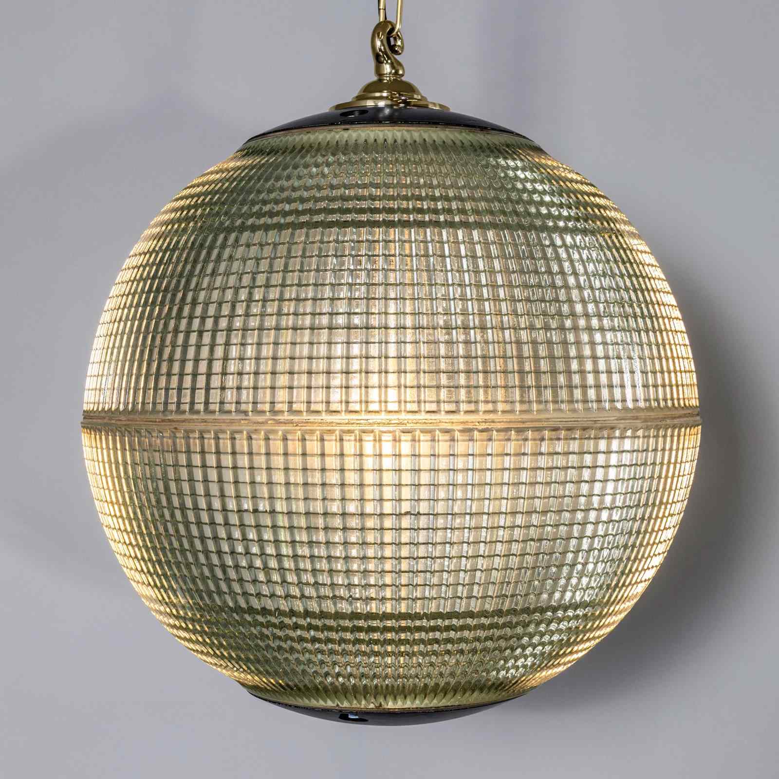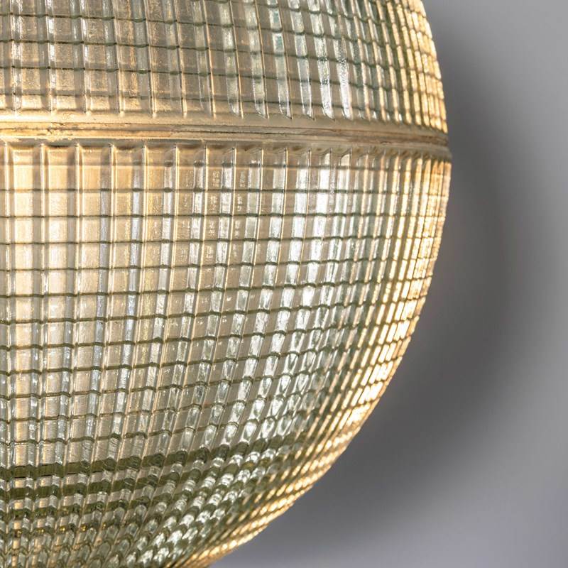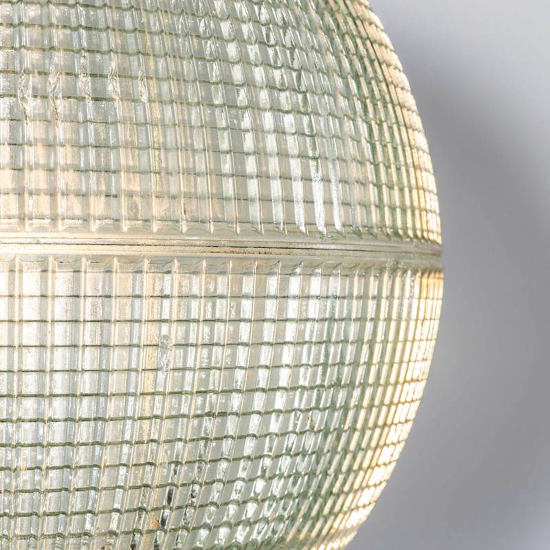 Holophane was founded in France in the late 19th Century and they are famous for their inventing and perfecting borosilicate glass reflectors often with intricate cast glass patterns which give a diffused and beautiful light. This is the iconic Parisian globe lamp used throughout Paris for street lighting and sadly removed from use in the late 20th Century, we have repurposed the extraordinary prismatic globe to form a stunning pendant lamp.
