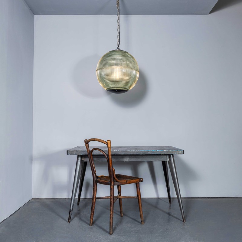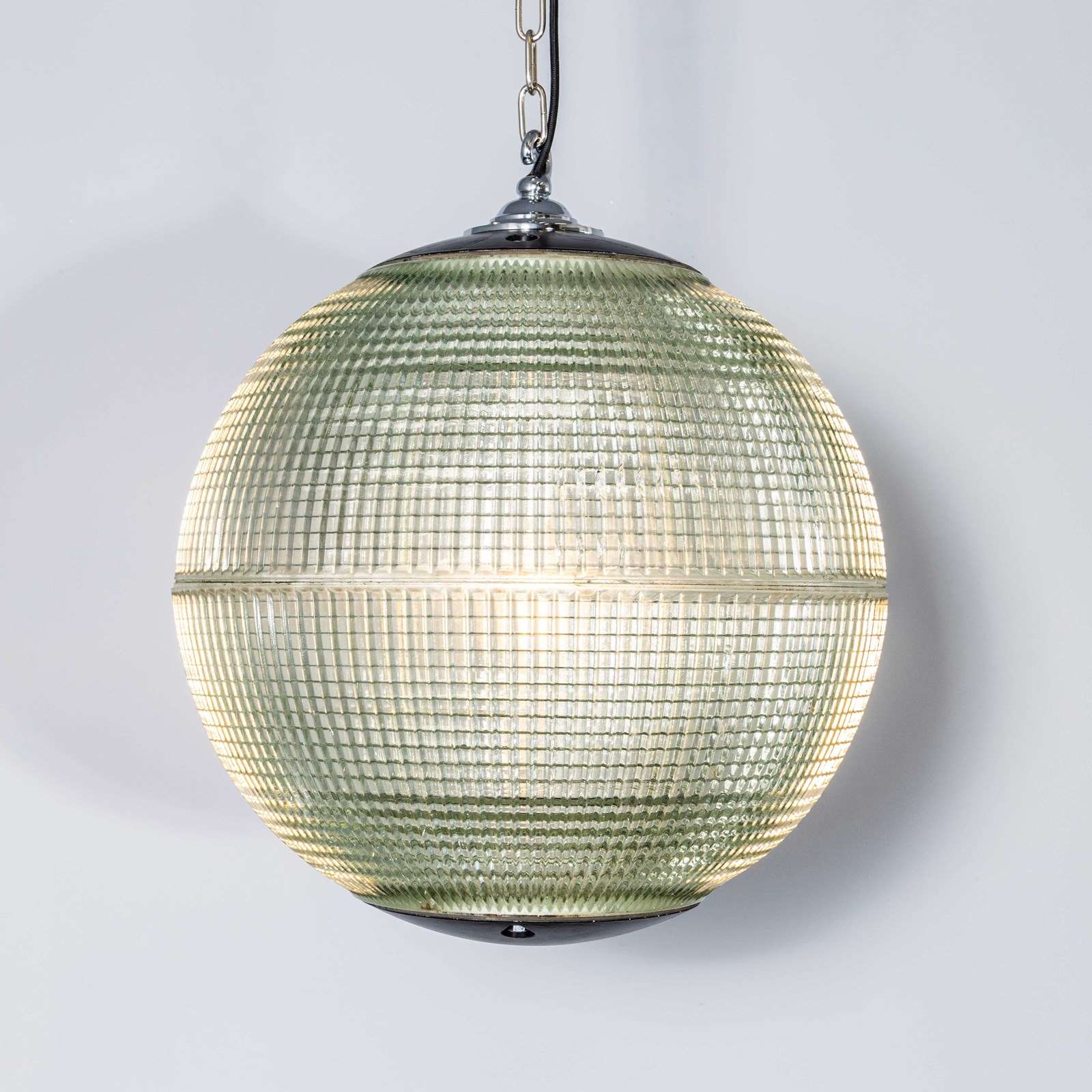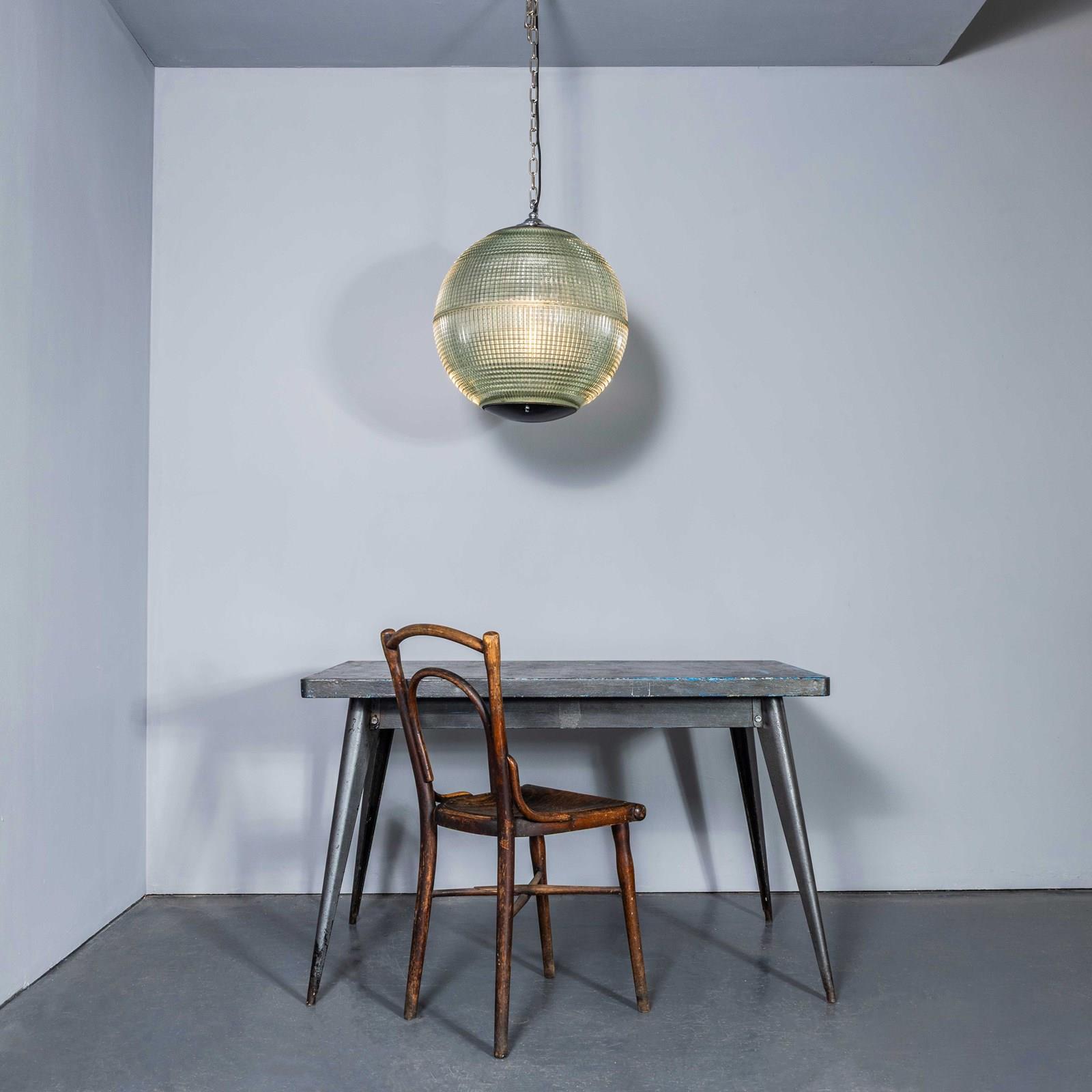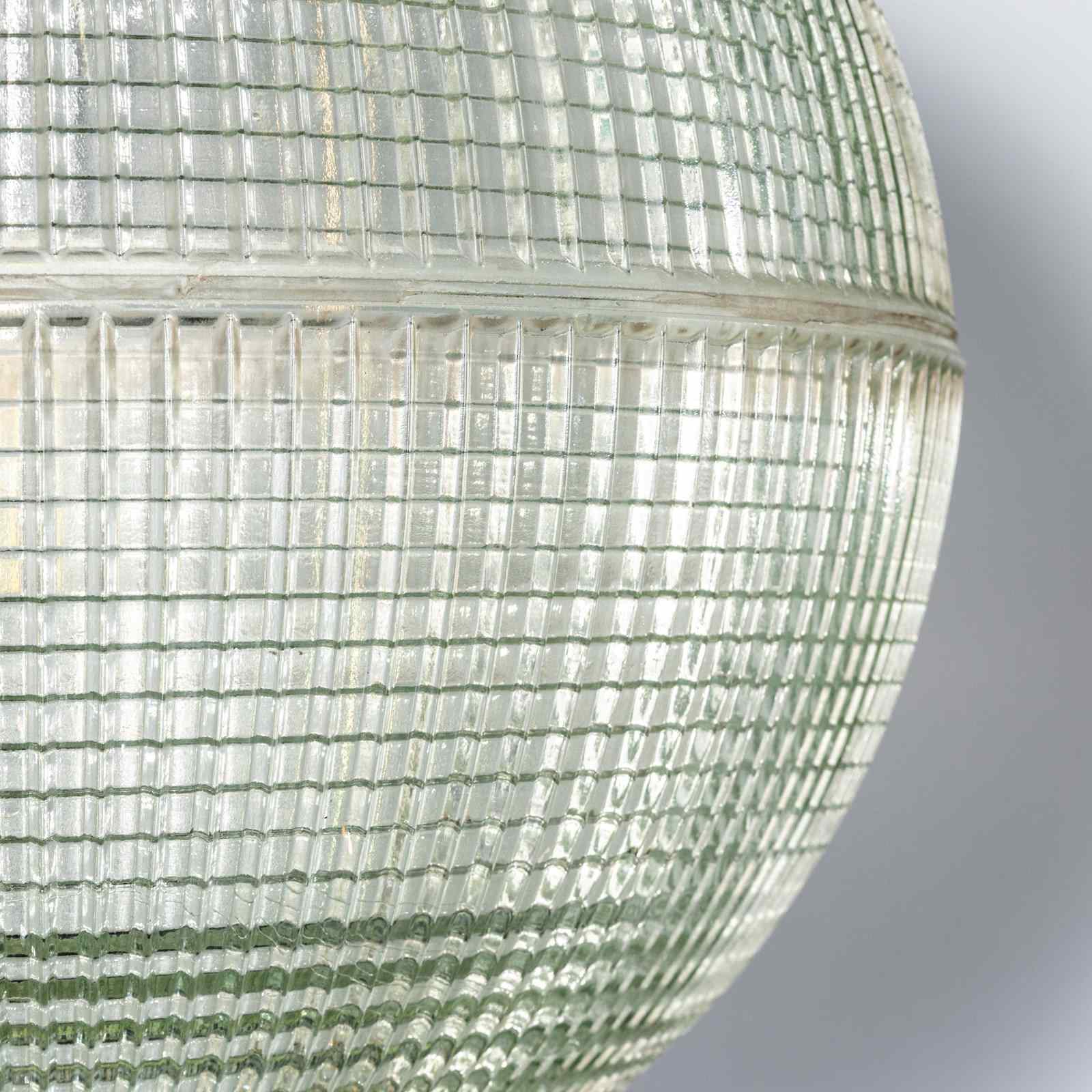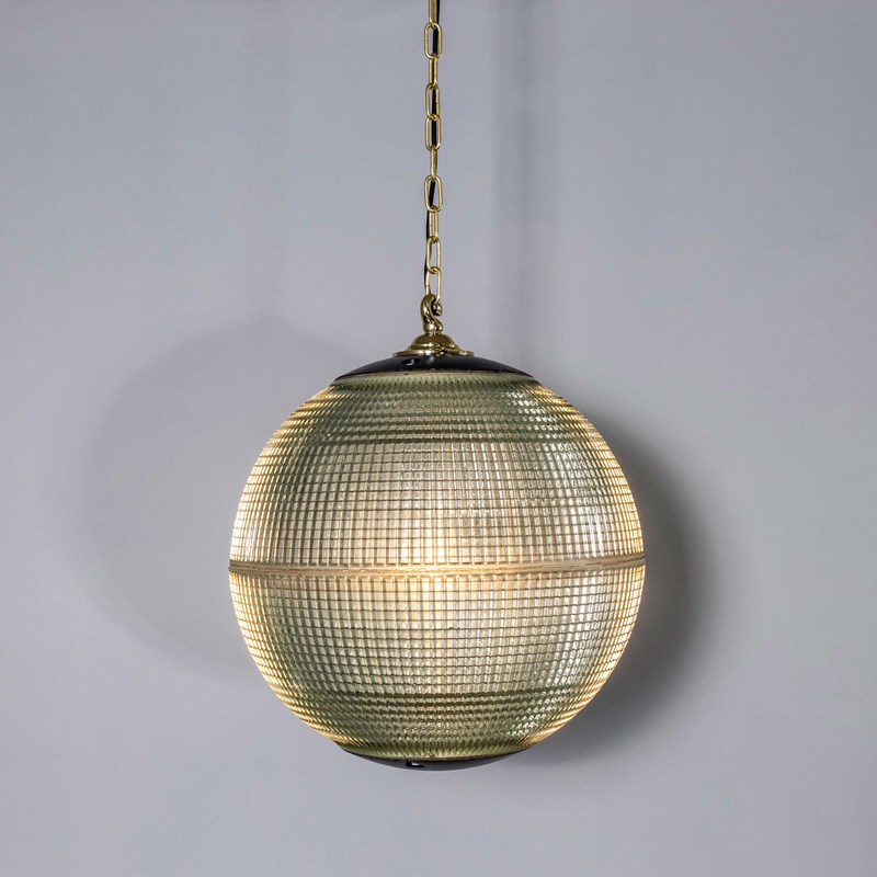 Holophane was founded in France in the late 19th Century and they are famous for their inventing and perfecting borosilicate glass reflectors often with intricate cast glass patterns which give a diffused and beautiful light. This is the iconic Parisian globe lamp used throughout Paris for street lighting and sadly removed from use in the late 20th Century, we have repurposed the extraordinary prismatic globe to form a stunning pendant lamp.