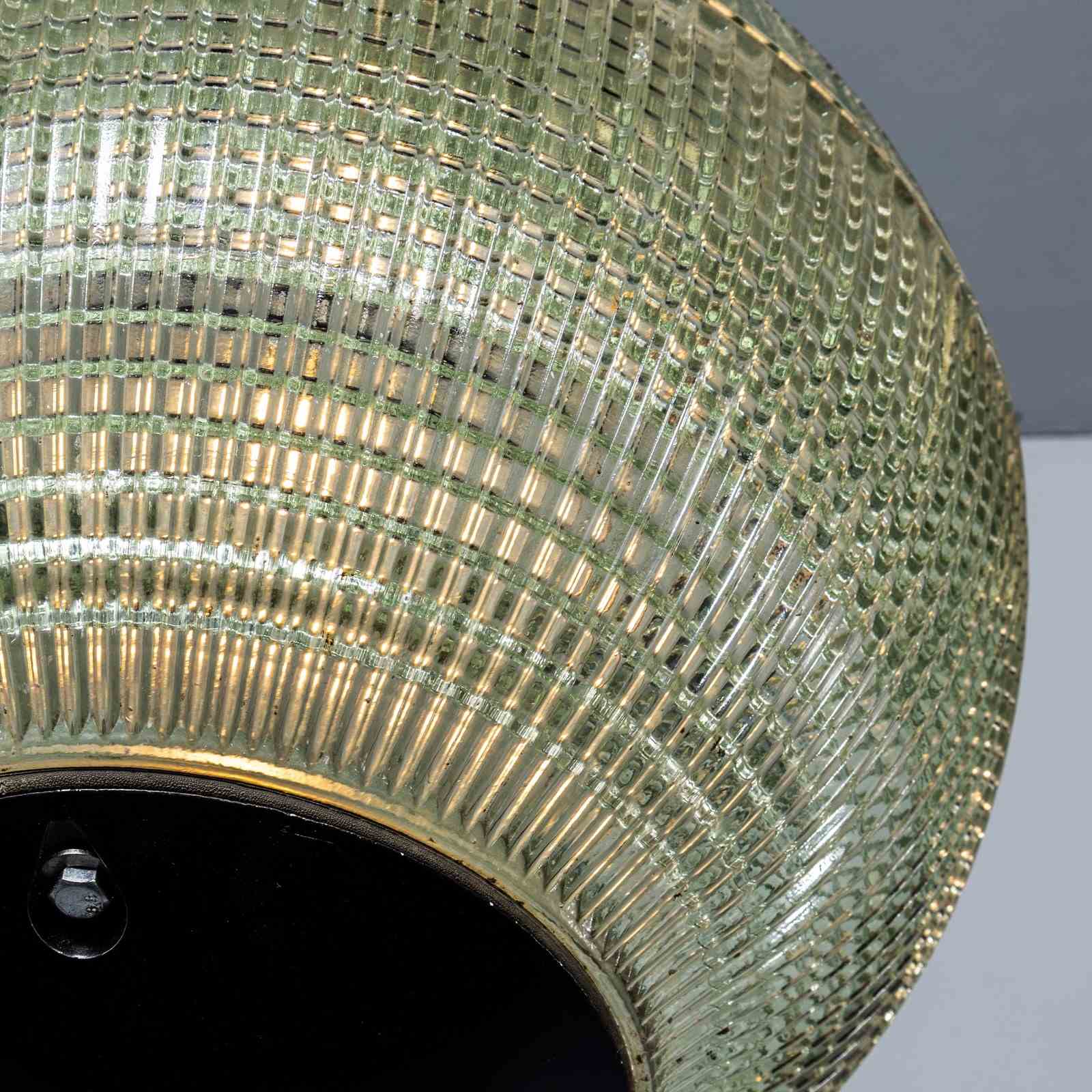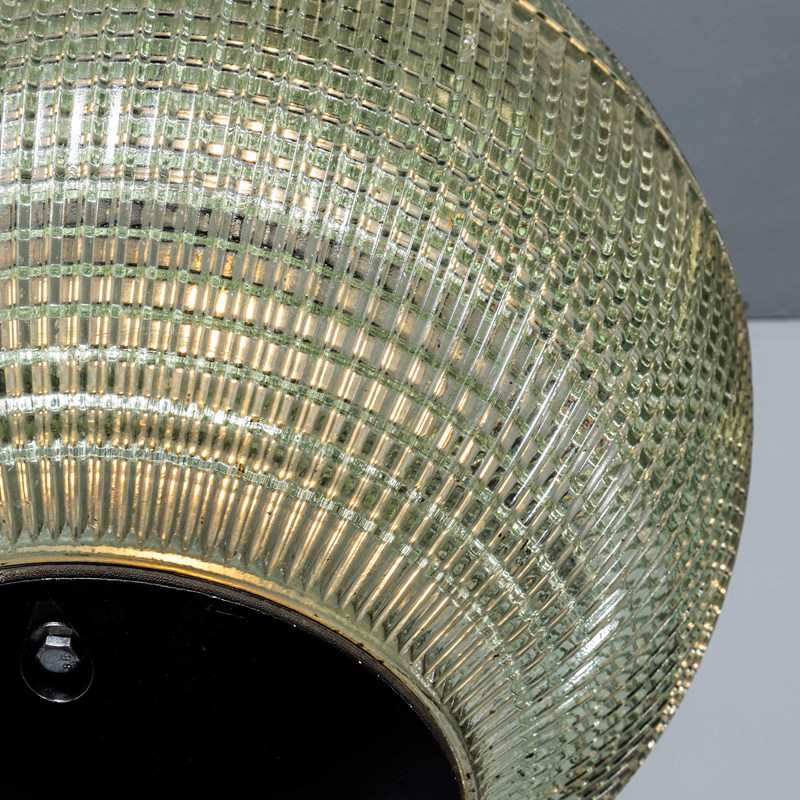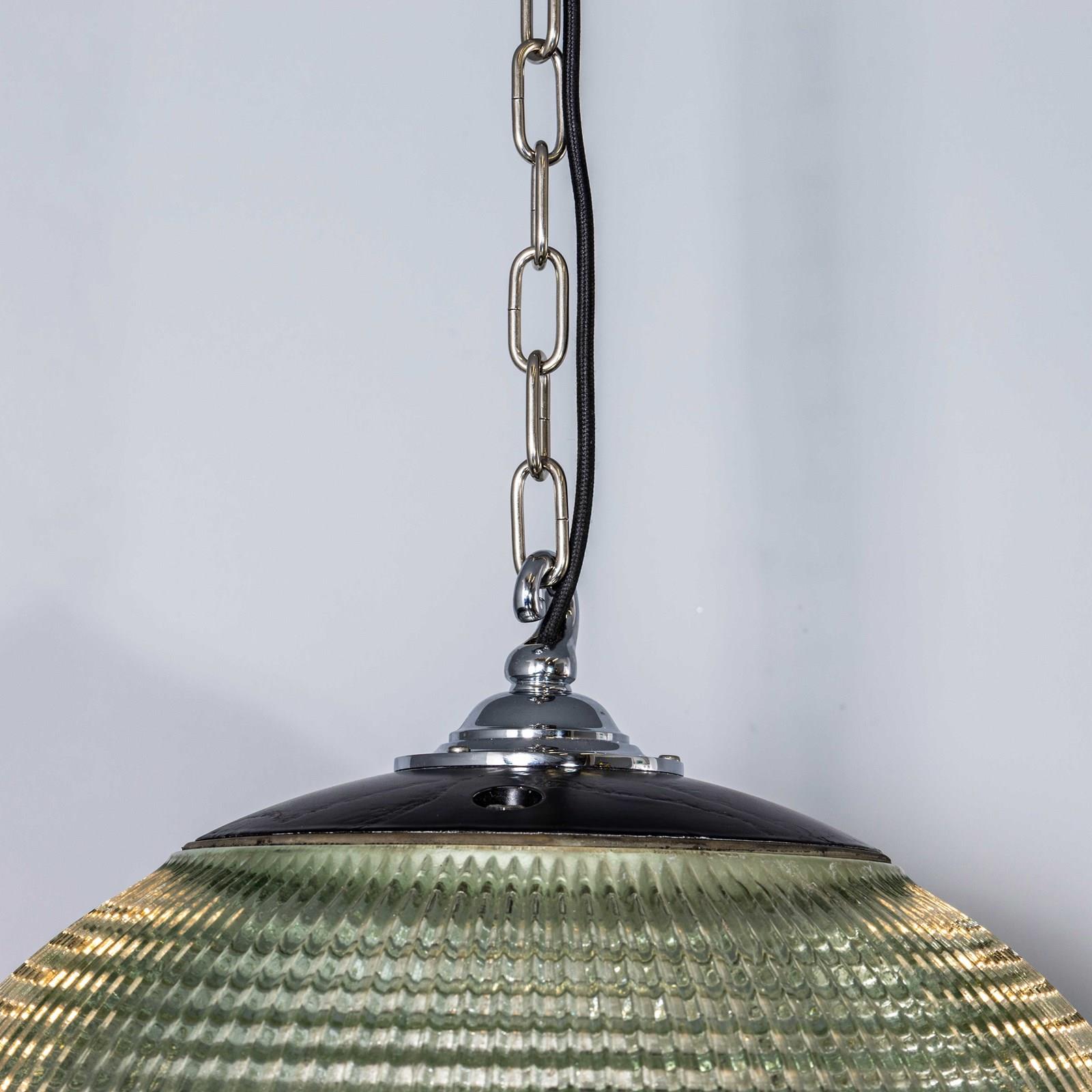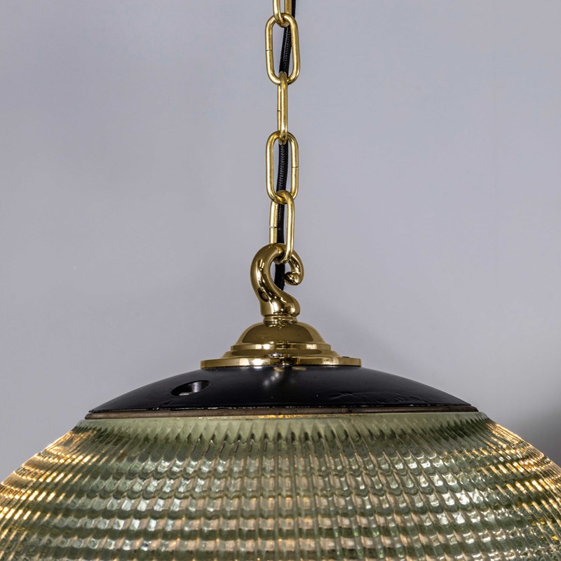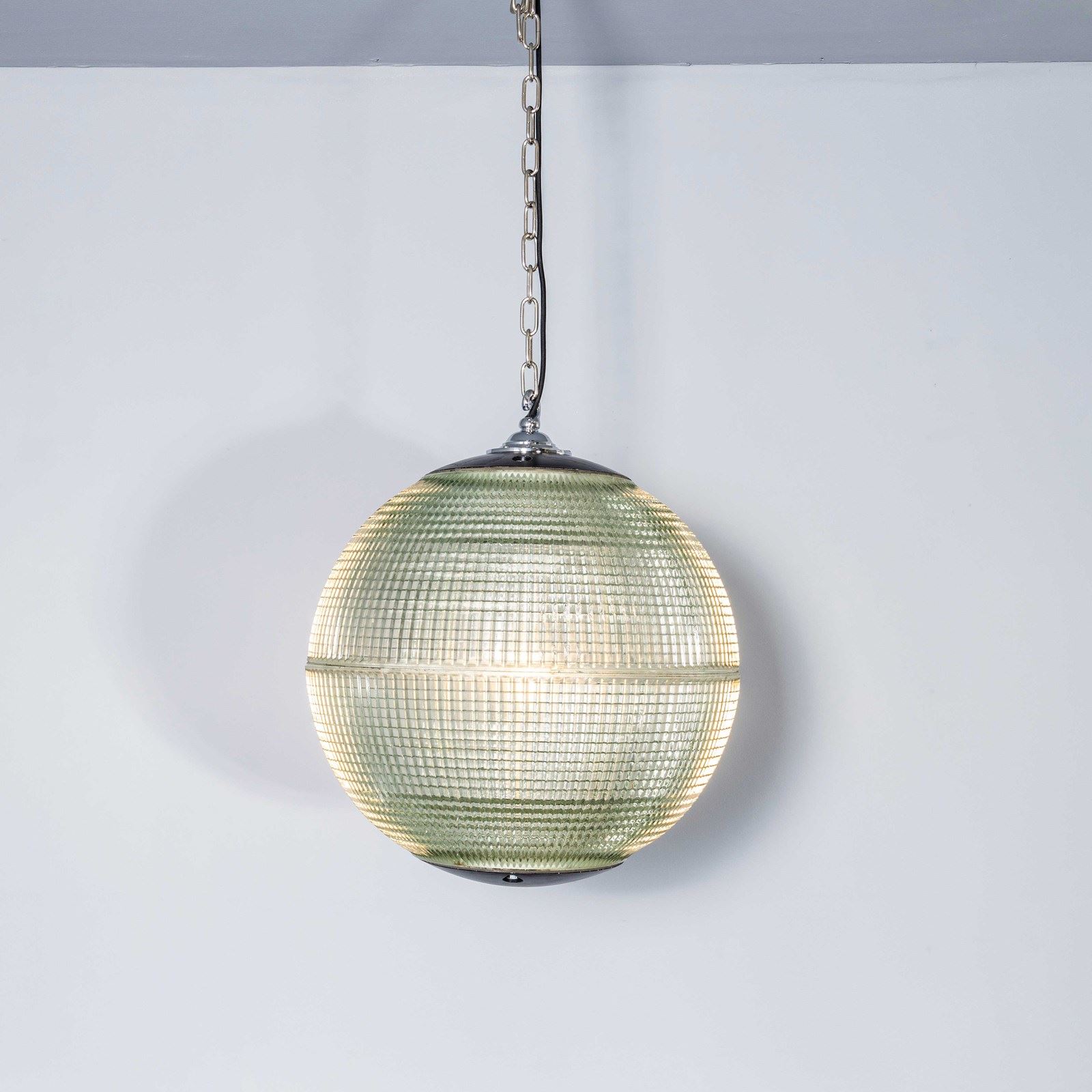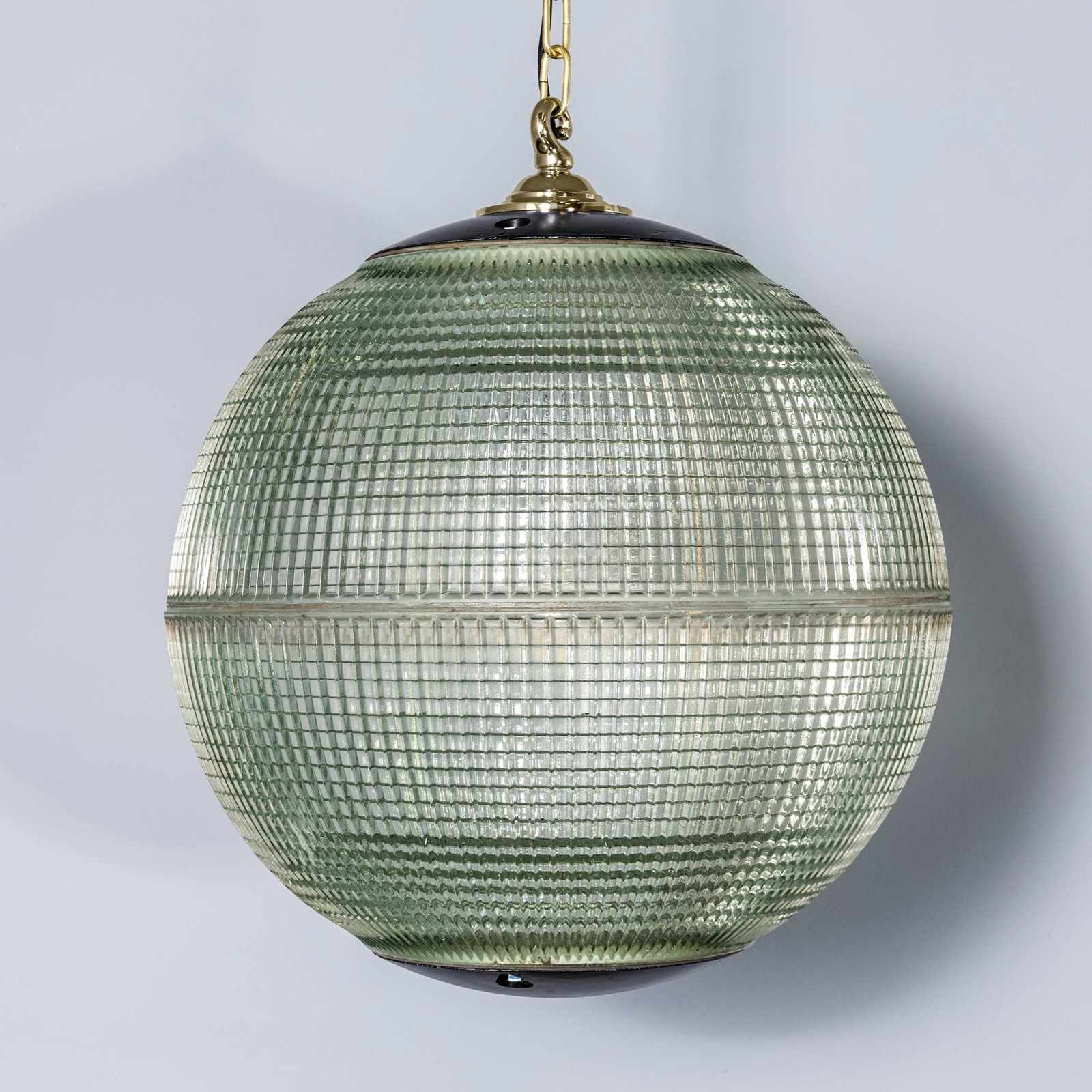 Holophane was founded in France in the late 19th Century and they are famous for their inventing and perfecting borosilicate glass reflectors often with intricate cast glass patterns which give a diffused and beautiful light. This is the iconic Parisian globe lamp used throughout Paris for street lighting and sadly removed from use in the late 20th Century, we have repurposed the extraordinary prismatic globe to form a stunning pendant lamp.