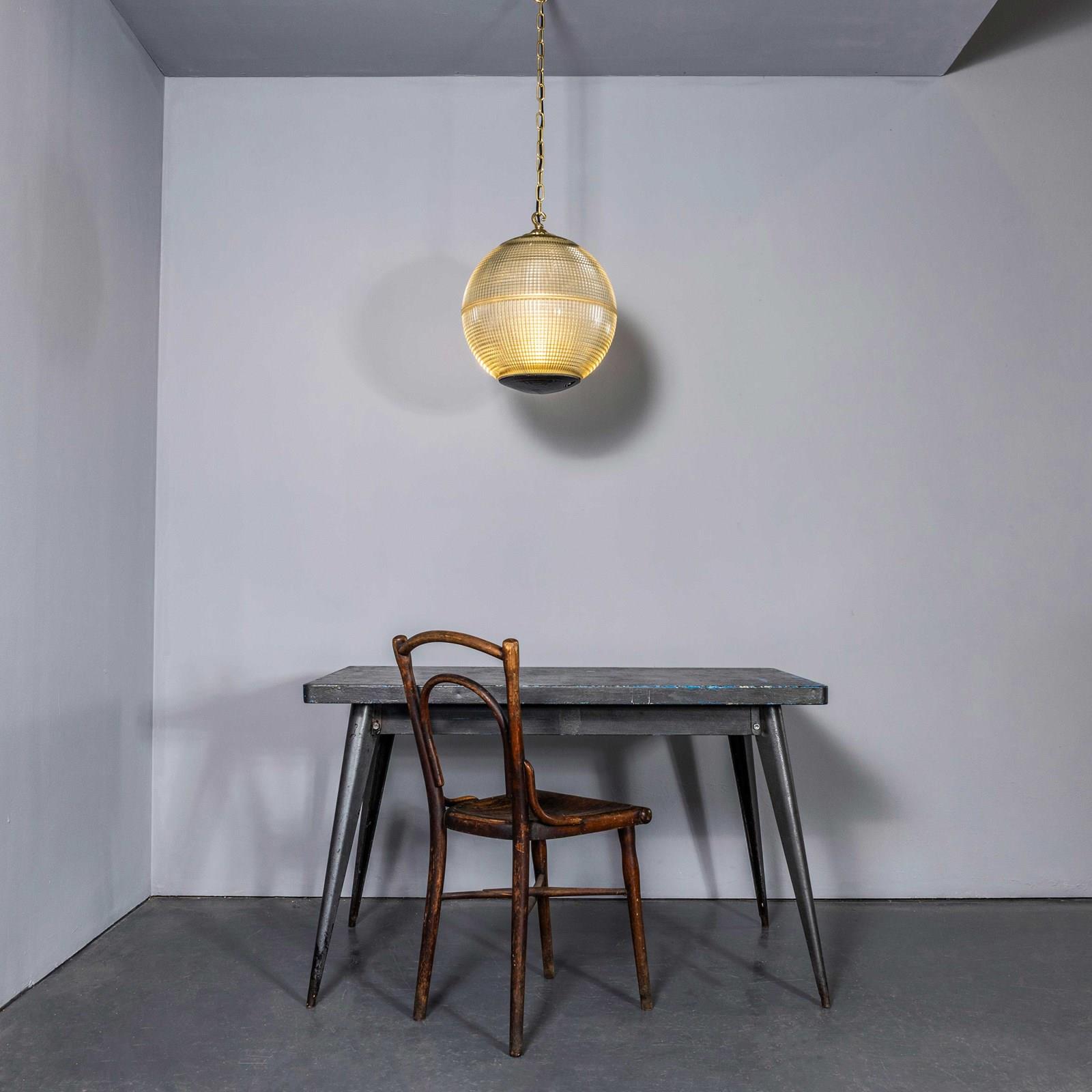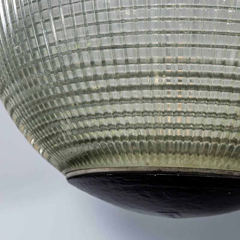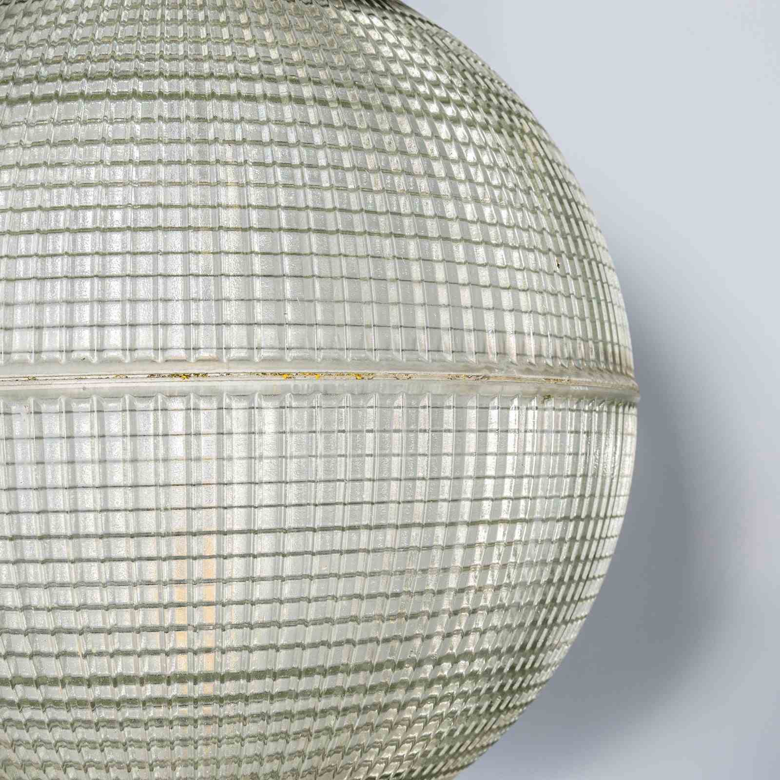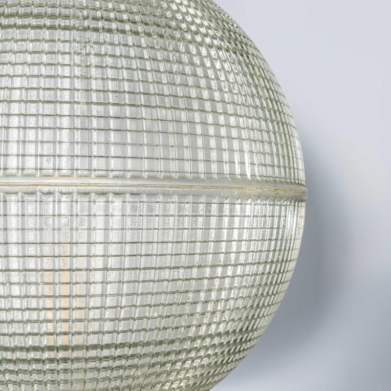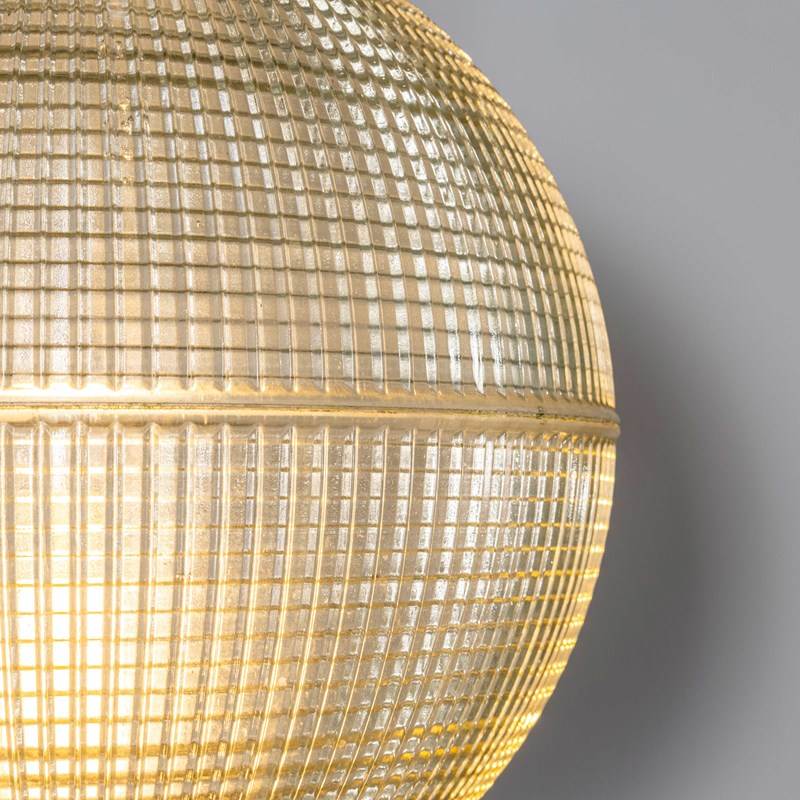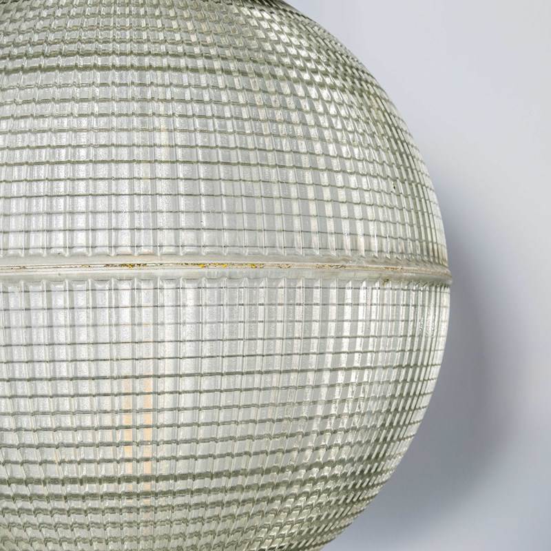 Holophane was founded in France in the late 19th Century and they are famous for their inventing and perfecting borosilicate glass reflectors often with intricate cast glass patterns which give a diffused and beautiful light. This is the iconic Parisian globe lamp used throughout Paris for street lighting and sadly removed from use in the late 20th Century, we have repurposed the extraordinary prismatic globe to form a stunning pendant lamp.