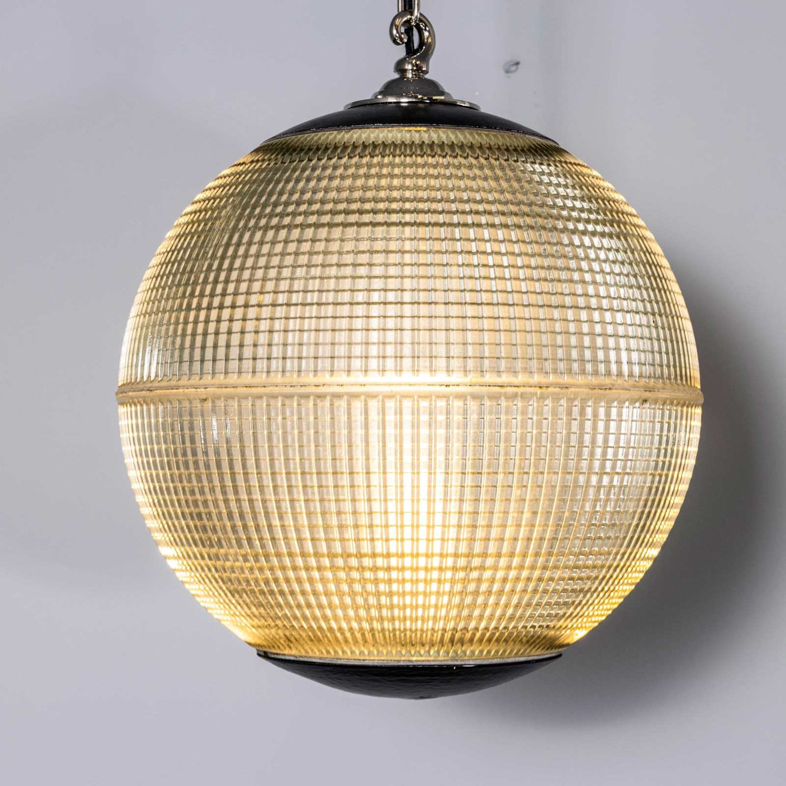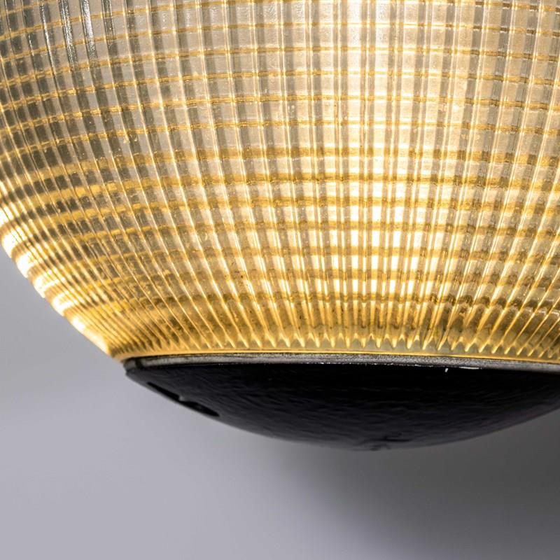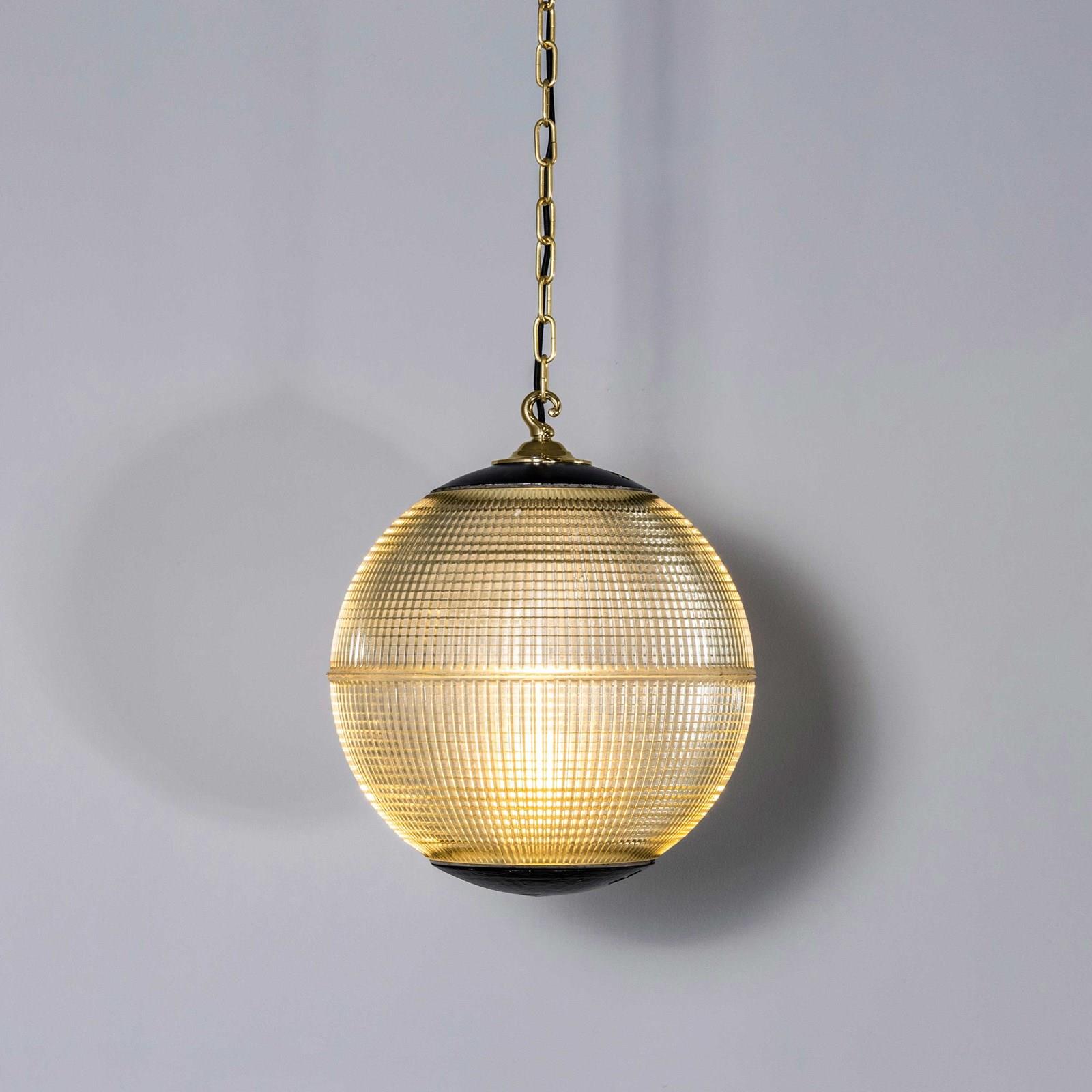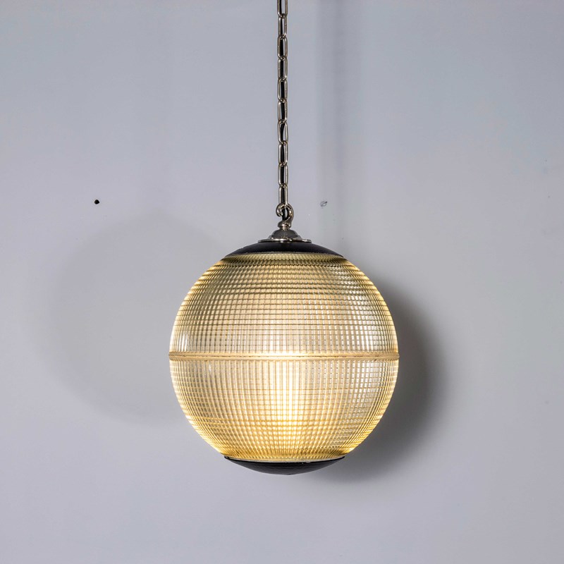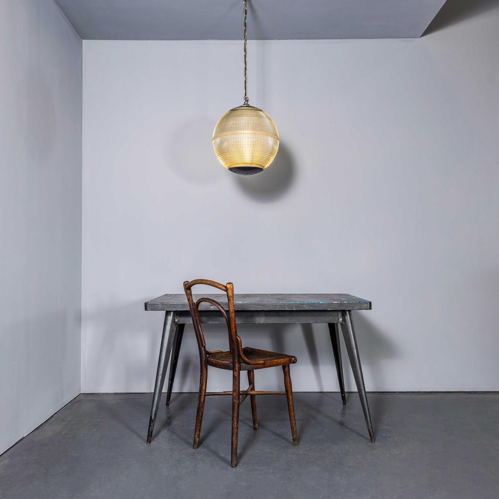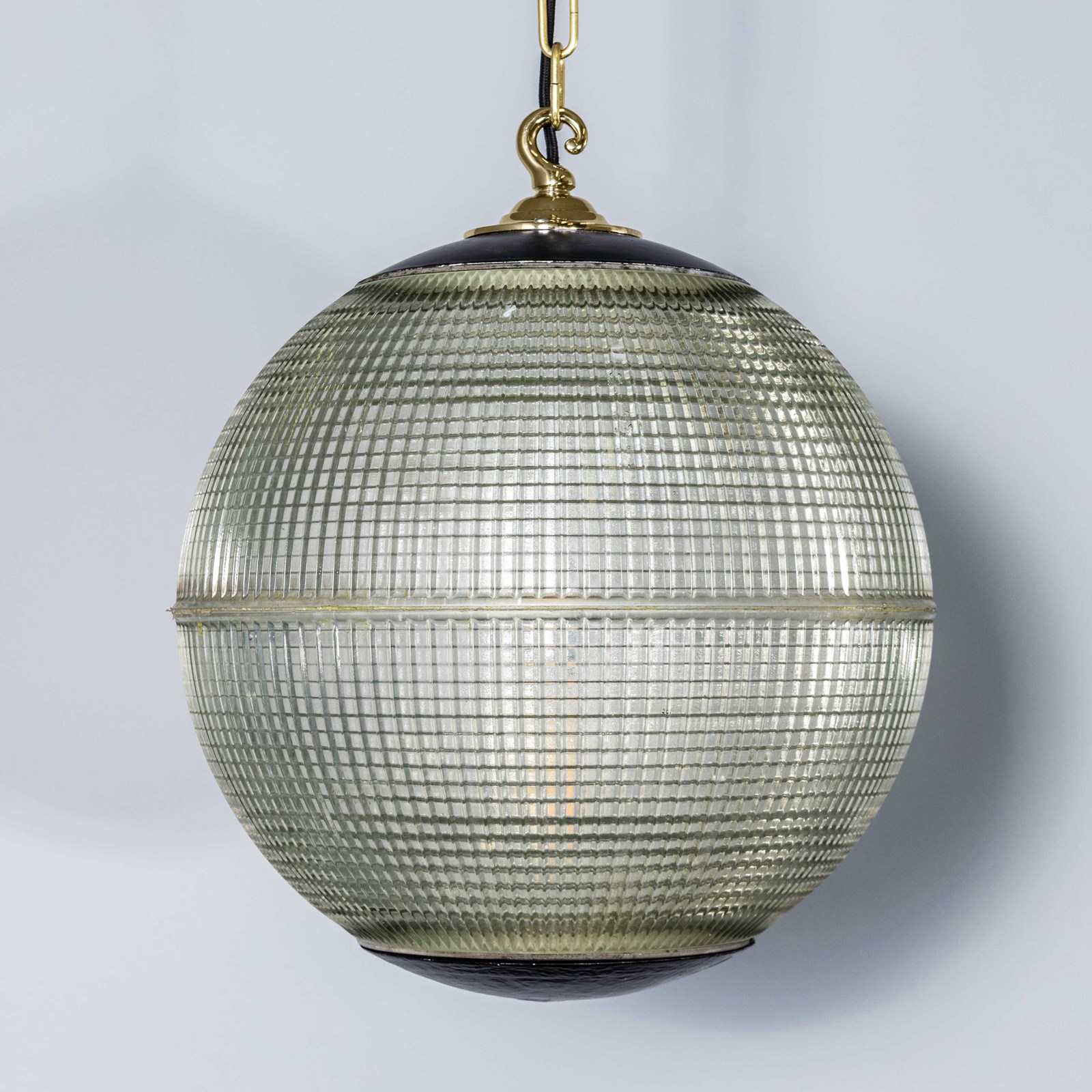 Holophane was founded in France in the late 19th Century and they are famous for their inventing and perfecting borosilicate glass reflectors often with intricate cast glass patterns which give a diffused and beautiful light. This is the iconic Parisian globe lamp used throughout Paris for street lighting and sadly removed from use in the late 20th Century, we have repurposed the extraordinary prismatic globe to form a stunning pendant lamp.