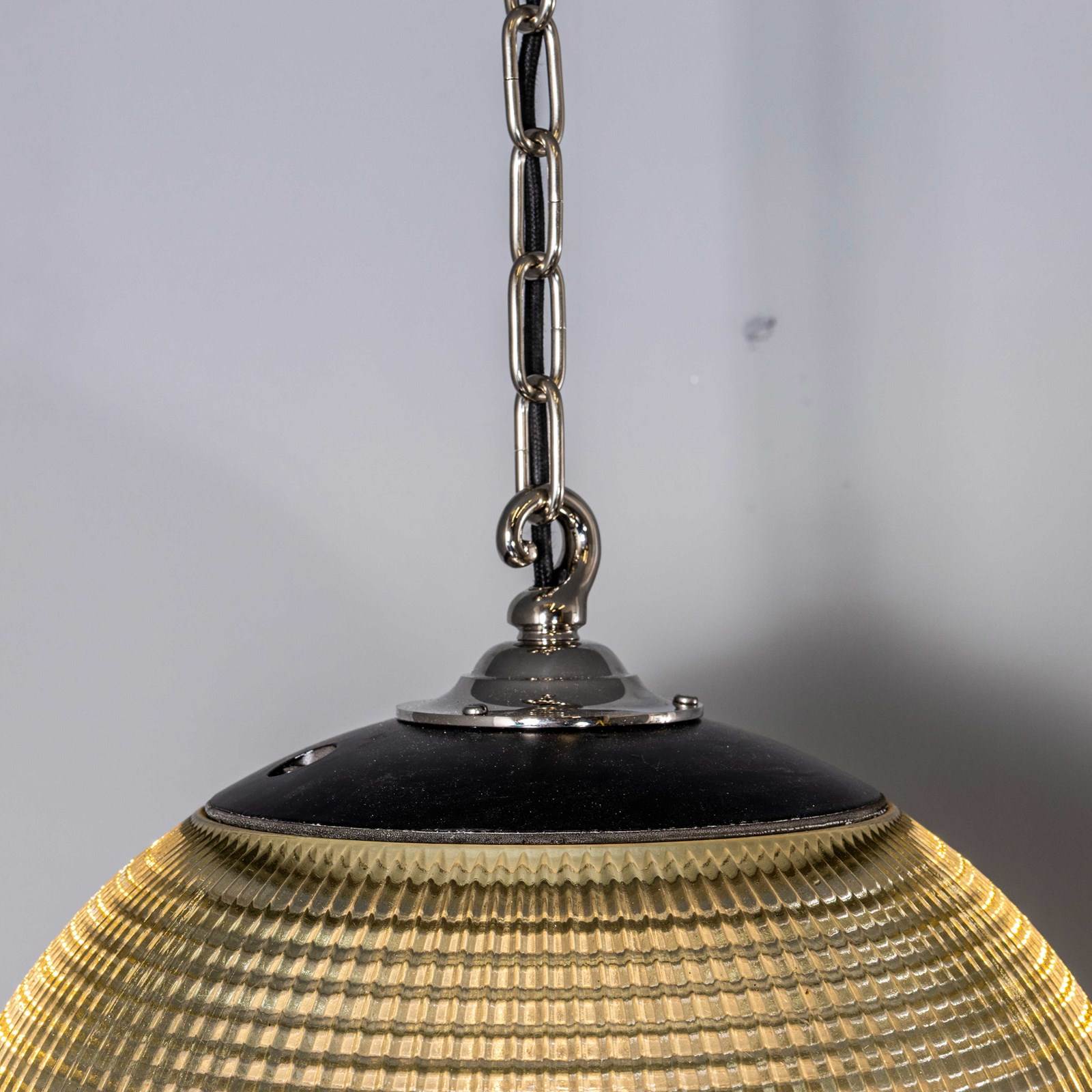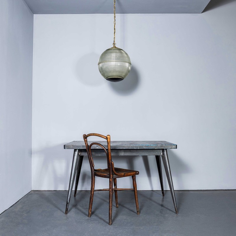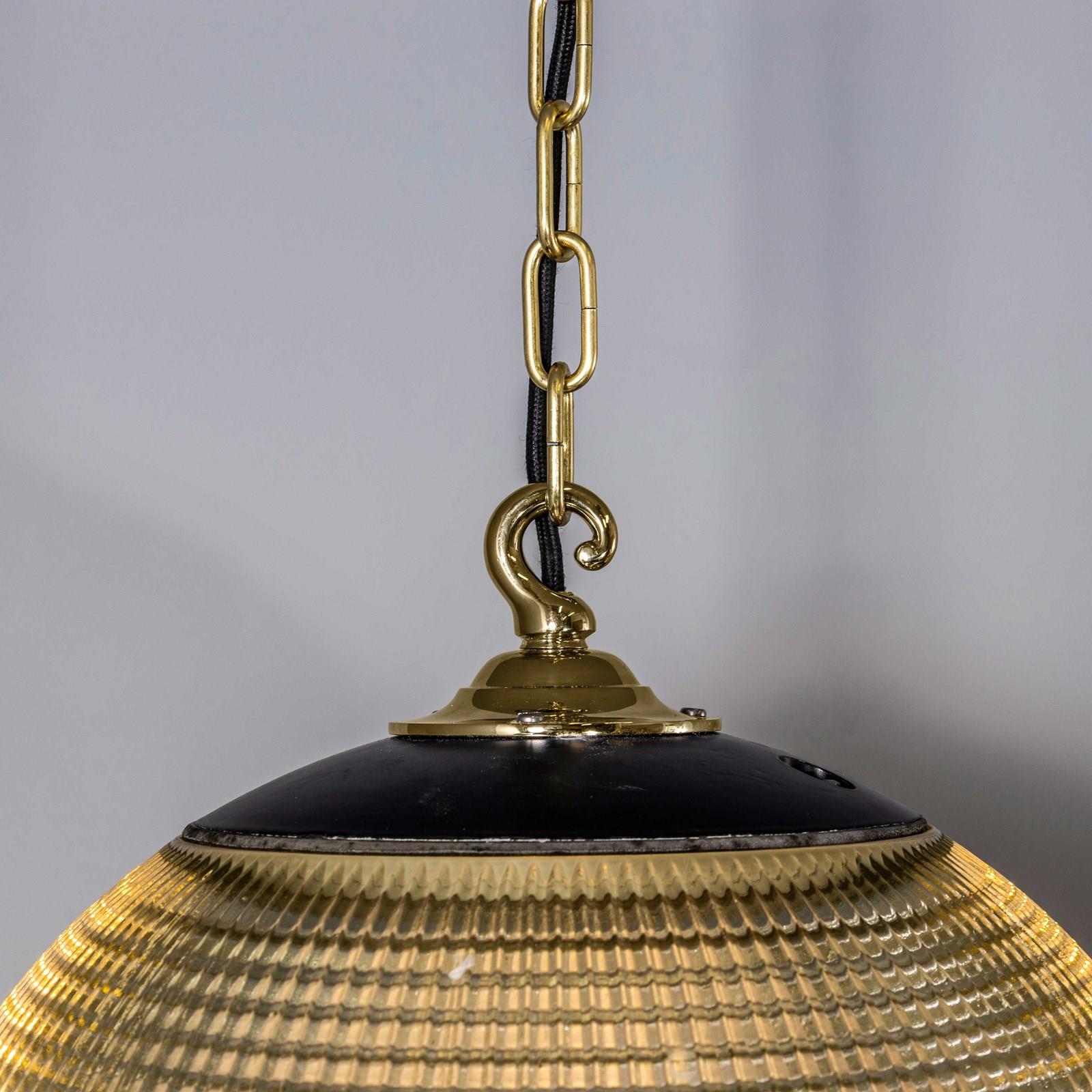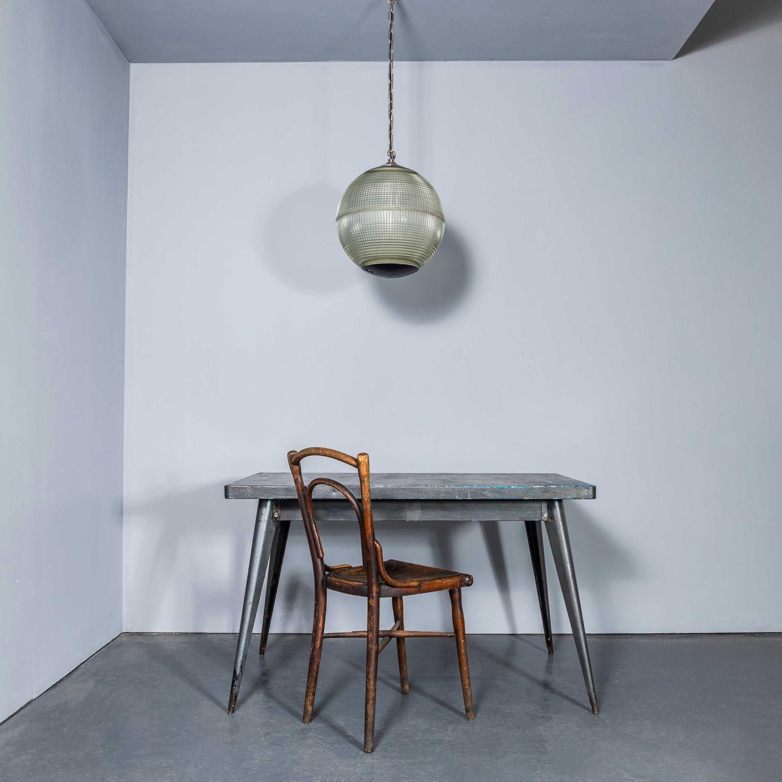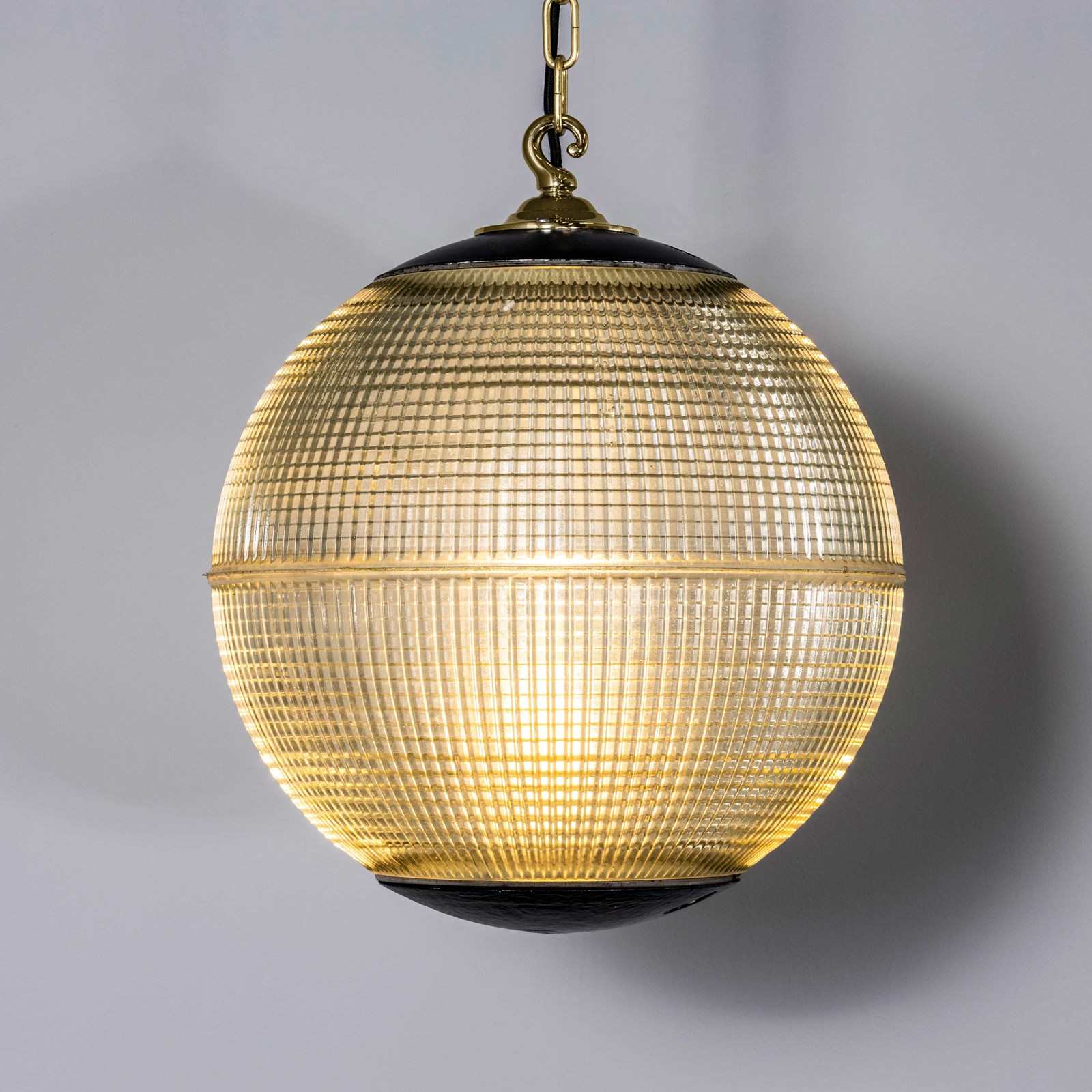 Holophane was founded in France in the late 19th Century and they are famous for their inventing and perfecting borosilicate glass reflectors often with intricate cast glass patterns which give a diffused and beautiful light. This is the iconic Parisian globe lamp used throughout Paris for street lighting and sadly removed from use in the late 20th Century, we have repurposed the extraordinary prismatic globe to form a stunning pendant lamp.