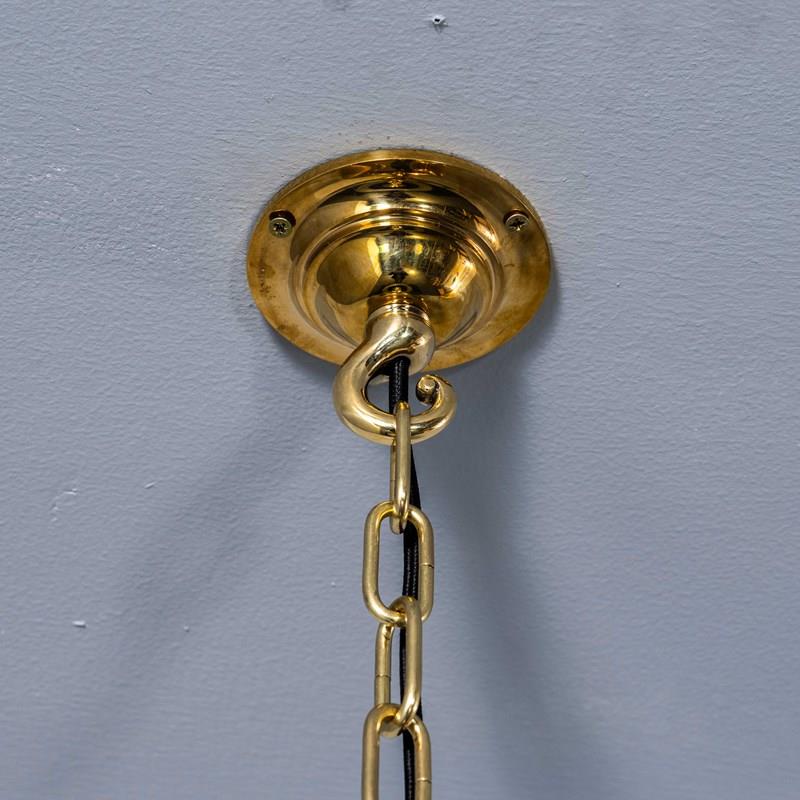 Each lamp has been cleaned and restored and all electrical components have been removed and replaced with modern European CE standard components to BS EN 60598. Each lamp is individually tested and labelled to BS EN 60598. INCLUDED: Each lamp comes completely wired and ready to install including; 2 metres of chain for hanging the lamps, 2 metres of black fabric covered electrical cable and a ceiling hook as shown. We can supply more than 2 metres of hanging cable/chain as required, please contact us separately to discuss. Each lamp is fitted with a standard E27 threaded lamp holder for which a wide range of modern and vintage style filament bulbs are widely available. We do not currently sell bulbs and recommend LED bulbs 6W maximum. Please note this is a heavy lamp approximately 25kg and a suitable hanging point must be used. We are specialists in refurbishment of vintage lighting, please contact us with any questions regarding purchase or installation.