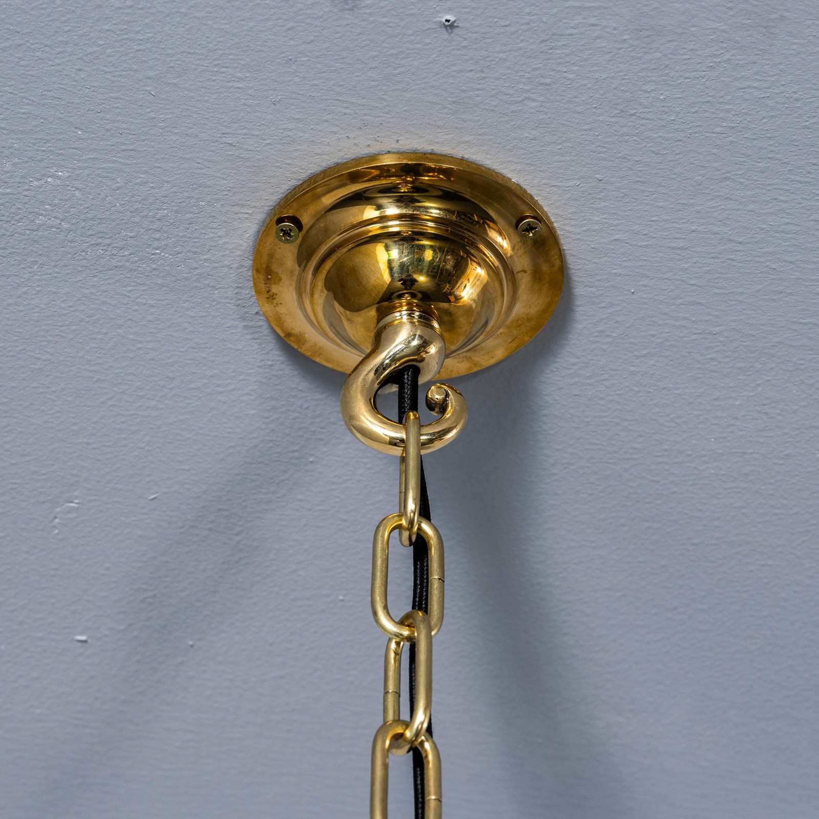 • Brass gallery hook with brass chain and black covered flex.