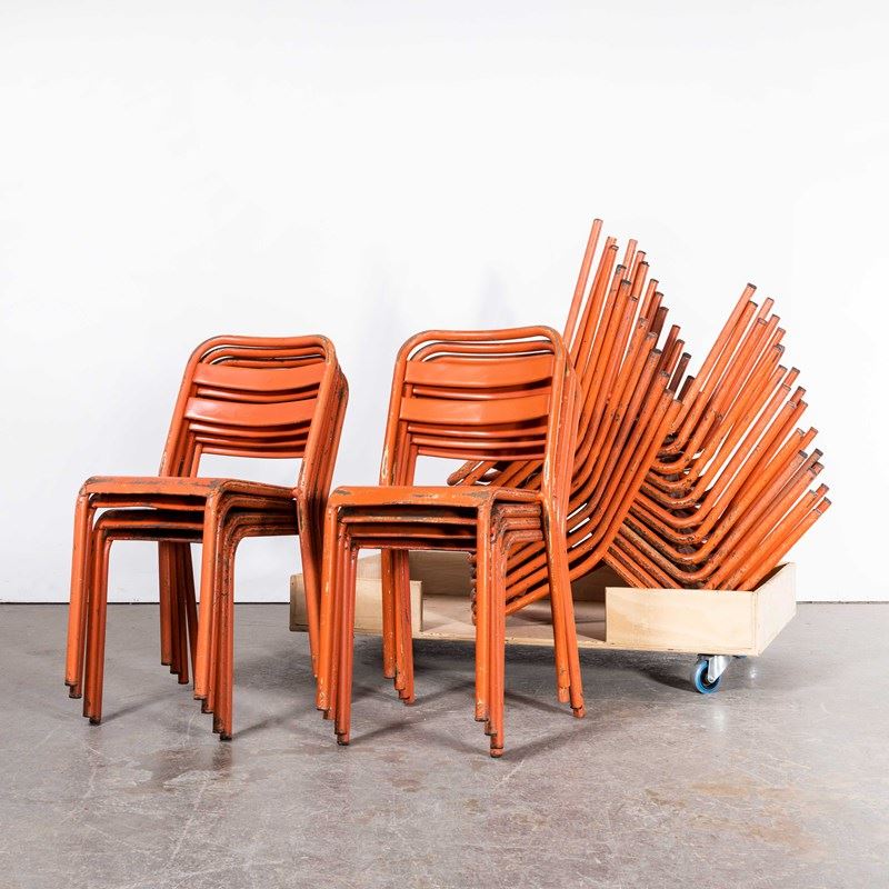 1960’s Original Red French Tolix T2 Metal Outdoor Dining Chairs – Various Quantities Available. Tolix is one of our all time favourite companies. In 1907 Frenchman Xavier Pauchard discovered that he could protect sheet metal from rusting by dipping it in molten zinc (galvanisation) and a few years later he set up his factory producing steel furniture. Tolix was the creator and founder of perhaps the most iconic cafe chair of all time, the Tolix model A, designed in 1934. This Tolix model features original red paint with the T2 slatted back and solid seats. Painted in the original red these chairs are in exceptional original condition, our workshop services and rejuvenates each product before it leaves us. Seat Height 45cm.