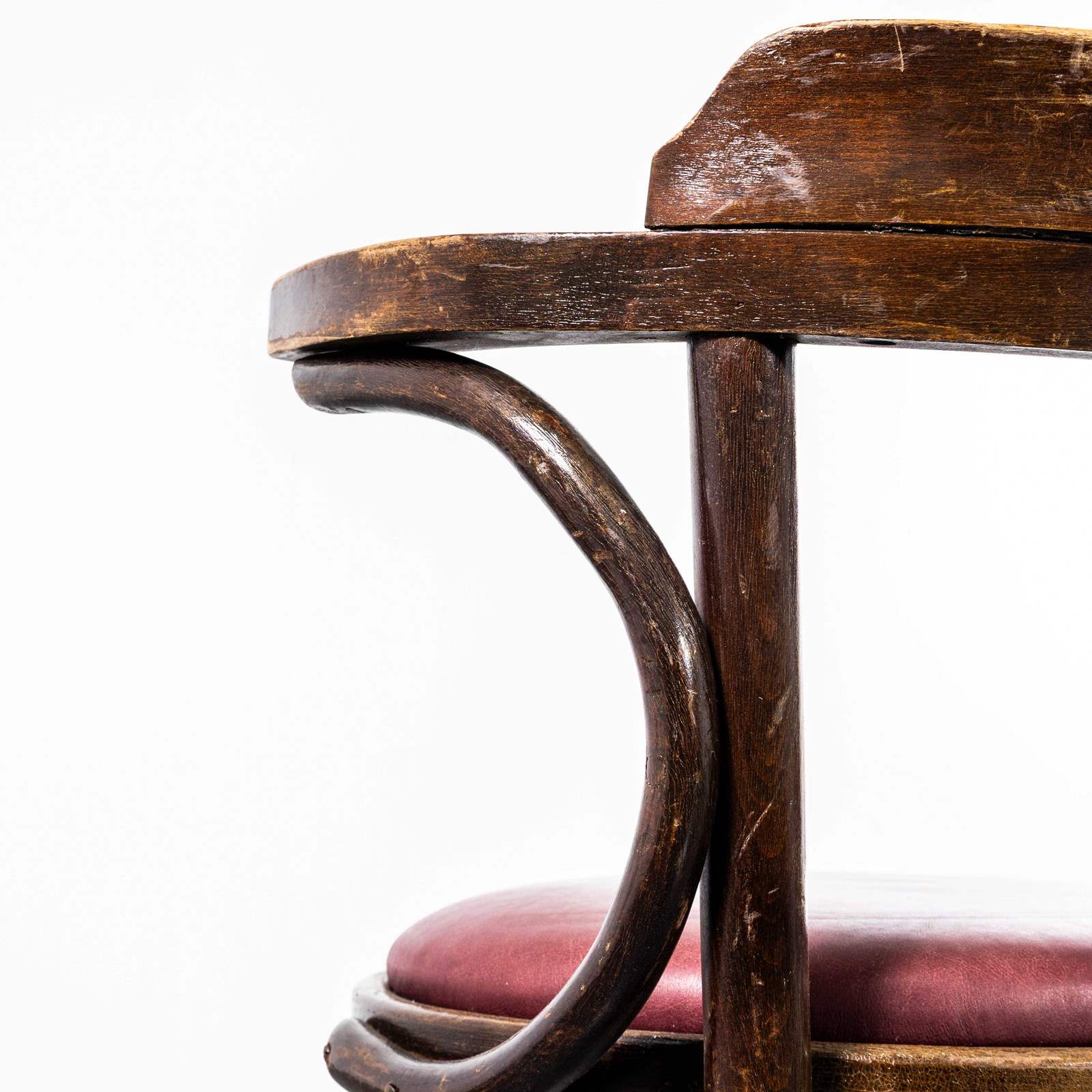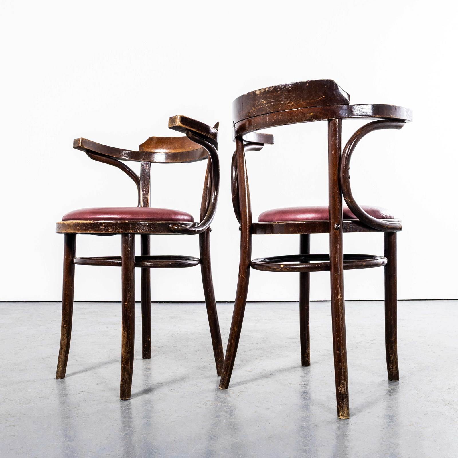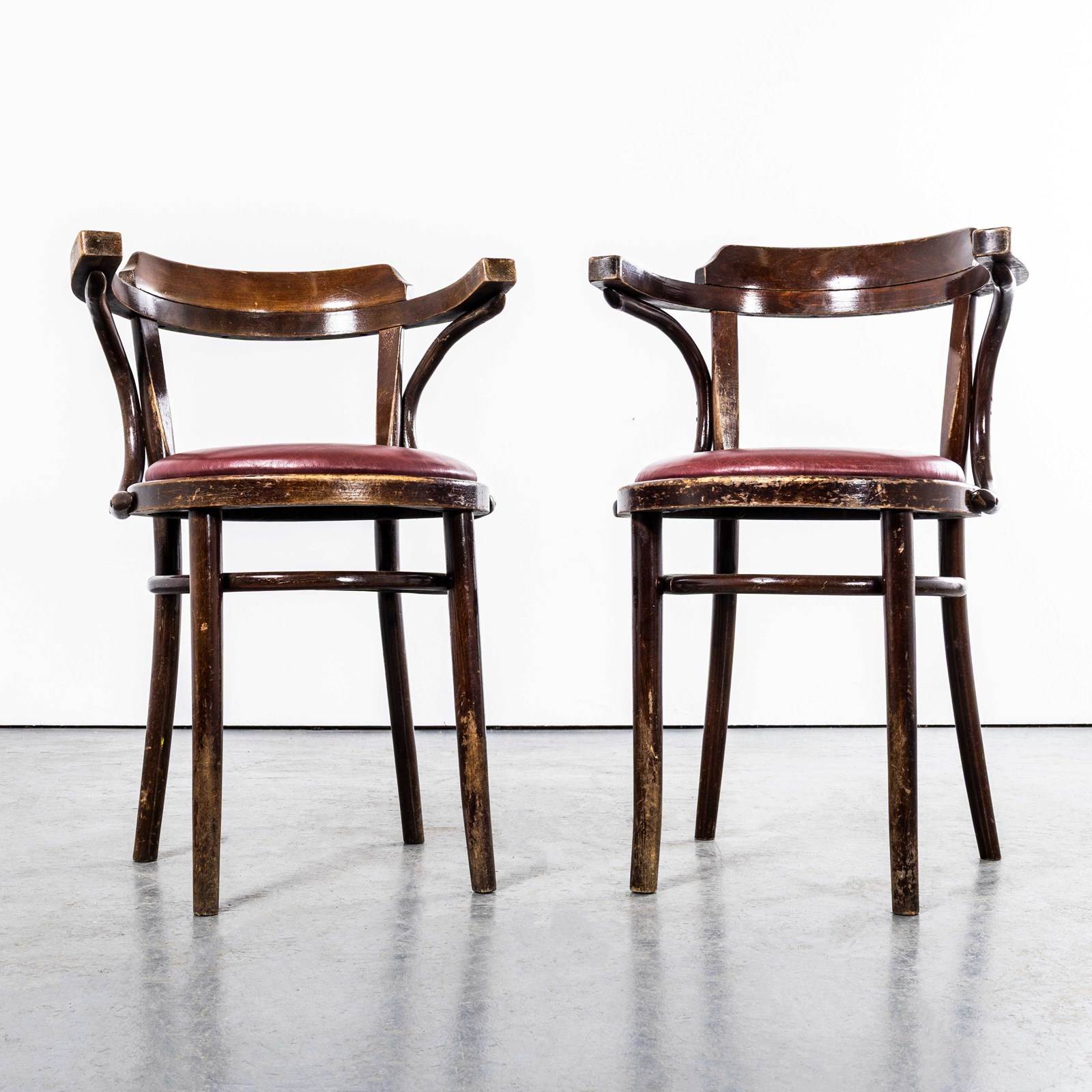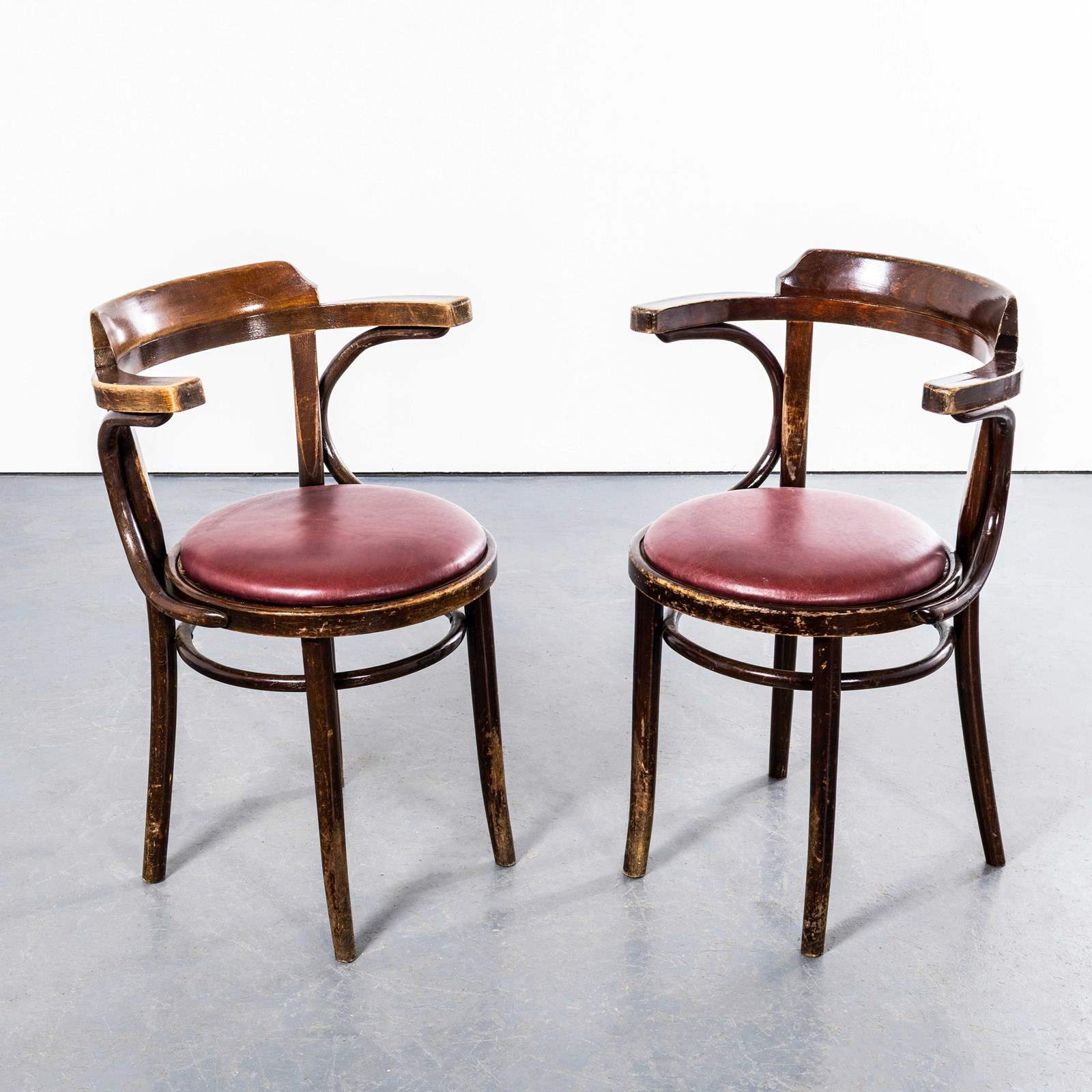 Sourced from an old working men’s club in south London they are in excellent condition with a rich colour. We can’t identify the maker but they are undoubtedly industrially produced in Romania or Hungary. Every chair passes through our workshop where it is serviced, cleaned and waxed. Seat Diameter 40cm. Seat Height: 47cm