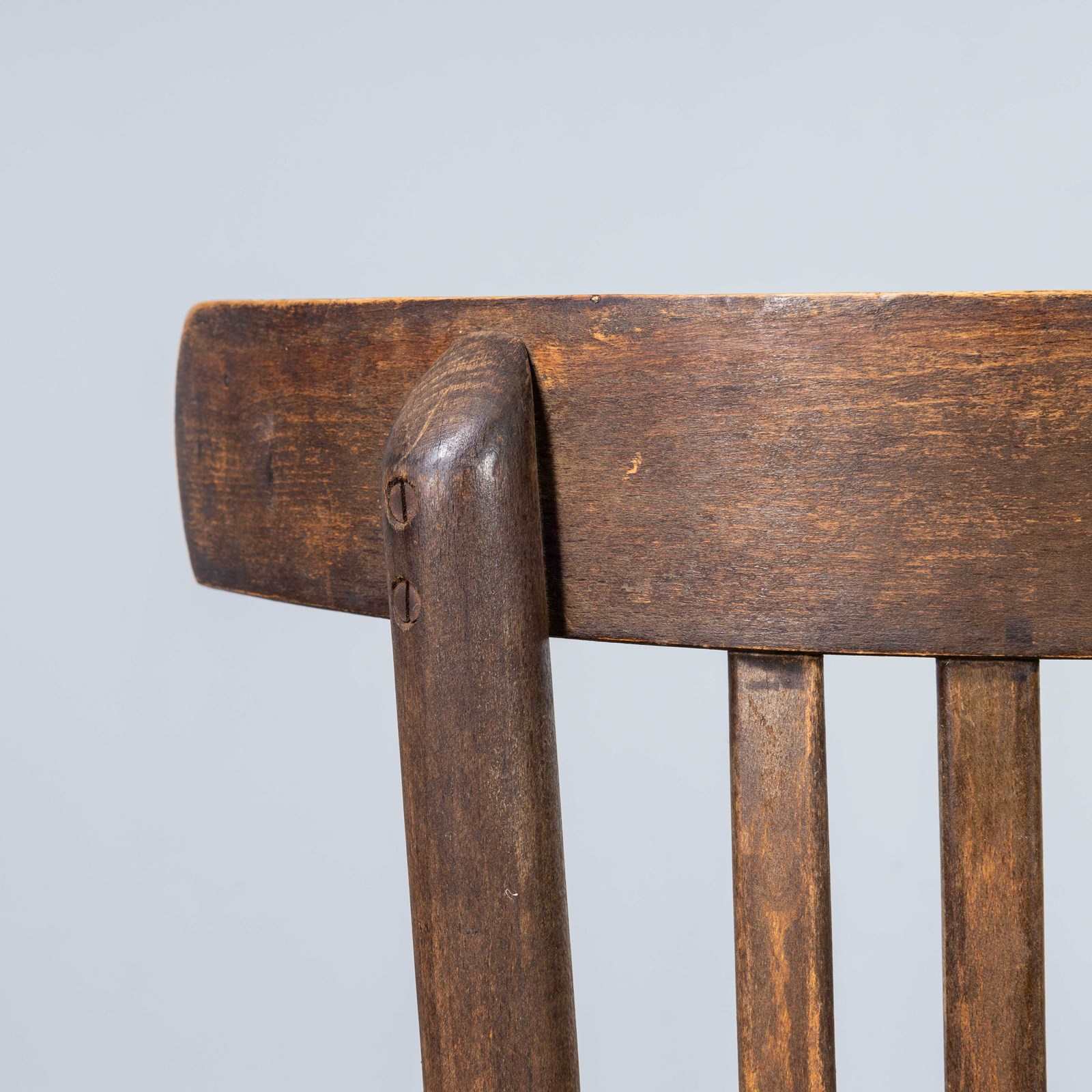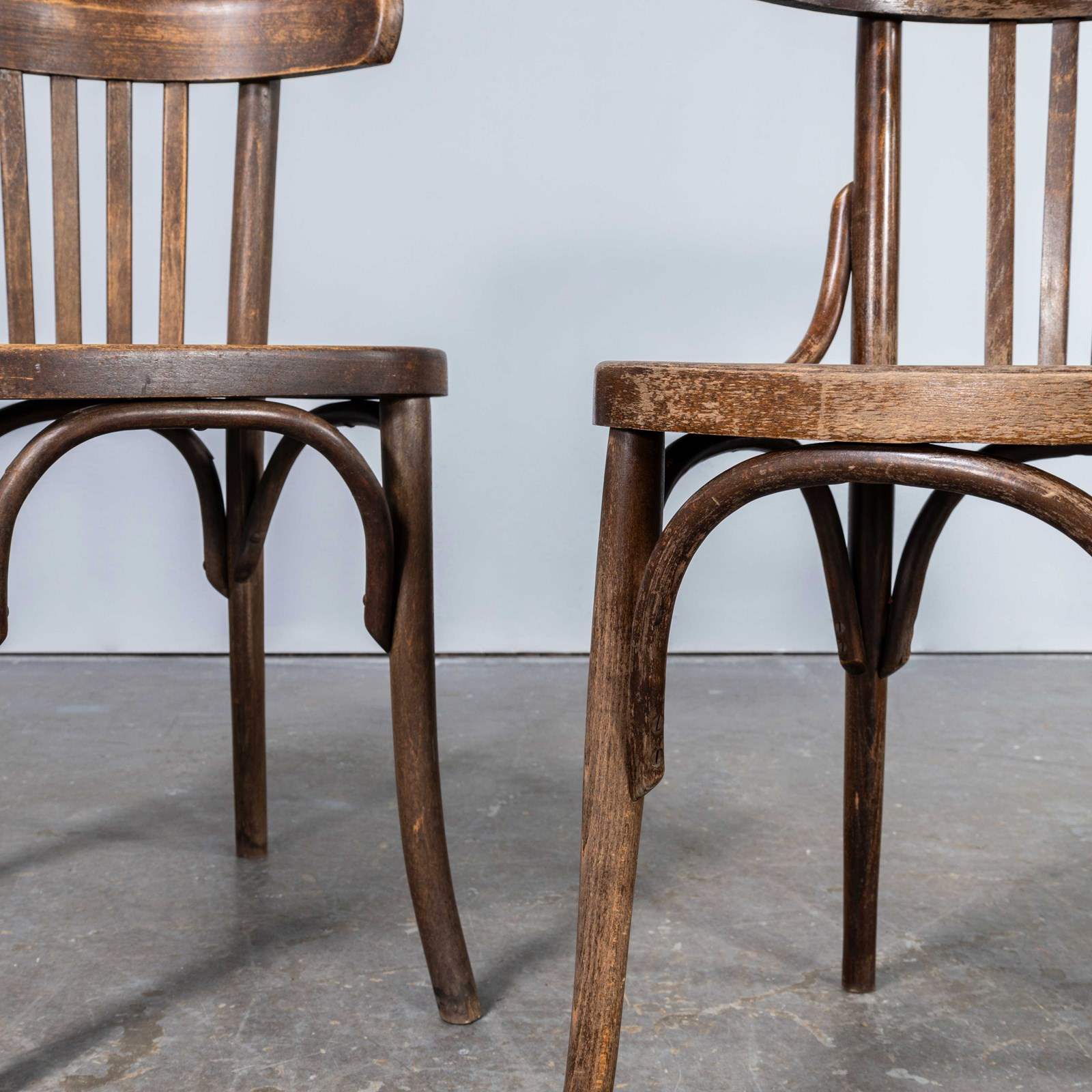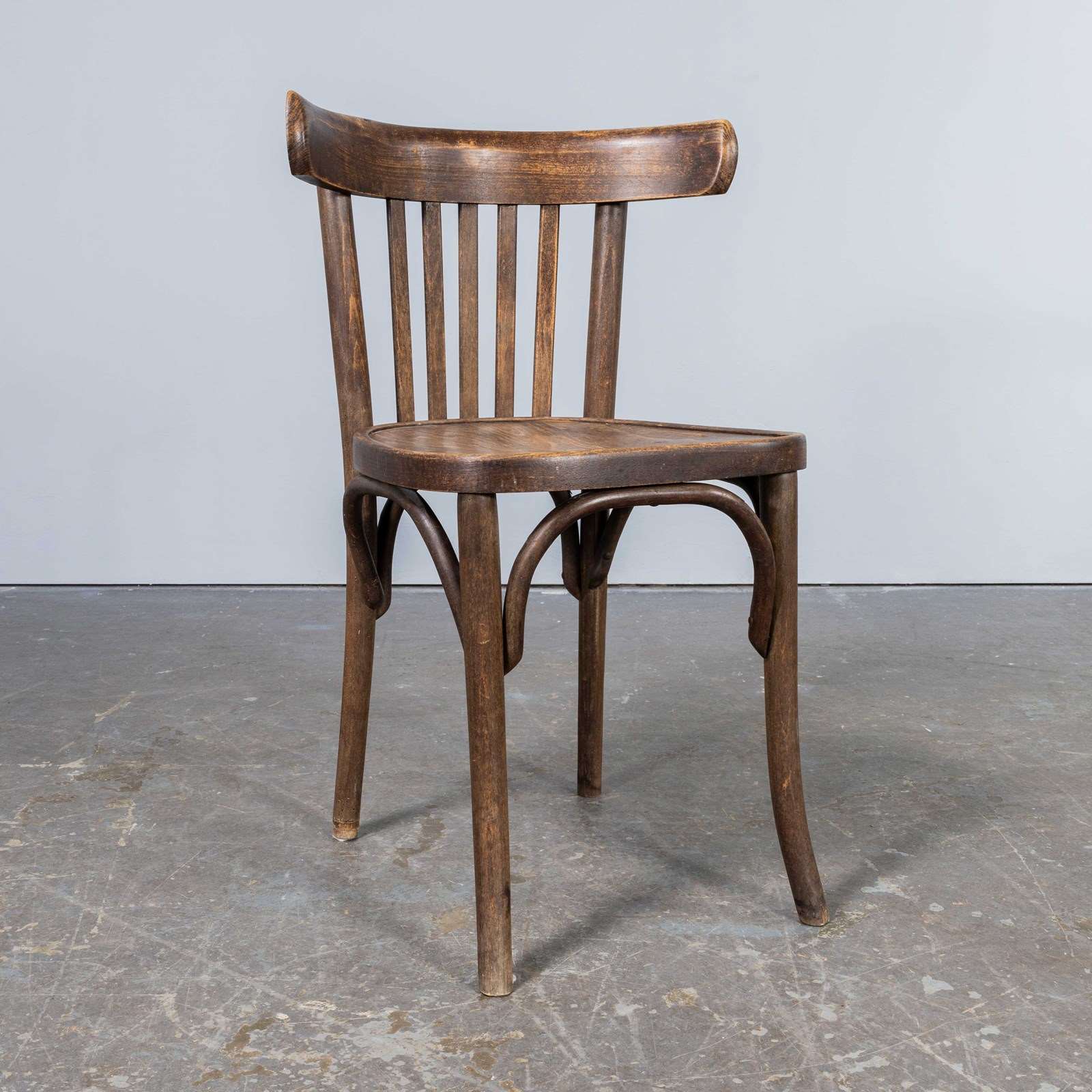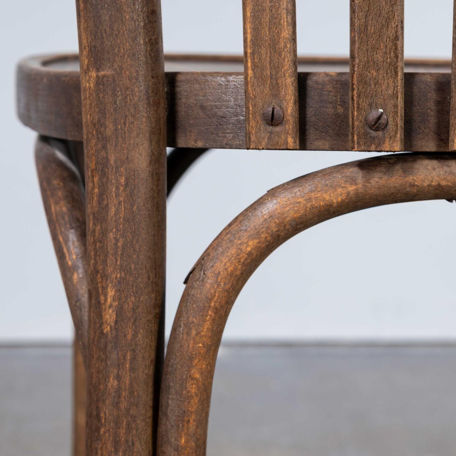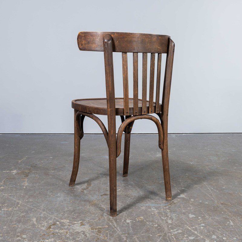 1960's Saddle Back Faded Bentwood Dining Chair - Set Of Six. Good quality set of classic bentwood chairs with a wide saddle back design. The chairs were made in Eastern Europe using solid steam bent beech, they are a faded mid oak colour with a lovely wear and age. Each chair is serviced individually in our own workshops. Seat height 45cm.
