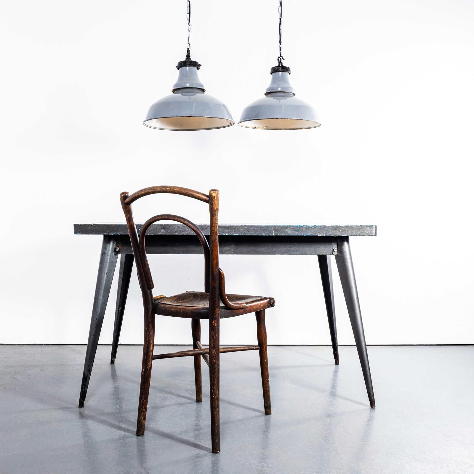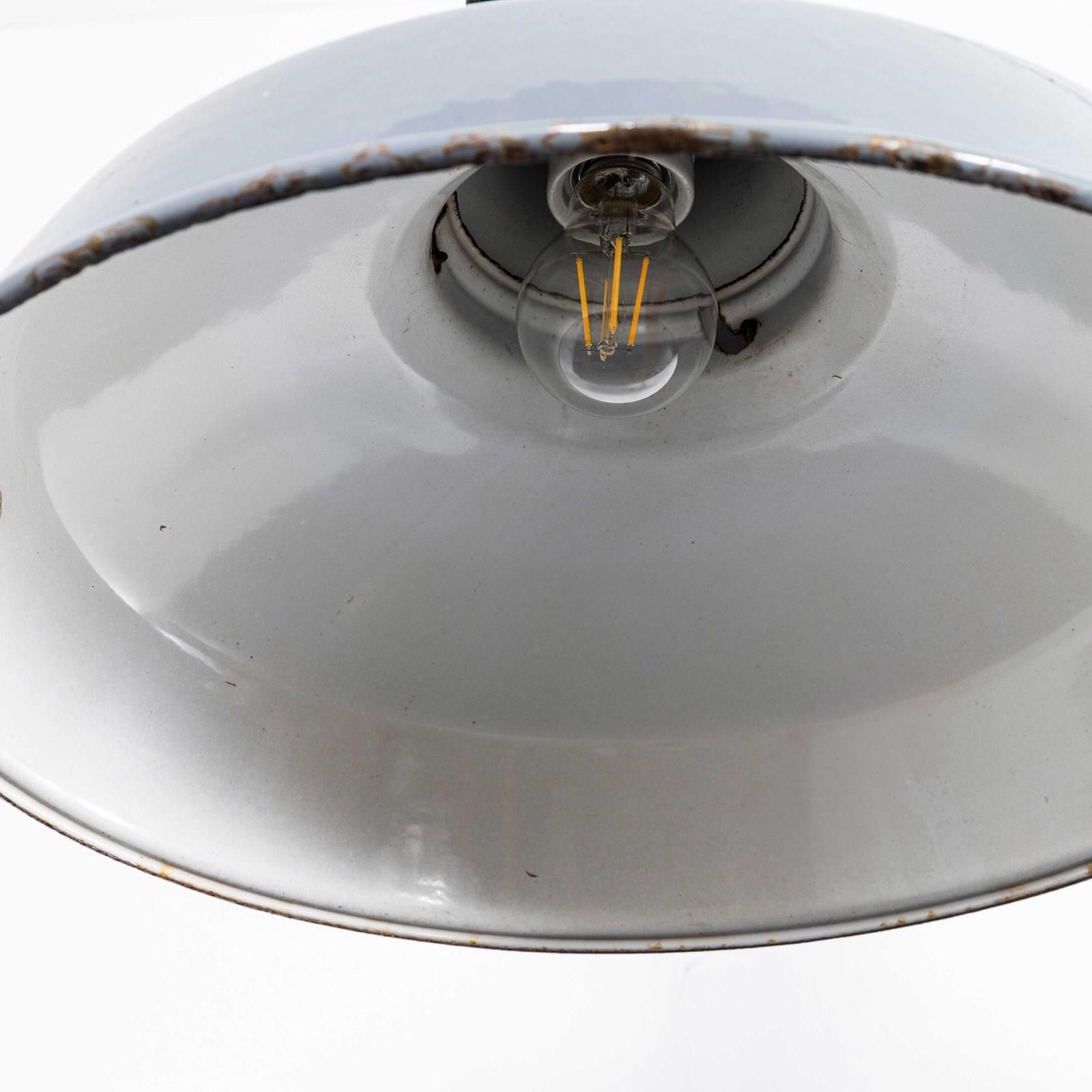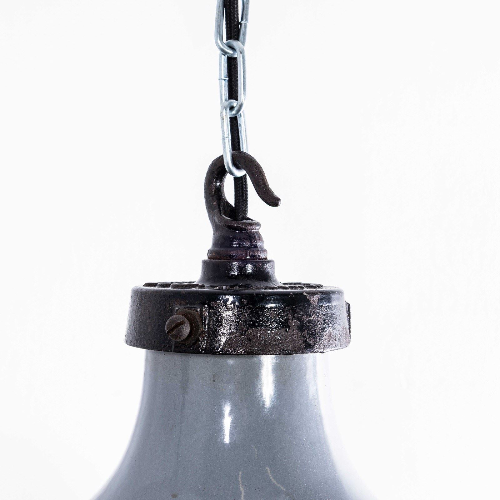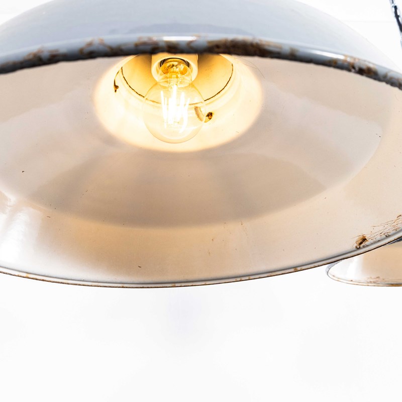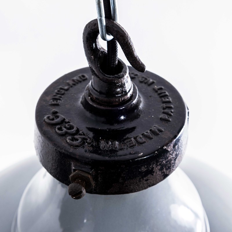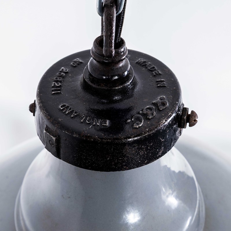 GEC, or The General Electric Company, had a significant history in the development of lighting in Britain. Founded in 1886, it was a major electrical component manufacturer and a large supplier of lighting for various applications, including industrial, commercial, and even street lighting. Made from spun and enamelled steel with intricate cast aluminium tops. The lamps were covered in paint, grease and dirt which was removed to reveal lamps in exceptional original condition. Each lamp has been cleaned and restored and all electrical components have been removed and replaced with modern European CE standard components to BS EN 60598. Each lamp is individually tested and labelled to BS EN 60598. INCLUDED: Each lamp comes completely wired and ready to install including; 2 metres of chain for hanging the lamps, 2 metres of black silk covered electrical cable and a ceiling hook as shown. The lamp is fitted with a standard E27 threaded lamp holder for which a wide range of modern and vintage style filament bulbs are widely available. We do not currently sell bulbs and recommend LED bulbs 6W maximum. We select the best colour/style of cable for each lamp but additional colours are available for different projects. Our alternative cable colours (in stock) are as shown in the images with numbered cables. If you wish to select a different cable colour please state the colour number in the comments at checkout. Additional special order colours are available and we can also supply more than 2 metres of hanging cable/wire/chain etc as required, please contact us separately to discuss. We are specialists in refurbishment of vintage lighting, please contact us with any questions regarding purchase or installation. The lamp is currently wired and fitted for UK and EU compliance. The lamp can be wired for compliance in the US or any global market.