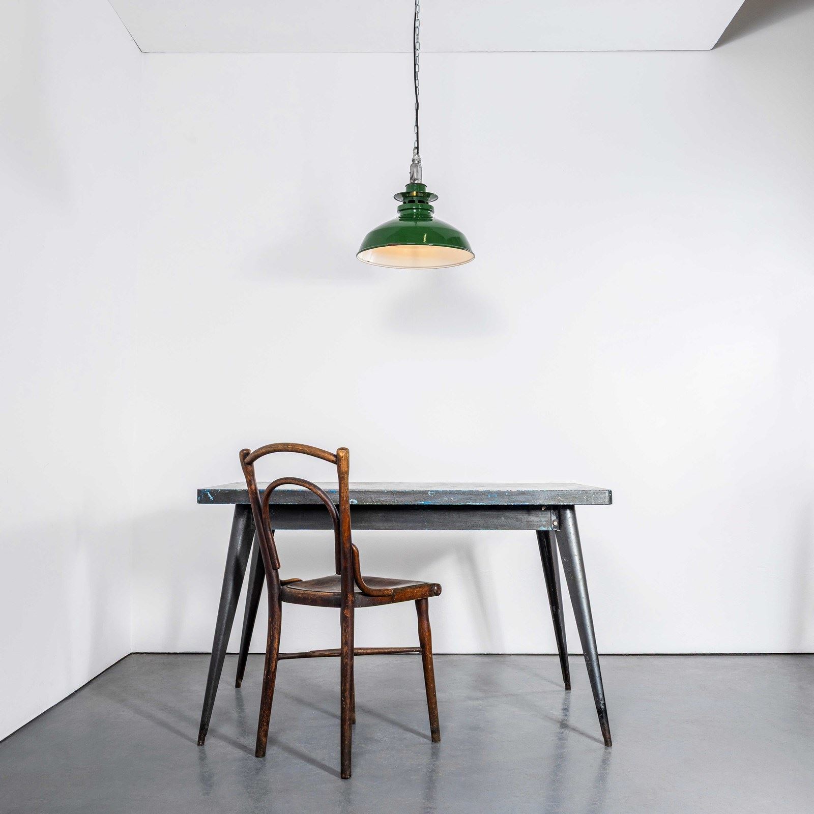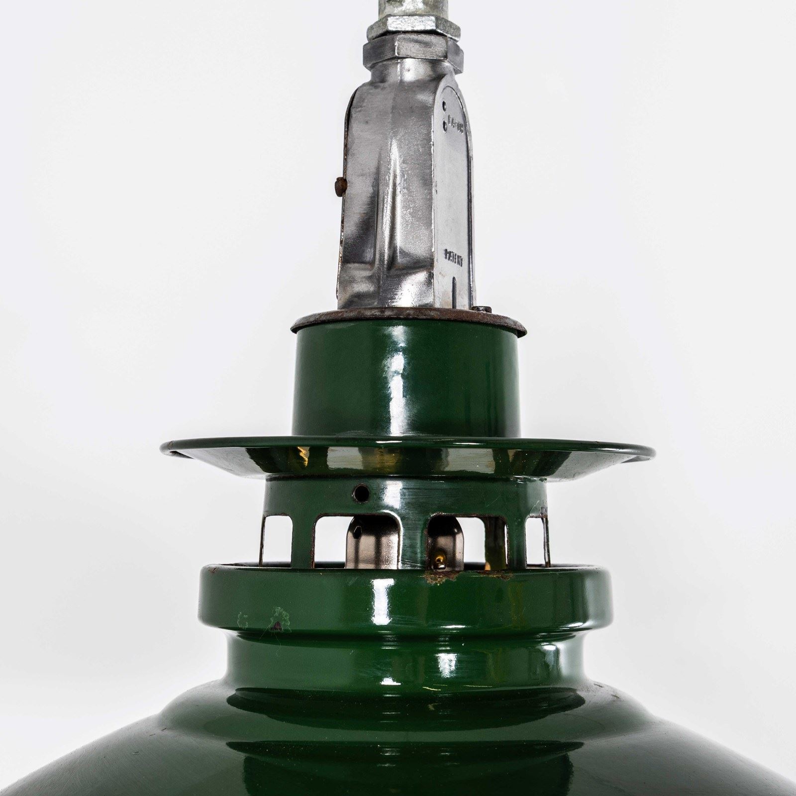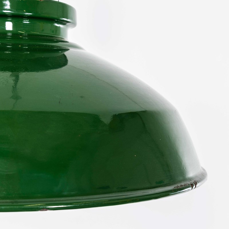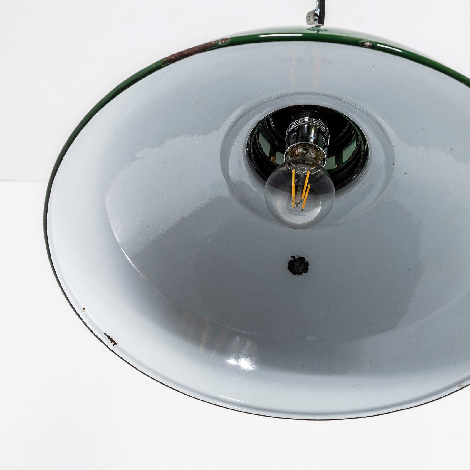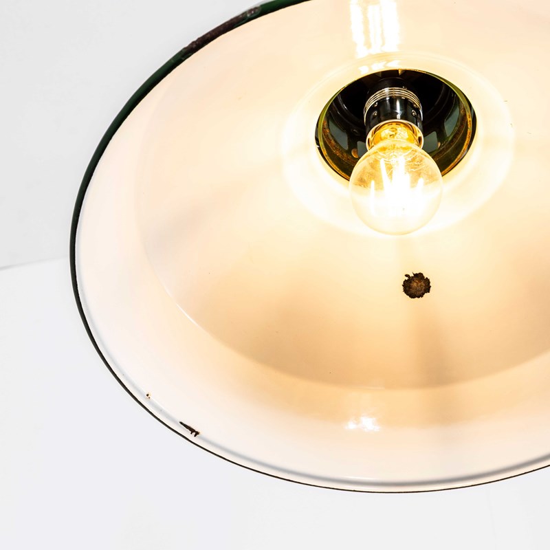 Thorlux was one of the leading enamelled lamp producers in England, still trading to this day. In exceptional original condition, the gallery has been stripped brushed and sealed. The lamp has been cleaned and restored and all electrical components have been removed and replaced with modern European CE standard components to BS EN 60598. Each lamp is individually tested and labelled to BS EN 60598. INCLUDED: The lamp comes completely wired and ready to install including; 2 metres of chain for hanging the lamps, 2 metres of black silk covered electrical cable and a ceiling hook as shown. The lamp is fitted with a standard E27 threaded lamp holder for which a wide range of modern and vintage style filament bulbs are widely available. We do not currently sell bulbs and recommend LED bulbs 6W maximum. We can supply more than 2 metres of hanging cable/wire/chain etc. as required, please contact us separately to discuss. We are specialists in refurbishment of vintage lighting, please contact us with any questions regarding purchase or installation. Listing is for one lamp.