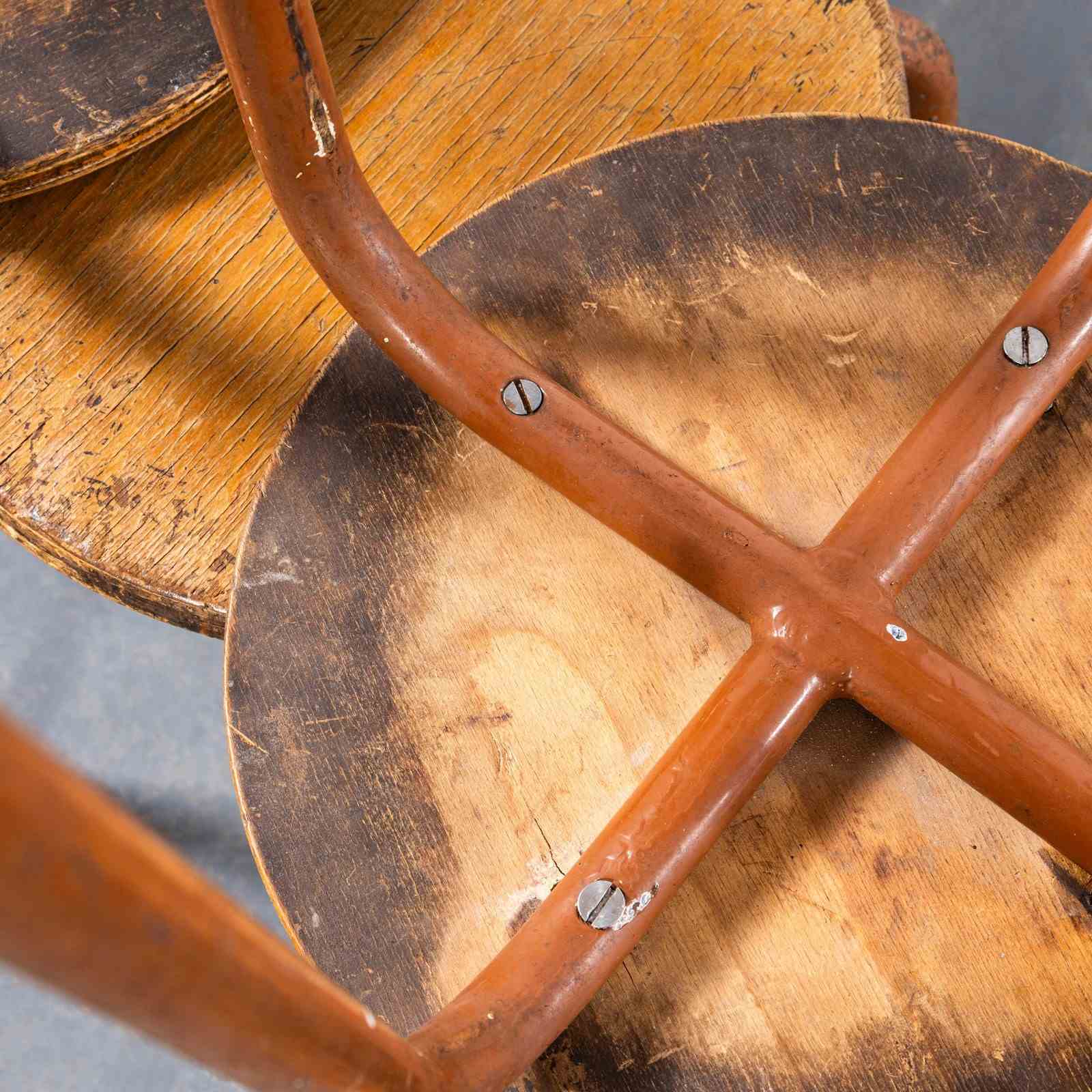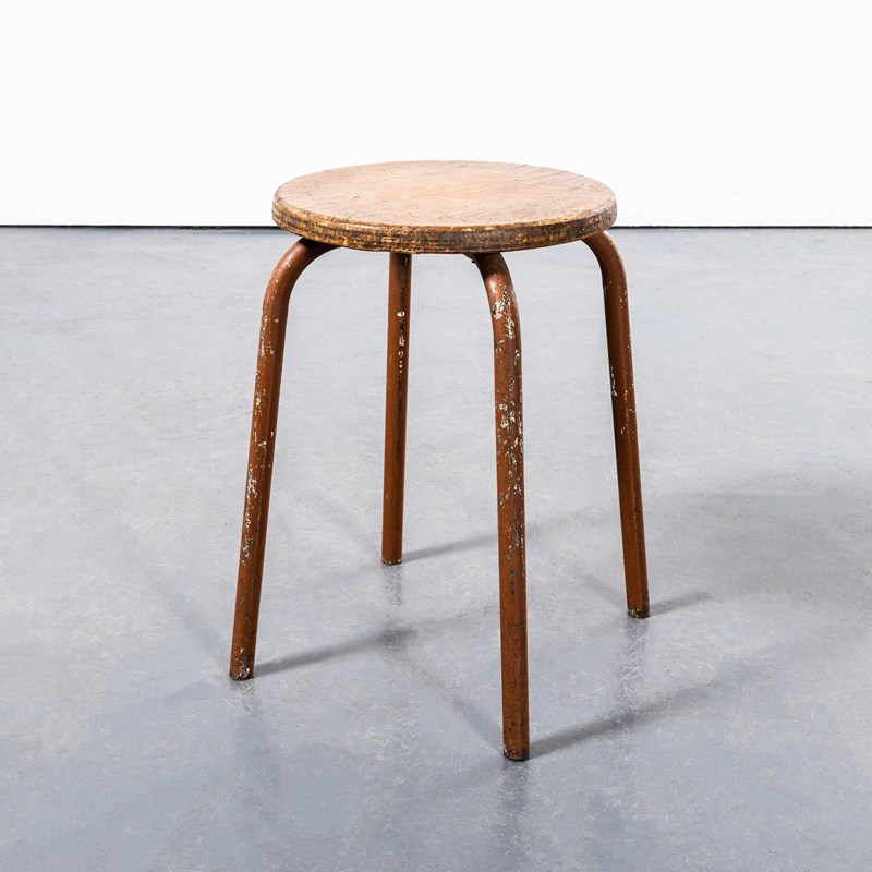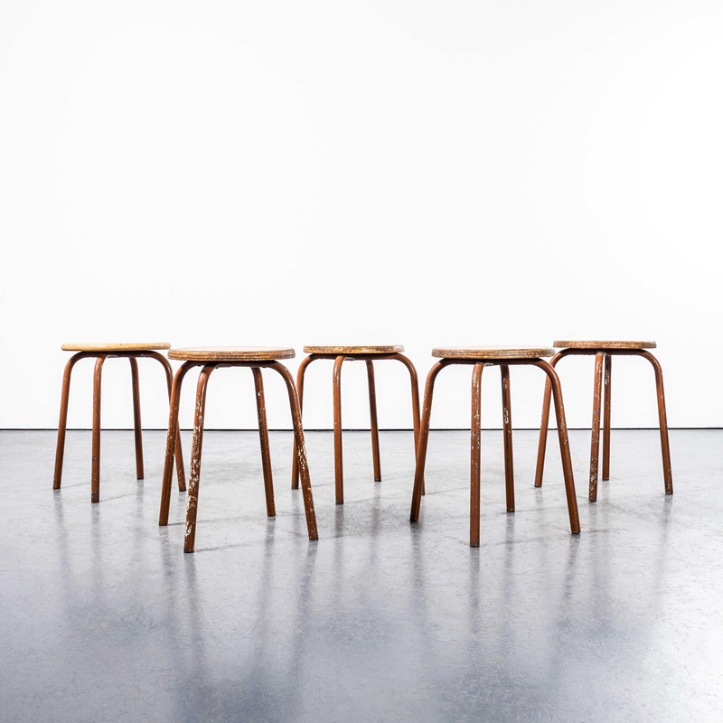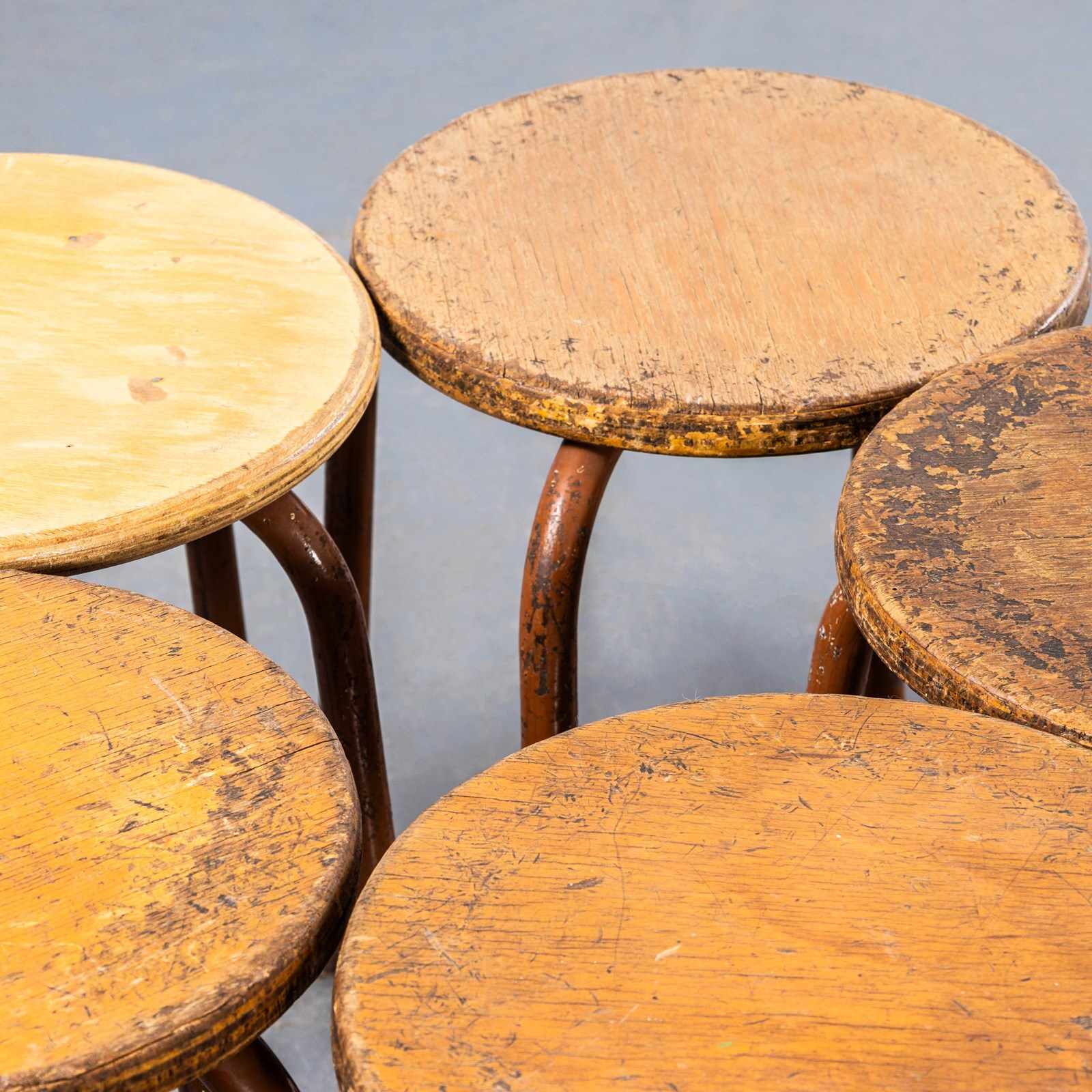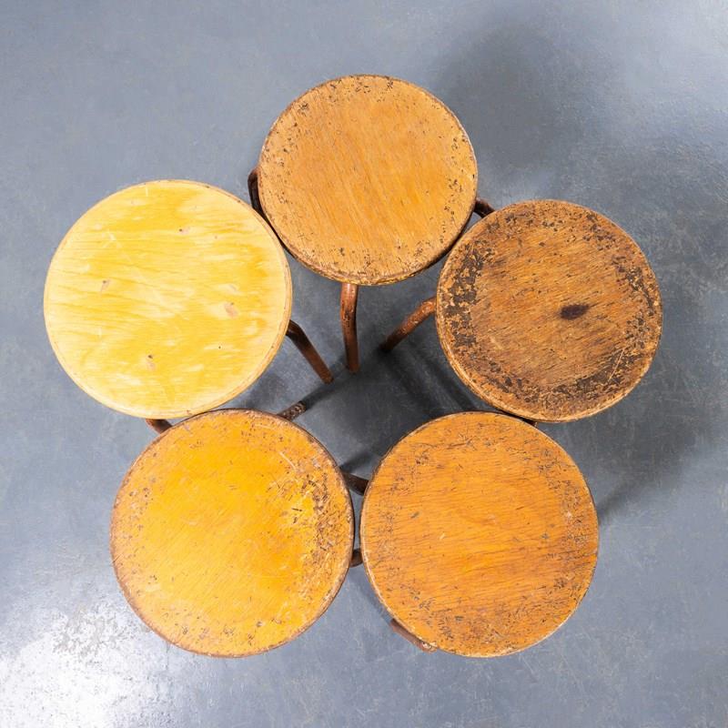 Classic French school stools, beech laminated tops with strong metal bases. Original stools with tons of character. Seat height 45cm.