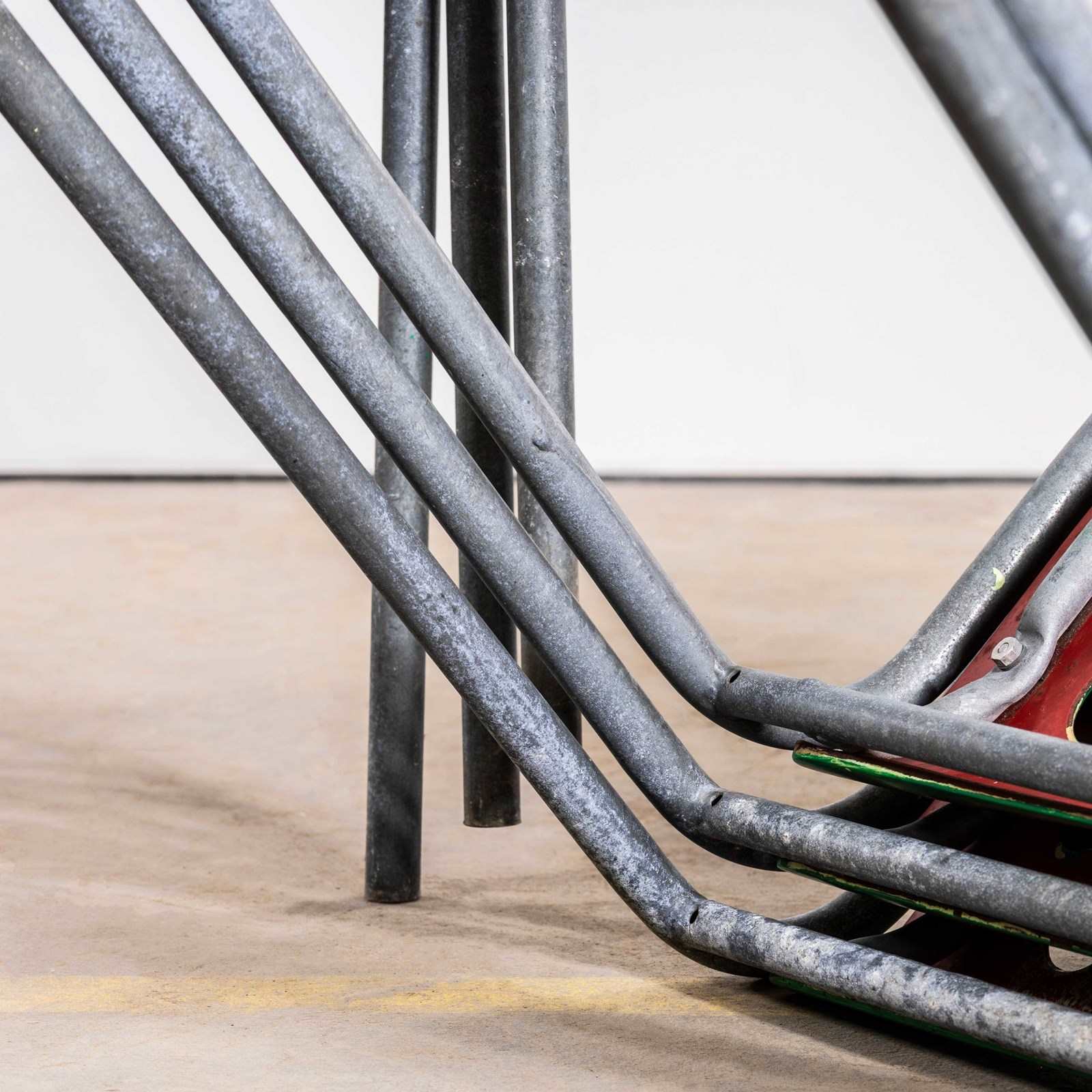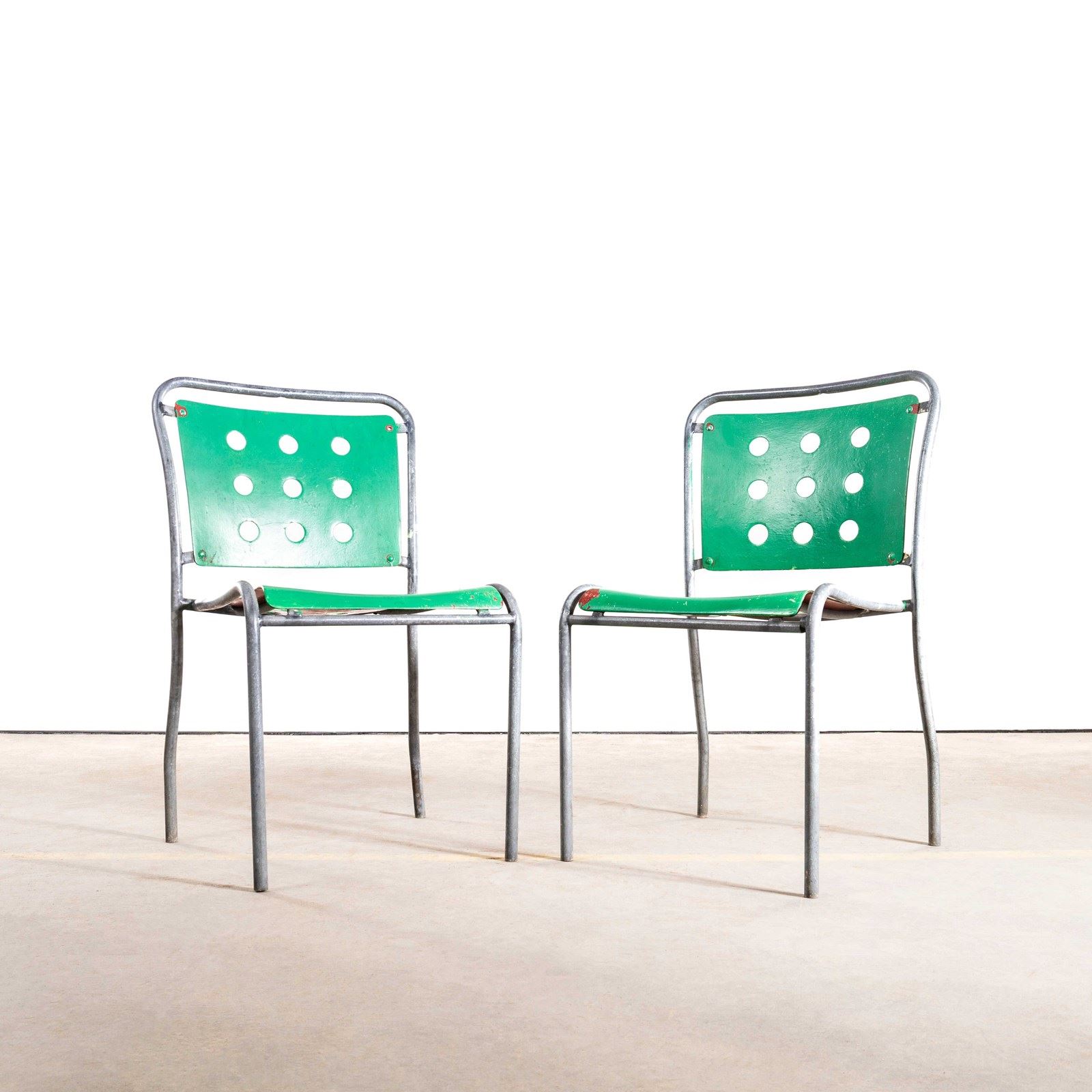 Stunning chairs from the sixties by the maker Burri from Zurich. The frames are heavy weight galvanised steel tube the seats and backs are hard pressed fiberglass, originally rust red but overpainted in a vivid green. Good practical outdoor chairs which will last outside for many a year.