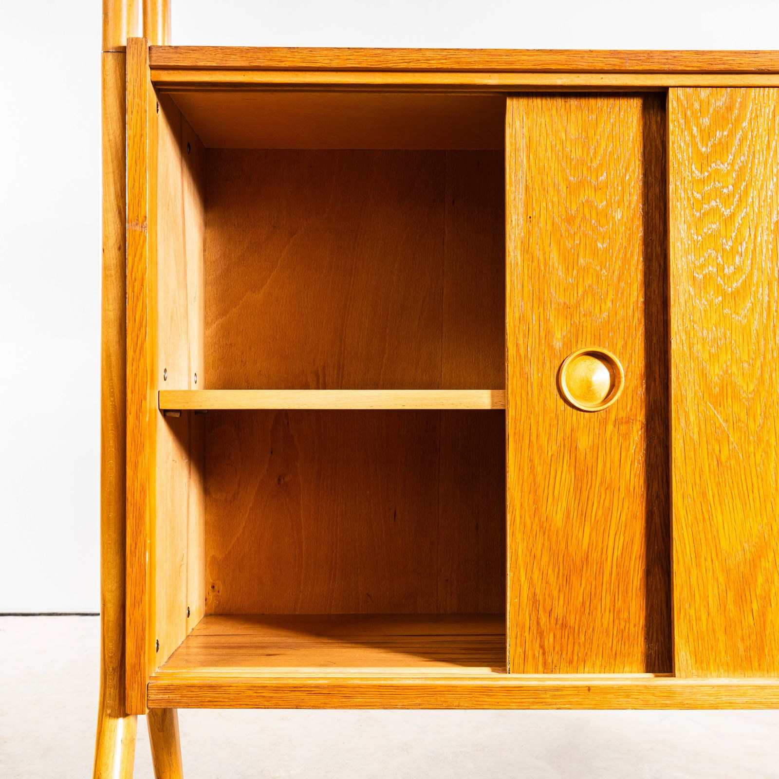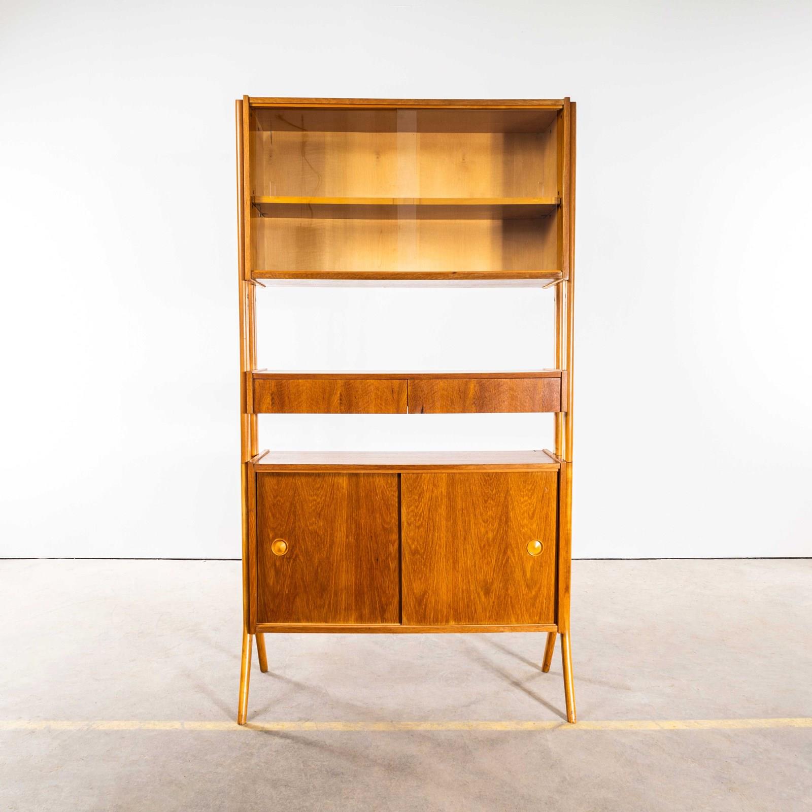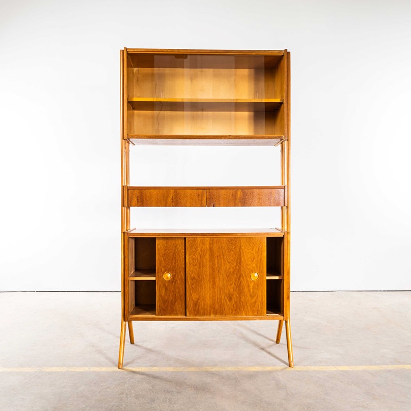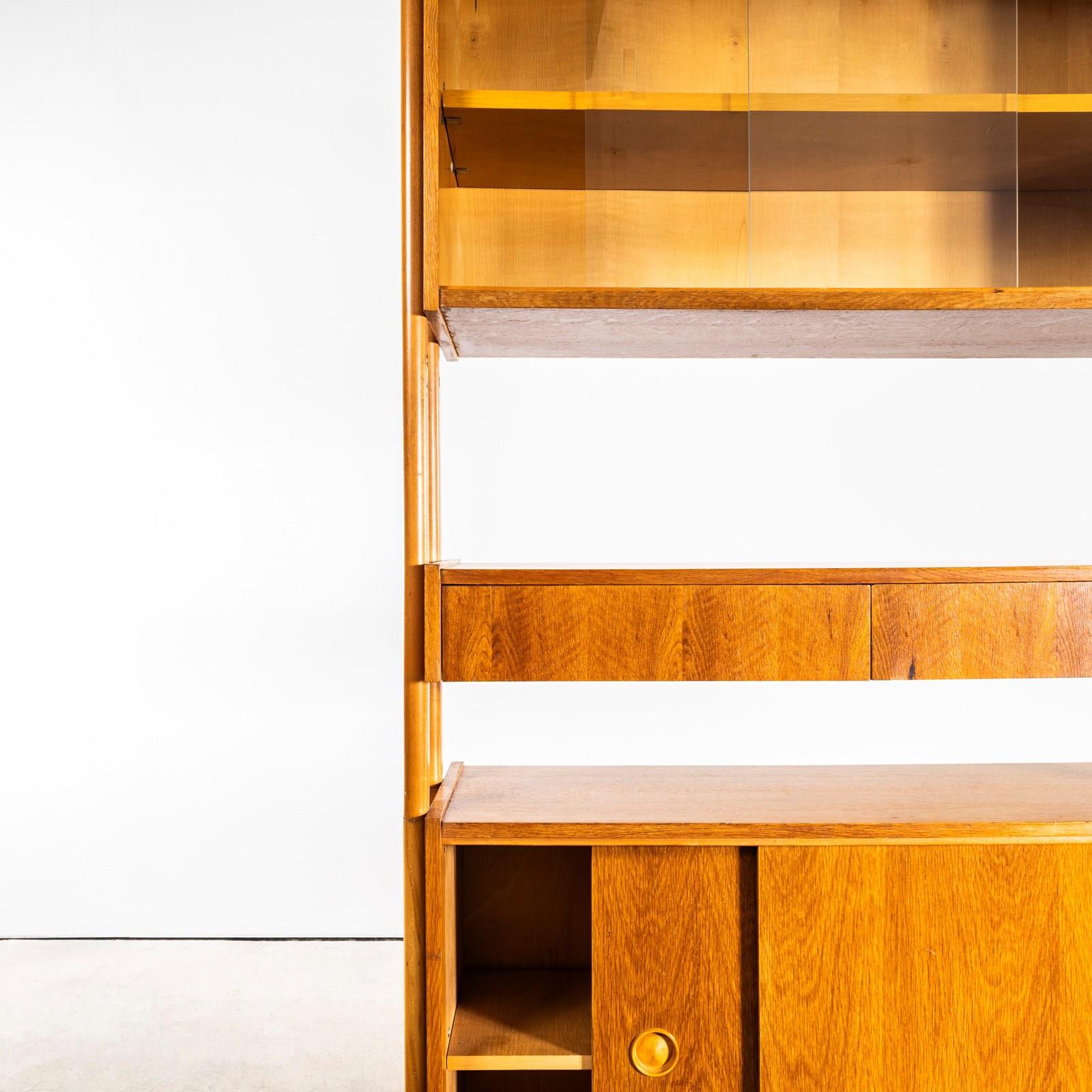 Produced by Tatra Pravenec in the Czech Republic. Czech design will always be affiliated to the Bauhaus movement which inspired a generation of design and industrial production in Czechia principally during the second half of the 20th Century with producers such as Ton and Up Zavody amongst many others. Tatra Pravenec’s origins were originally as a timber and bentwood producer and supplier of chairs, but in the boom period of post-war furniture production they developed as a sophisticated independent producer. This is a high quality practical cabinet or shelving unit with great storage. In exceptional original condition the unit has been sensitively restored in our own workshop. Designed by Frantisek Jirak. The top features a cabinet with an adjustable shelf and two sliding glass doors. The centre section has two drawers. The bottom is a cabinet with two sliding wood doors. Principally made in oak with birch and beech detail. Our workshop has gently cleaned, waxed and serviced the unit, the doors run smoothly and the shelving is stable and practical.