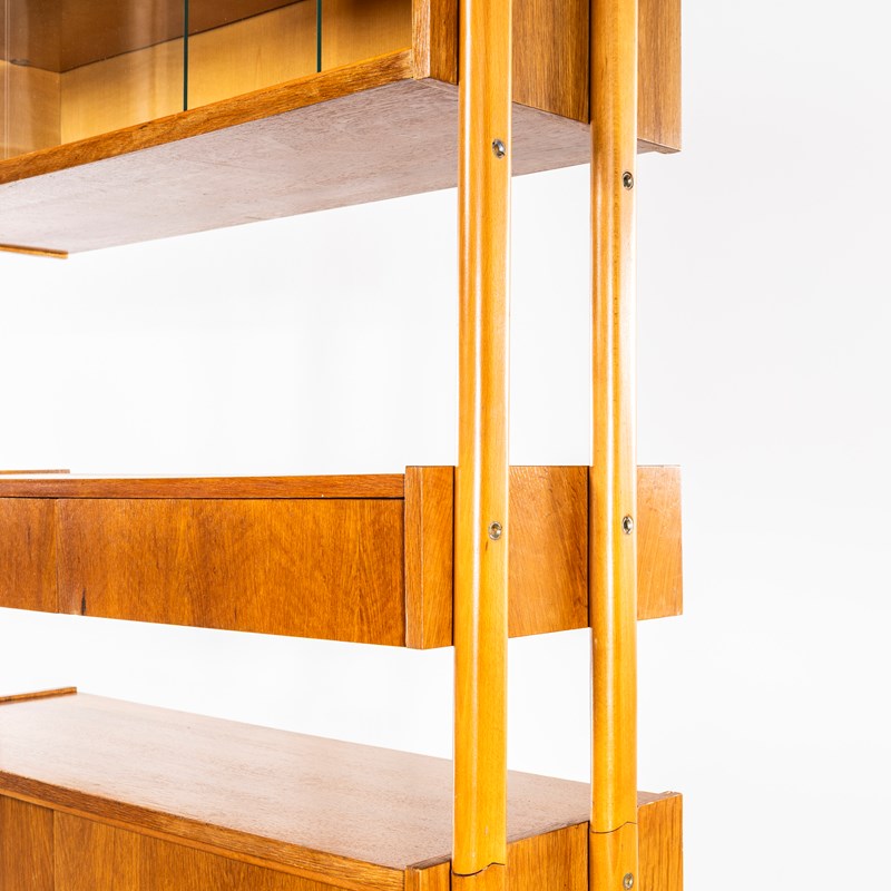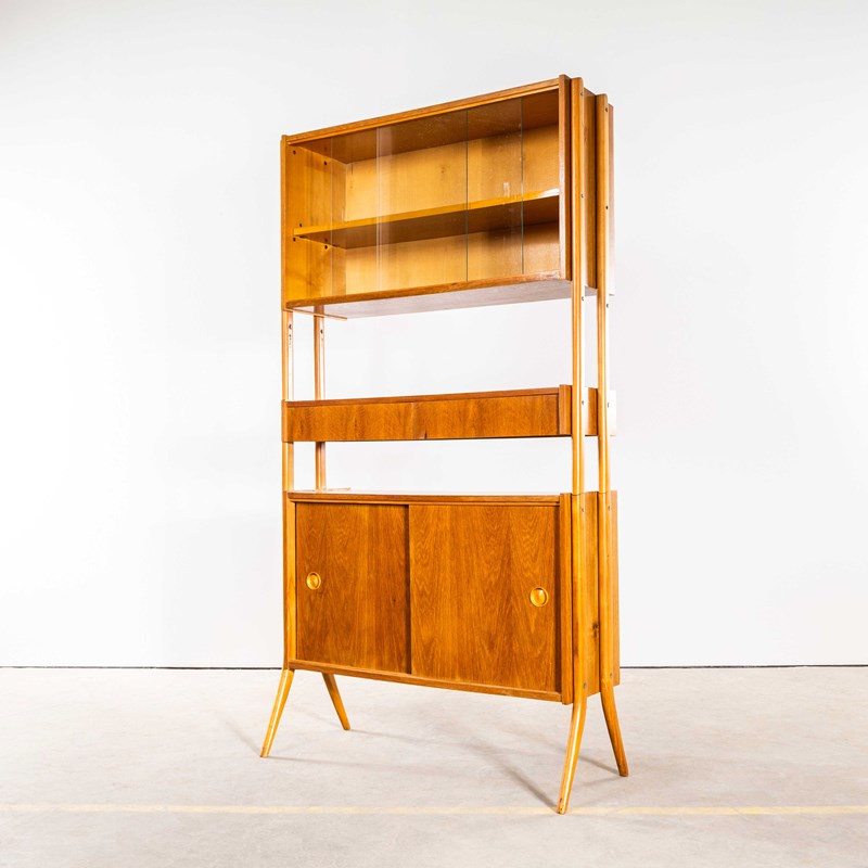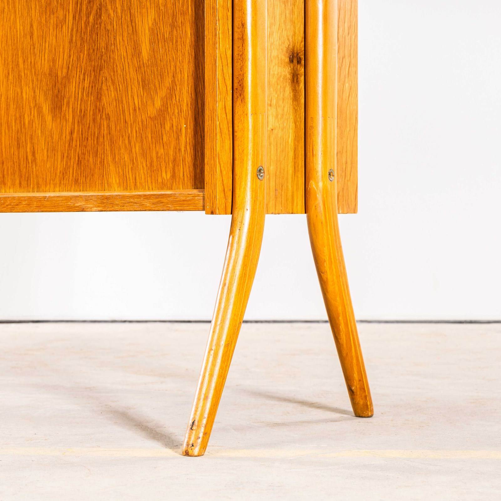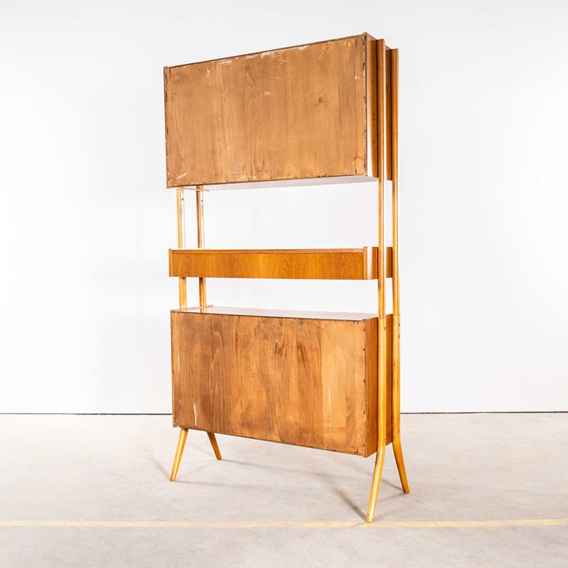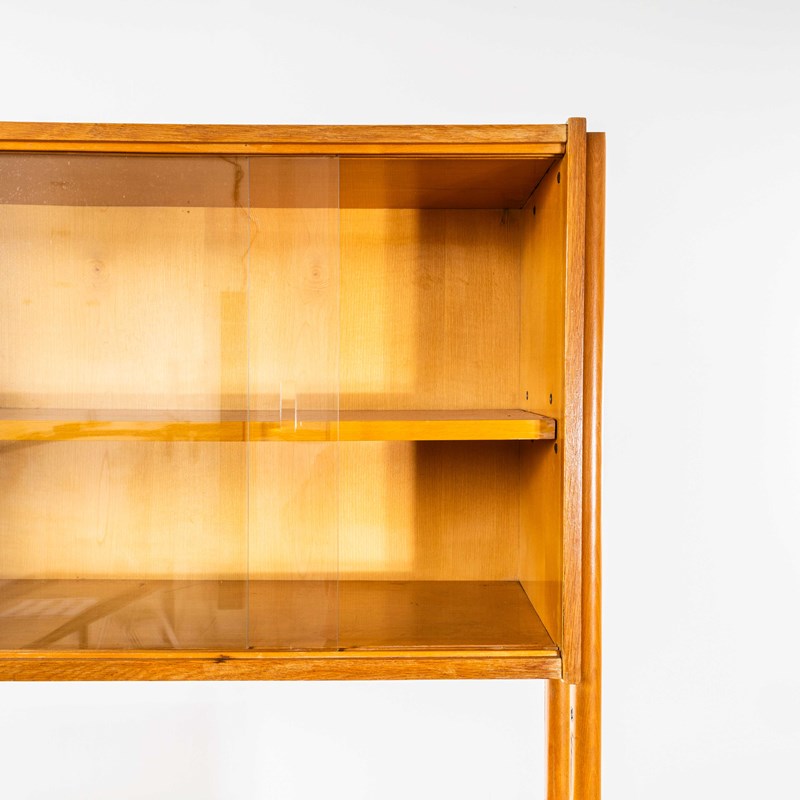 Produced by Tatra Pravenec in the Czech Republic. Czech design will always be affiliated to the Bauhaus movement which inspired a generation of design and industrial production in Czechia principally during the second half of the 20th Century with producers such as Ton and Up Zavody amongst many others. Tatra Pravenec’s origins were originally as a timber and bentwood producer and supplier of chairs, but in the boom period of post-war furniture production they developed as a sophisticated independent producer. This is a high quality practical cabinet or shelving unit with great storage. In exceptional original condition the unit has been sensitively restored in our own workshop. Designed by Frantisek Jirak. The top features a cabinet with an adjustable shelf and two sliding glass doors. The centre section has two drawers. The bottom is a cabinet with two sliding wood doors. Principally made in oak with birch and beech detail. Our workshop has gently cleaned, waxed and serviced the unit, the doors run smoothly and the shelving is stable and practical.