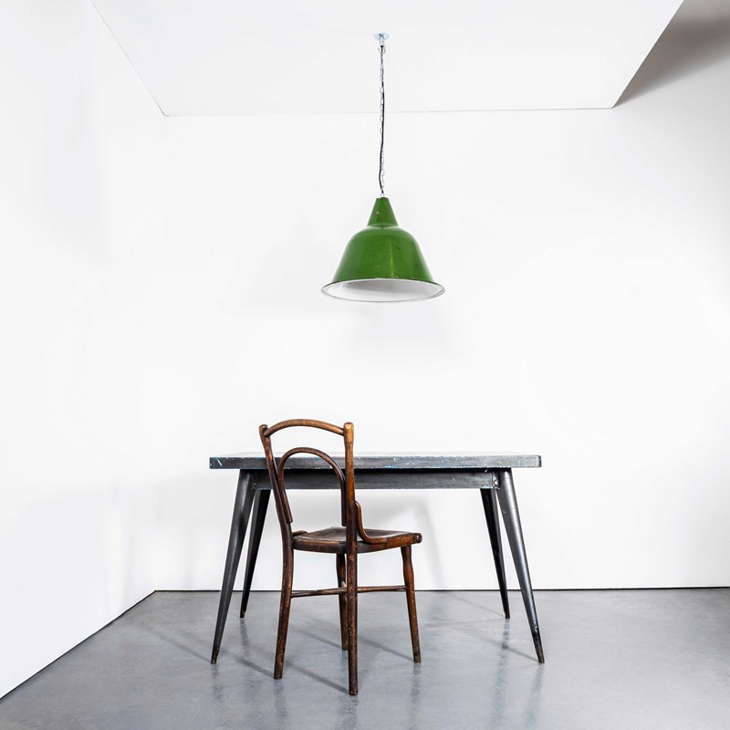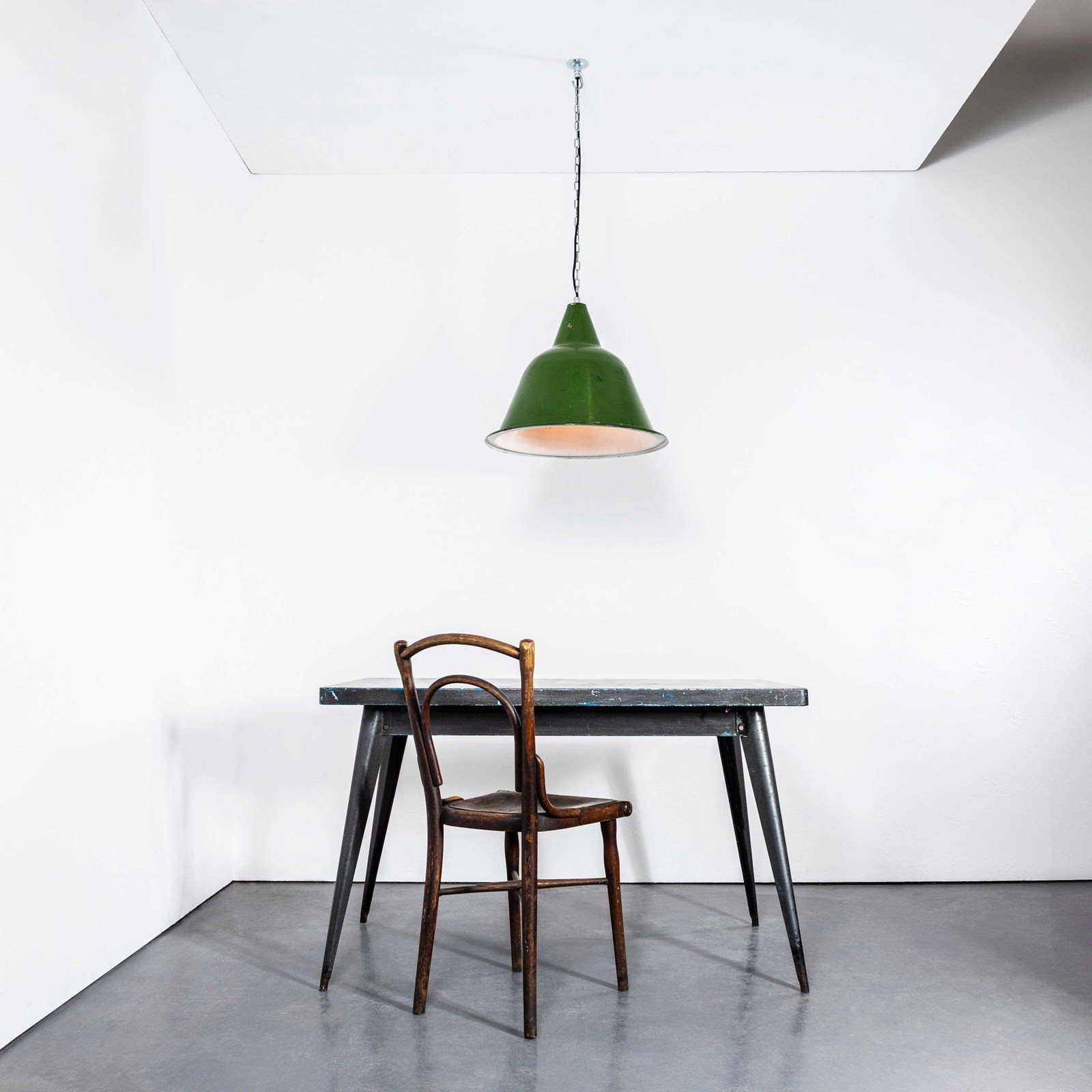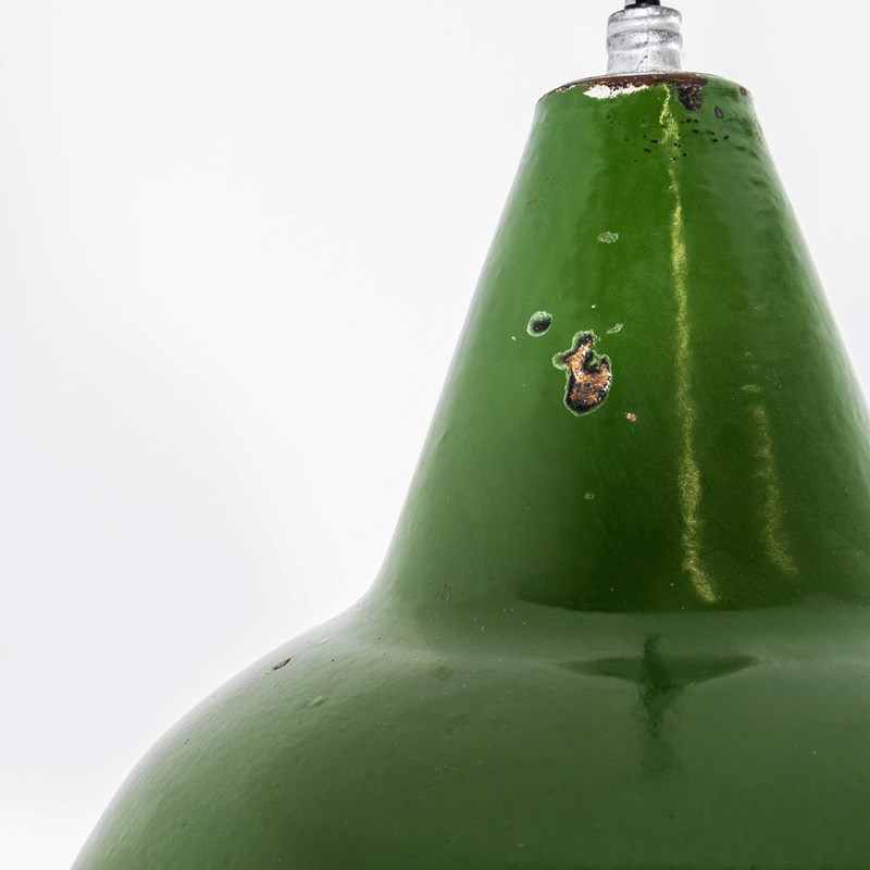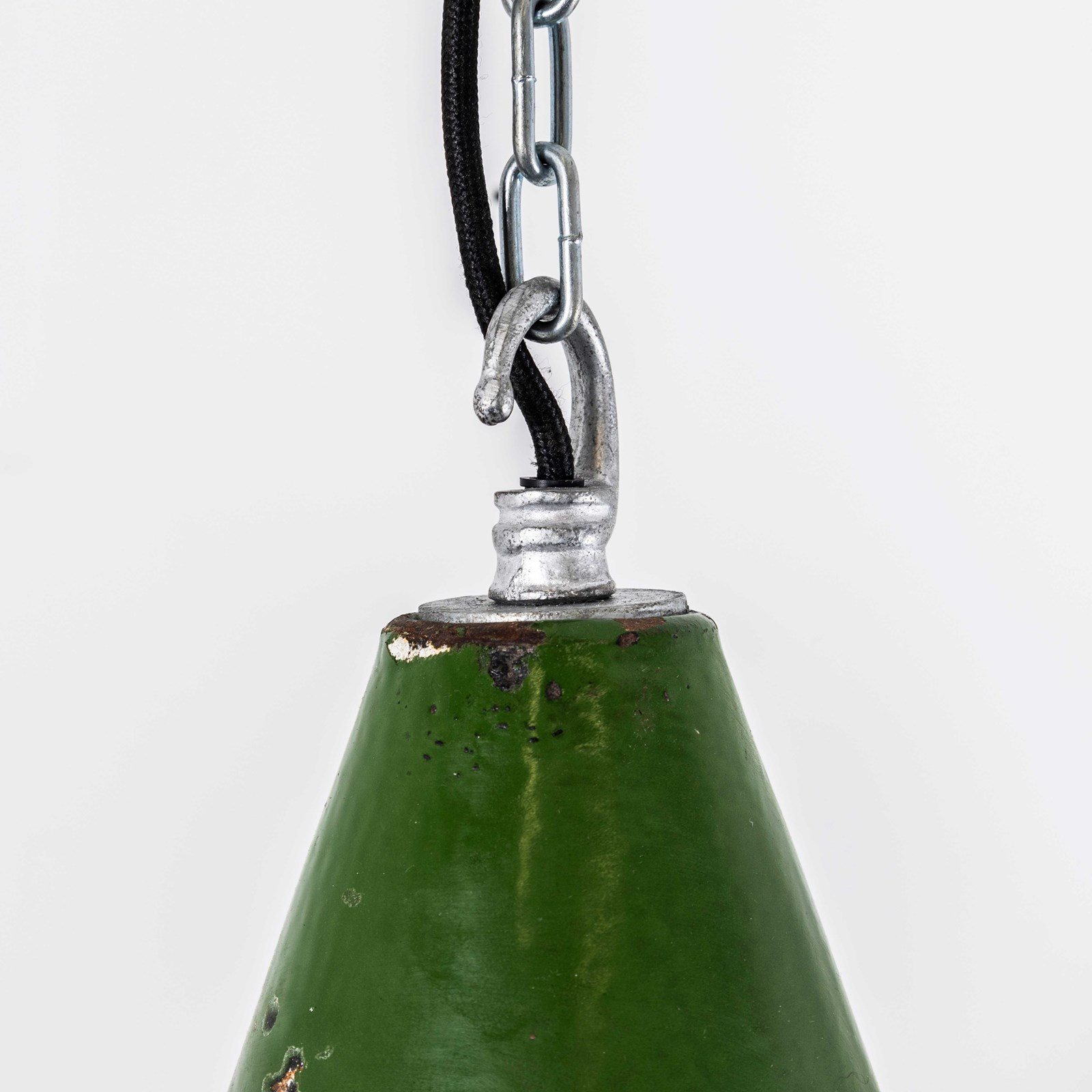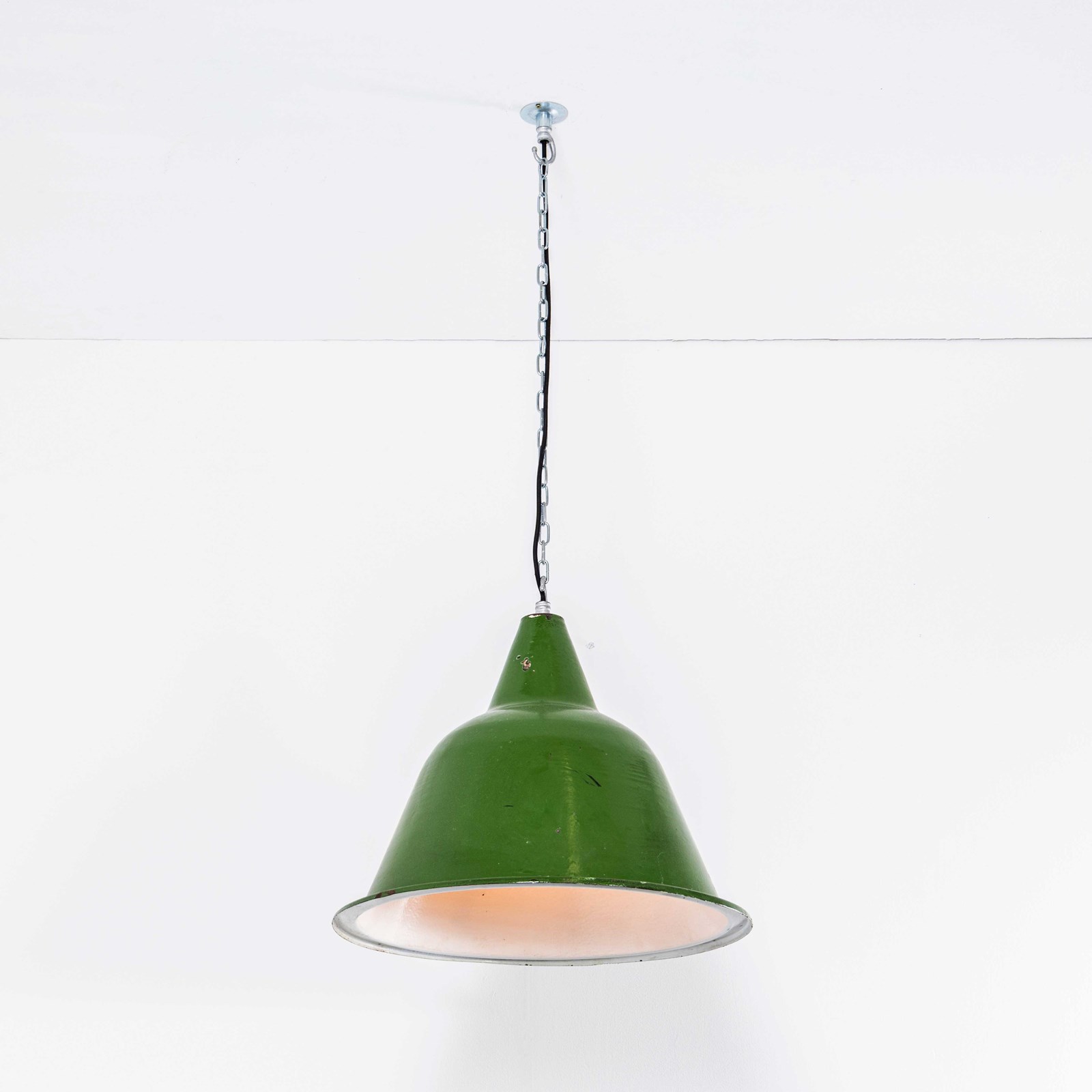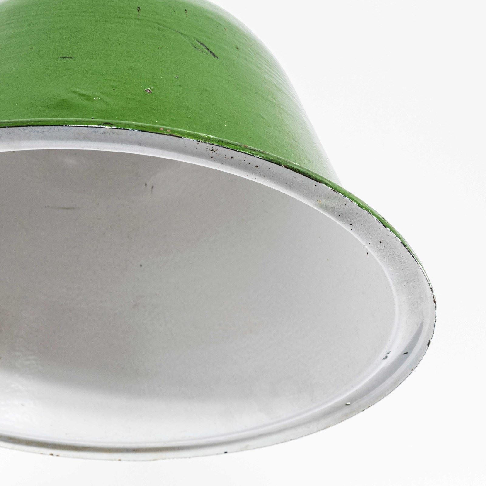 Classic industrial lamps from Eastern Europe, the shade is enamelled green, the reflective shade is white enamel. Incredible large scale lamps, approx weight 5kg. Each lamp has been cleaned and restored and all electrical components have been removed and replaced with modern European CE standard components to BS EN 60598. Each lamp is individually tested and labelled to BS EN 60598. INCLUDED: Each lamp comes completely wired and ready to install including; 2 metres of chain for hanging the lamps, 2 metres of black fabric covered electrical cable and a ceiling hook as shown. The lamp is fitted with a standard E27 threaded lamp holder for which a wide range of modern and vintage style filament bulbs are widely available. We do not currently sell bulbs and recommend LED bulbs 6W maximum. We can supply more than 2 metres of hanging cable/wire/chain etc. as required, please contact us separately to discuss.. We are specialists in refurbishment of vintage lighting, please contact us with any questions regarding purchase or installation. The lamp is currently wired and fitted for UK and EU compliance. The lamp can be wired for compliance in the US or any global market. Listing is for one lamp.