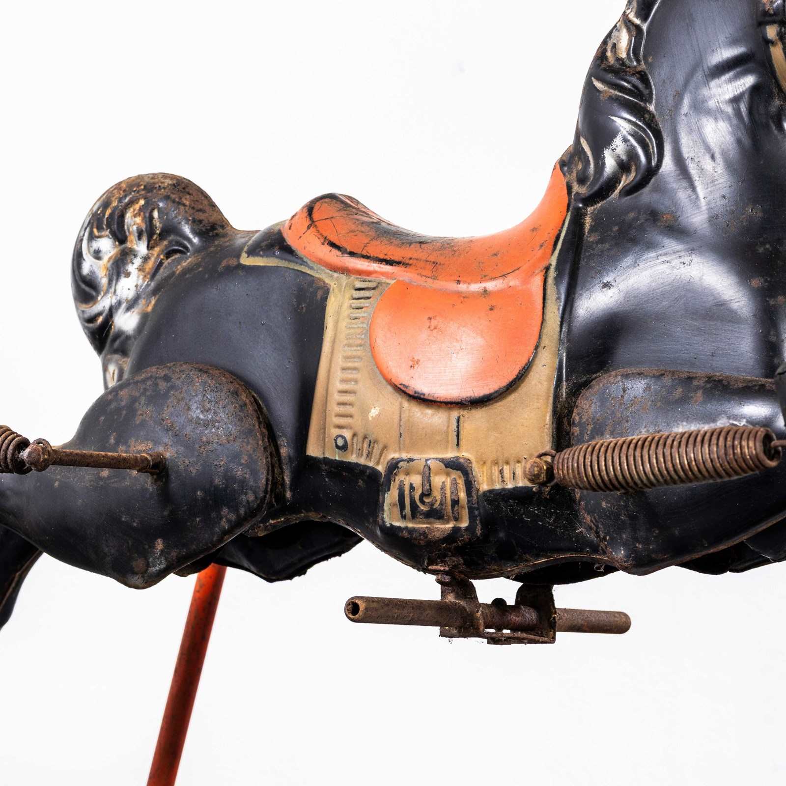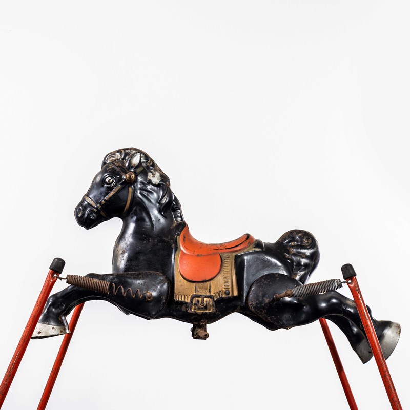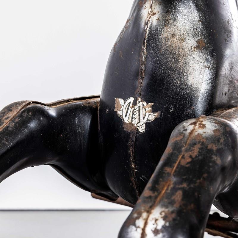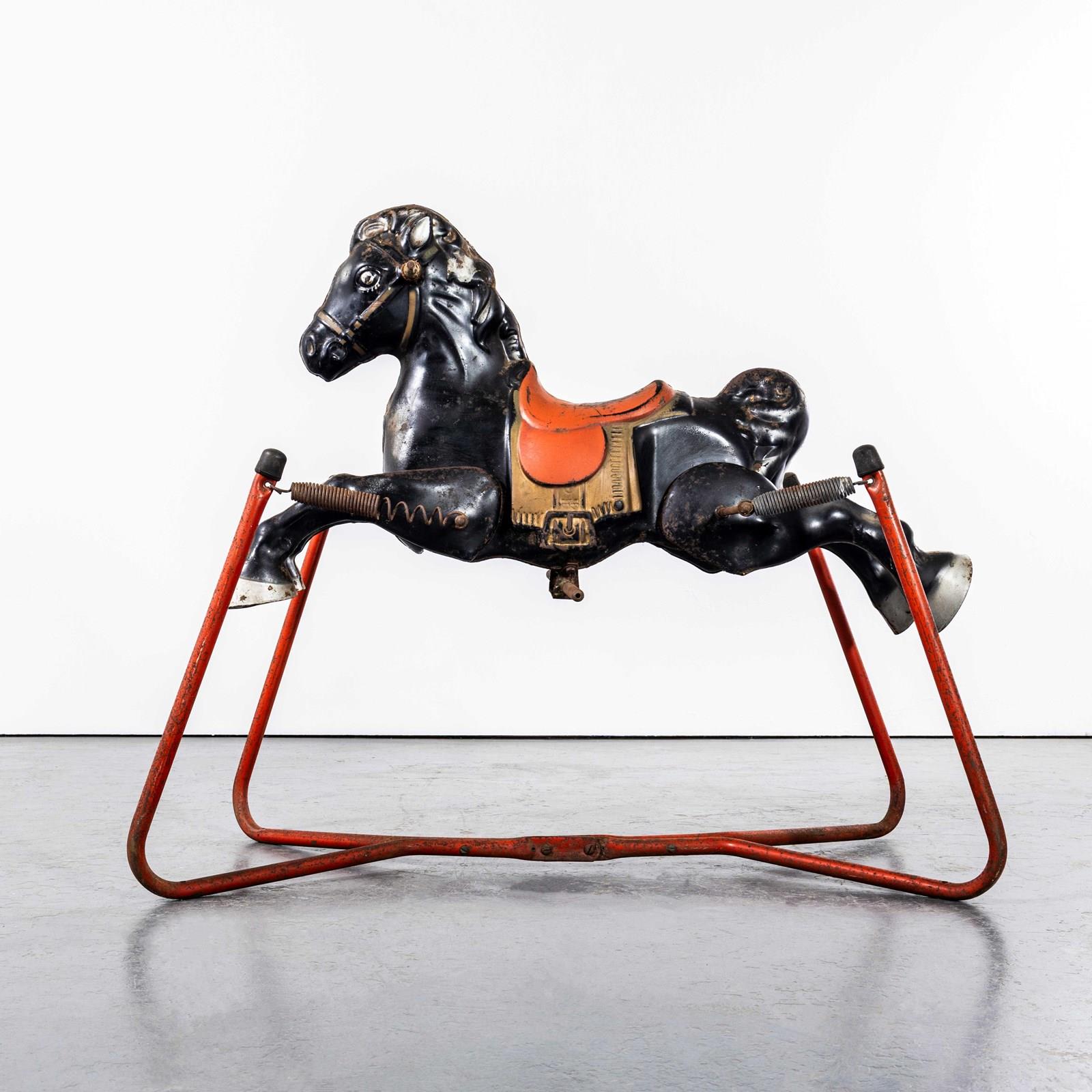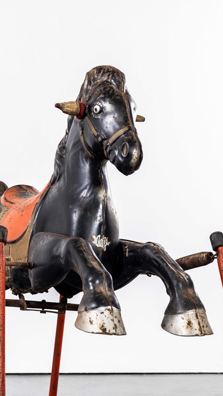 Classic pressed metal rocking horse by MOBO. MOBO started its journey with David Sebel a Russian who emigrated to England at the beginning of the 20th Century, and set up in partnership as a wheelwright in East London. The business was successful and as they grew, they expanded and Harry pioneered a new level and quality of British made toys. Manufacturing techniques developed in the war helped fuel an innovative ‘ride on’ Bronco horse powered by a quite sophisticated mechanism based on bicycle gears. The mechanism took a number of years to fully develop and was patented, the prototype clay body was sculpted by the RA artist Charles Morewood. The genius behind their toys was the mobility, ride on horses used the child’s body movements to mechanically power the toy horse along, pushing up and down on the stirrups propelled the horse. MOBO was famous for quality steel toys and is one of our favourite makers. The listing is for the horse as shown. It is sold as a stunning decorative object only. DO NOT use as a toy as it does not comply with current safety regulations and is not safe to ride on.