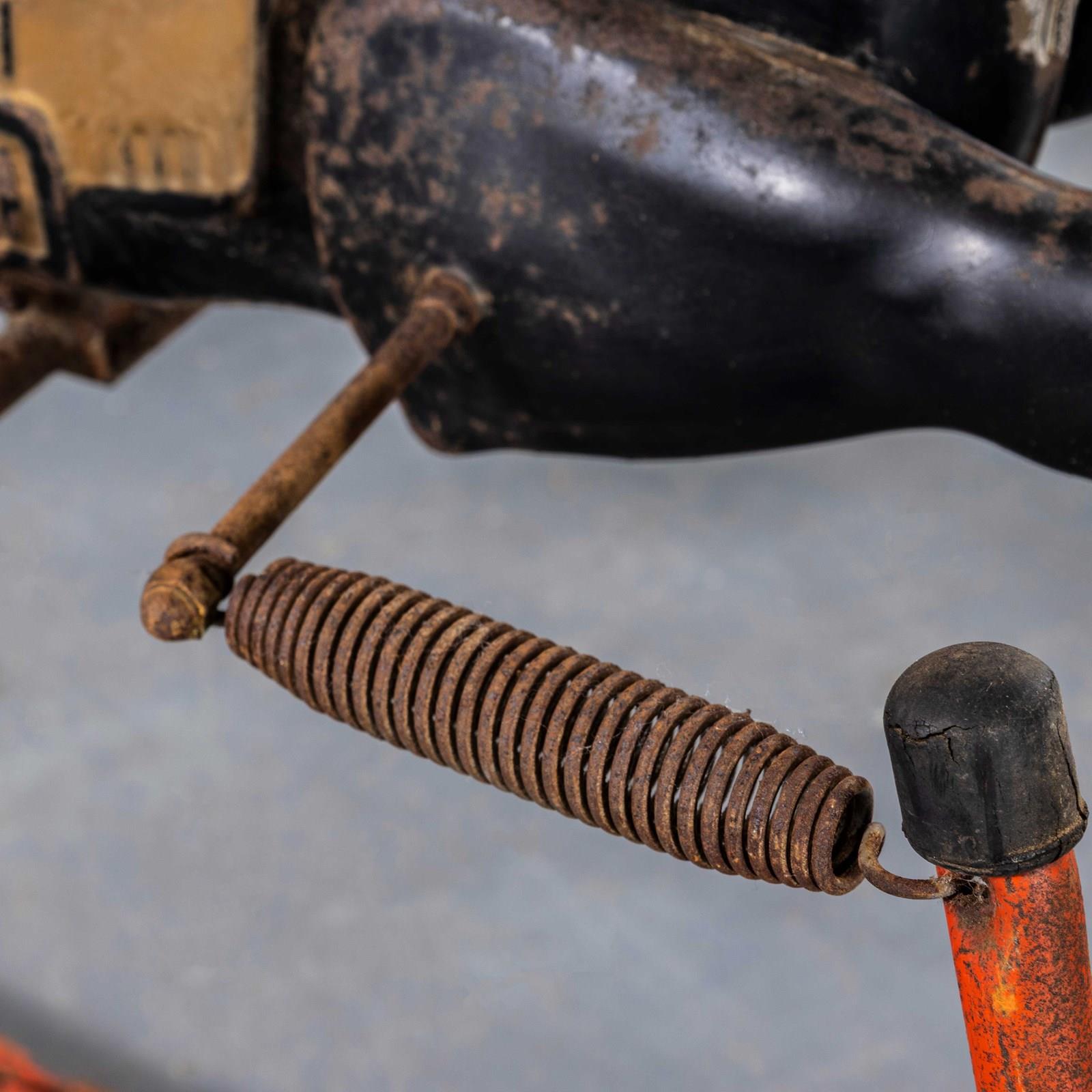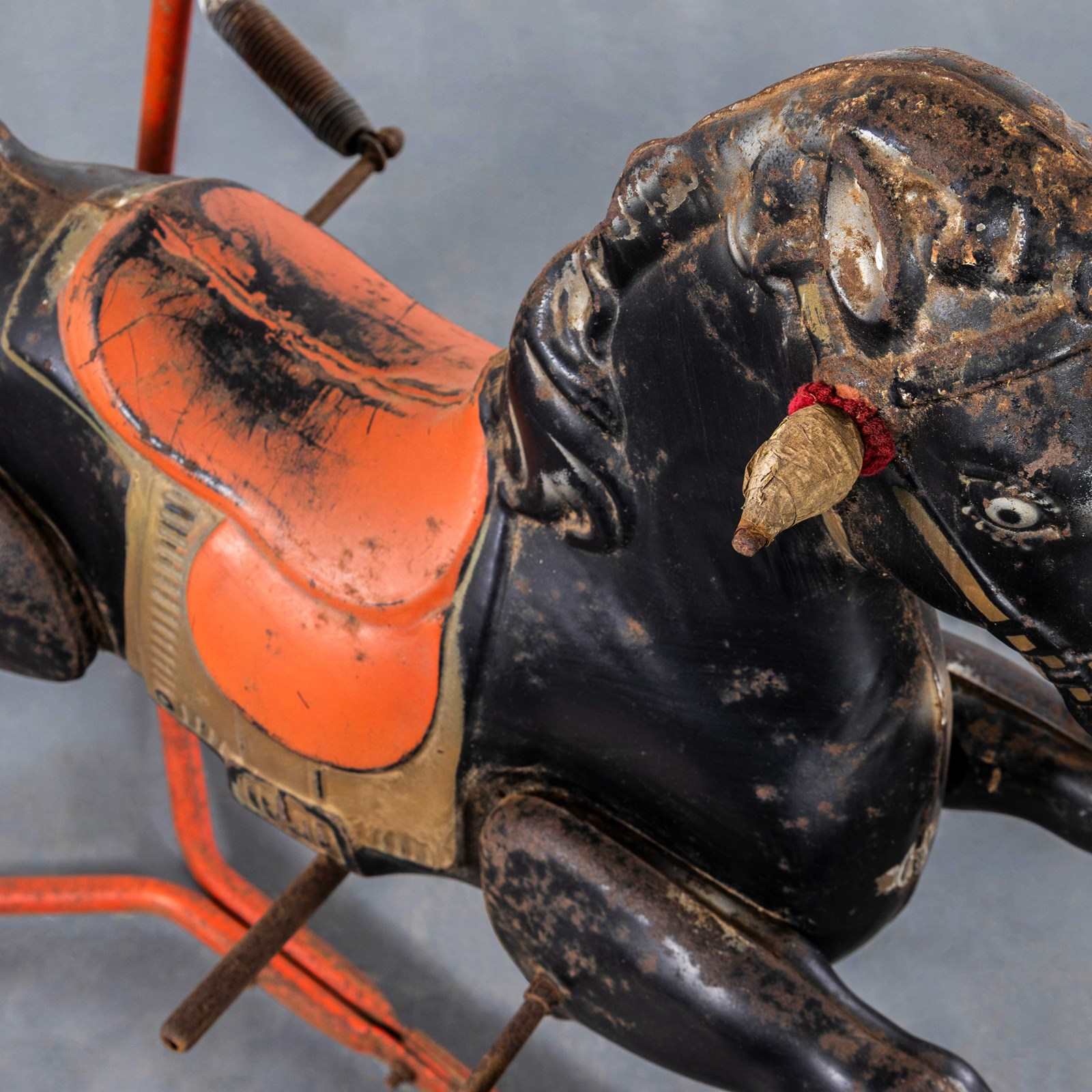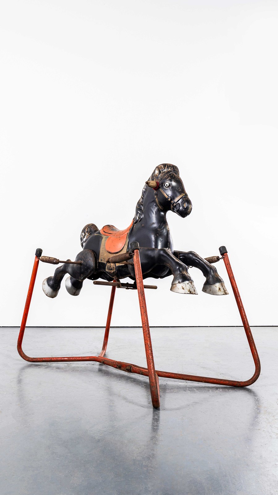 Classic pressed metal rocking horse by MOBO. MOBO started its journey with David Sebel a Russian who emigrated to England at the beginning of the 20th Century, and set up in partnership as a wheelwright in East London. The business was successful and as they grew, they expanded and Harry pioneered a new level and quality of British made toys. Manufacturing techniques developed in the war helped fuel an innovative ‘ride on’ Bronco horse powered by a quite sophisticated mechanism based on bicycle gears. The mechanism took a number of years to fully develop and was patented, the prototype clay body was sculpted by the RA artist Charles Morewood. The genius behind their toys was the mobility, ride on horses used the child’s body movements to mechanically power the toy horse along, pushing up and down on the stirrups propelled the horse. MOBO was famous for quality steel toys and is one of our favourite makers. The listing is for the horse as shown. It is sold as a stunning decorative object only. DO NOT use as a toy as it does not comply with current safety regulations and is not safe to ride on.