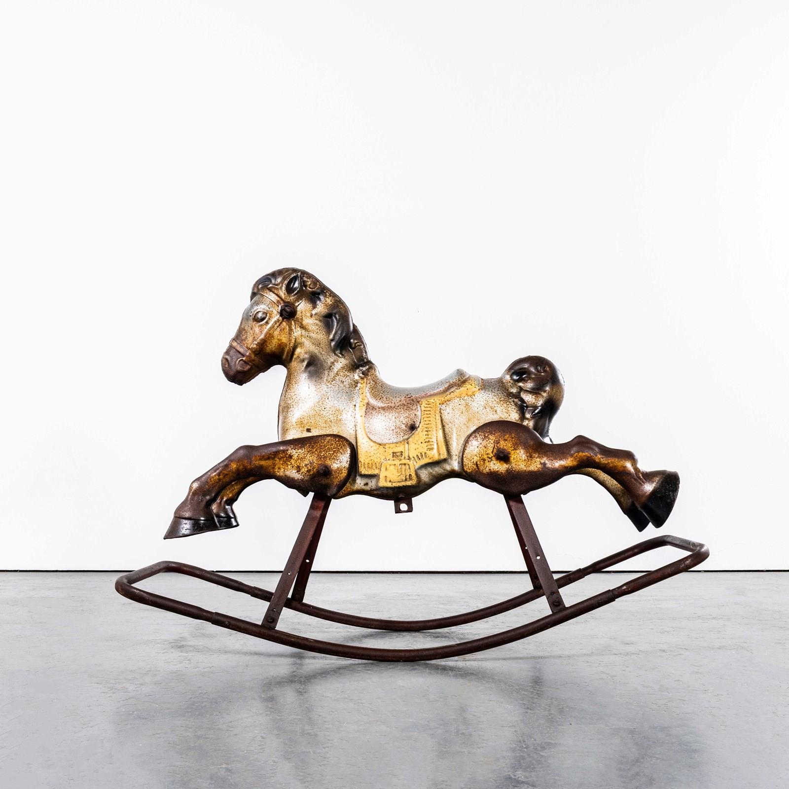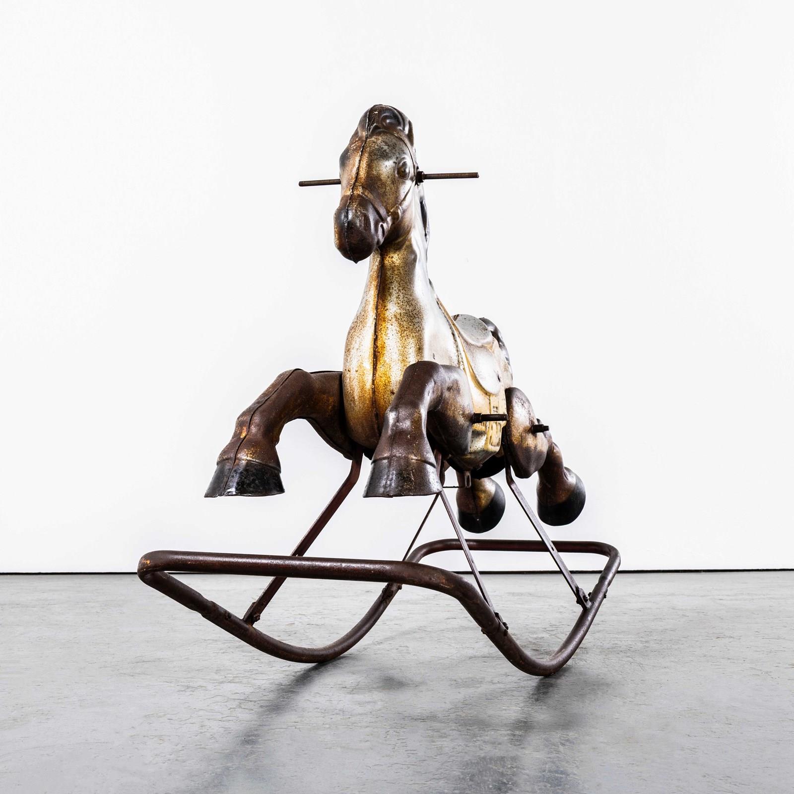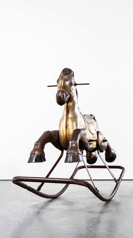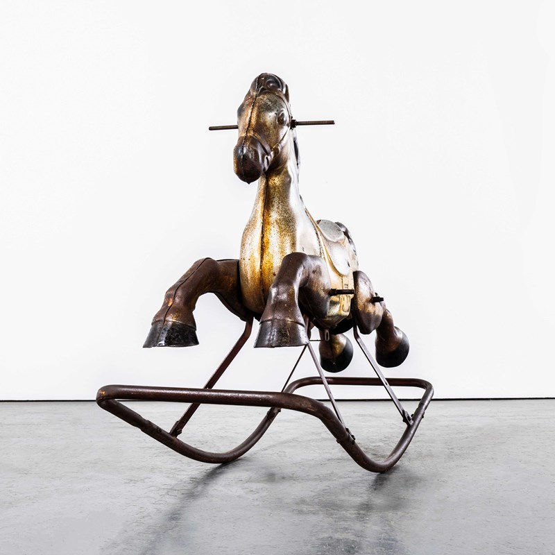 Classic pressed metal rocking horse by MOBO. MOBO started its journey with David Sebel a Russian who emigrated to England at the beginning of the 20th Century, and set up in partnership as a wheelwright in East London. The business was successful and as they grew, they expanded and Harry pioneered a new level and quality of British made toys. Manufacturing techniques developed in the war helped fuel an innovative ‘ride on’ Bronco horse powered by a quite sophisticated mechanism based on bicycle gears. The mechanism took a number of years to fully develop and was patented, the prototype clay body was sculpted by the RA artist Charles Morewood. The genius behind their toys was the mobility, ride on horses used the child’s body movements to mechanically power the toy horse along, pushing up and down on the stirrups propelled the horse. MOBO was famous for quality steel toys and is one of our favourite makers. The listing is for the horse as shown. It is sold as a stunning decorative object only. DO NOT use as a toy as it does not comply with current safety regulations and is not safe to ride on.