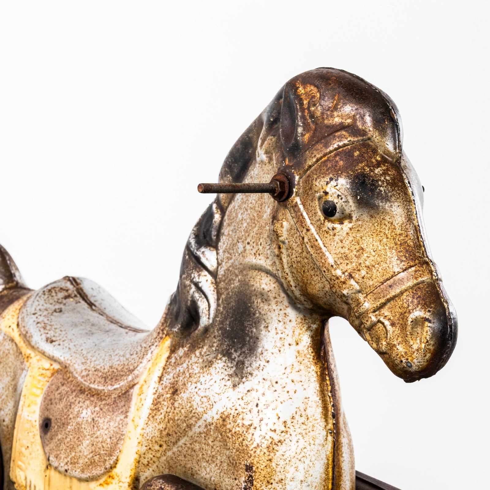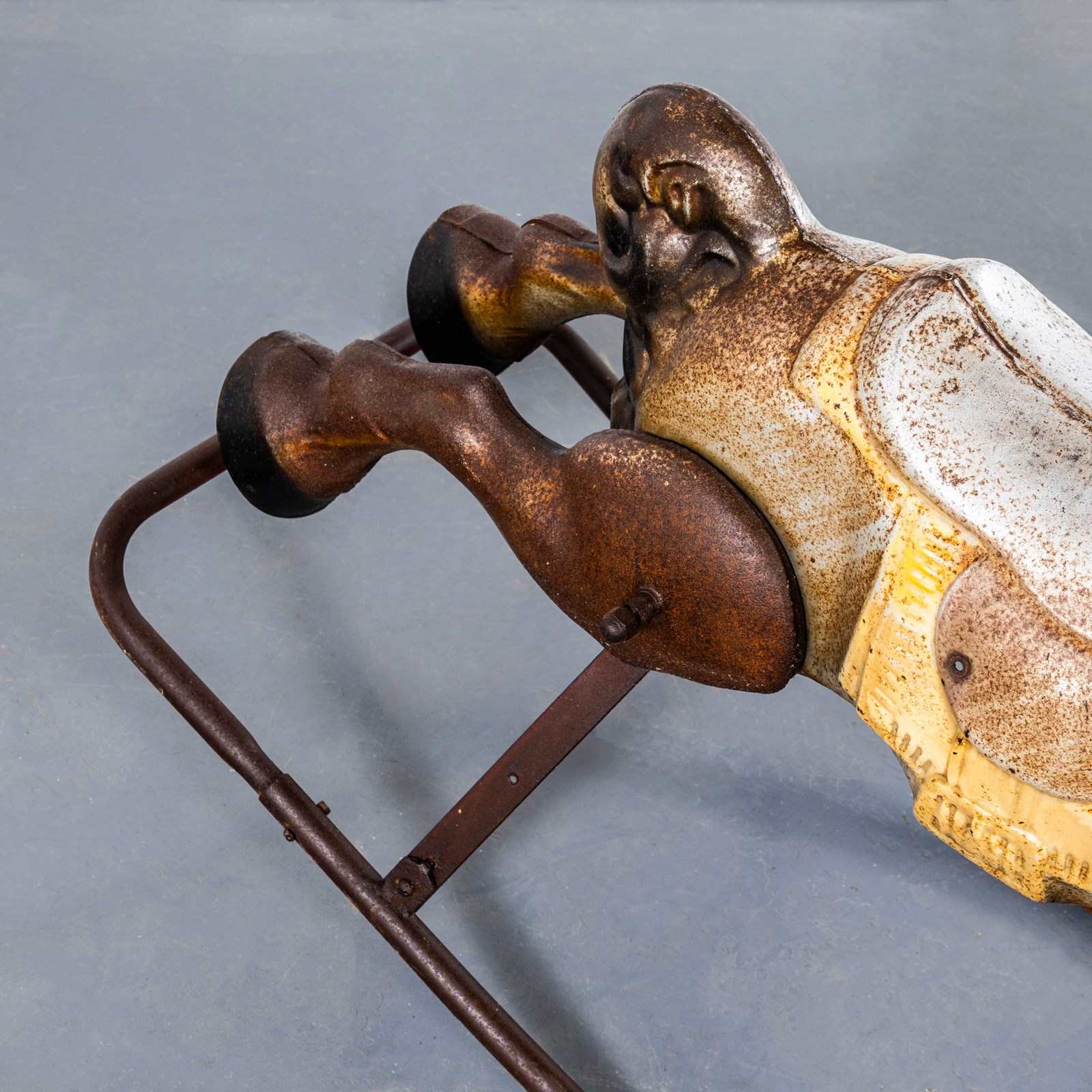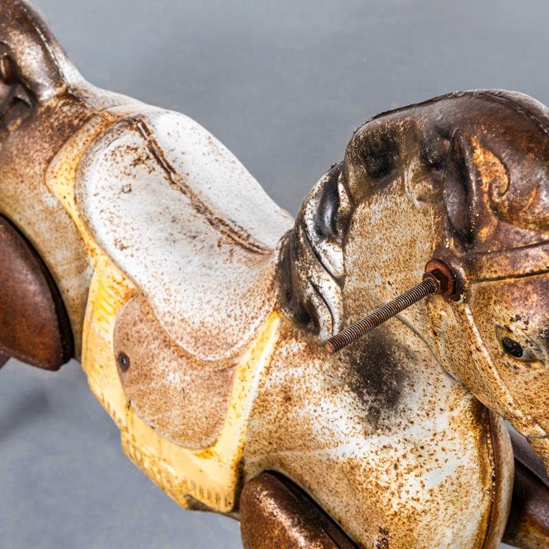 Classic pressed metal rocking horse by MOBO. MOBO started its journey with David Sebel a Russian who emigrated to England at the beginning of the 20th Century, and set up in partnership as a wheelwright in East London. The business was successful and as they grew, they expanded and Harry pioneered a new level and quality of British made toys. Manufacturing techniques developed in the war helped fuel an innovative ‘ride on’ Bronco horse powered by a quite sophisticated mechanism based on bicycle gears. The mechanism took a number of years to fully develop and was patented, the prototype clay body was sculpted by the RA artist Charles Morewood. The genius behind their toys was the mobility, ride on horses used the child’s body movements to mechanically power the toy horse along, pushing up and down on the stirrups propelled the horse. MOBO was famous for quality steel toys and is one of our favourite makers. The listing is for the horse as shown. It is sold as a stunning decorative object only. DO NOT use as a toy as it does not comply with current safety regulations and is not safe to ride on.