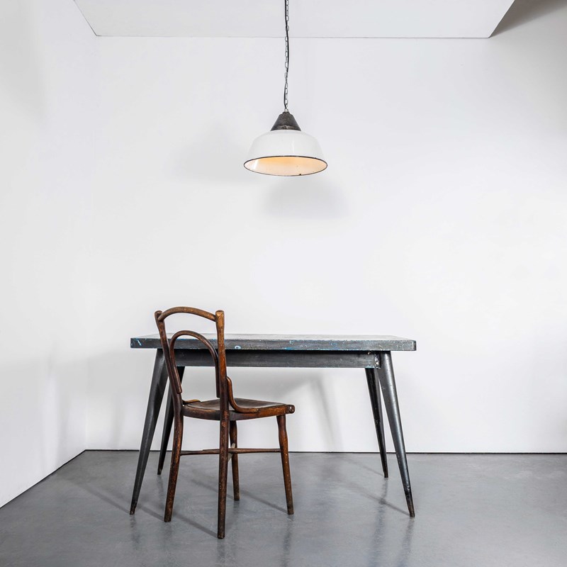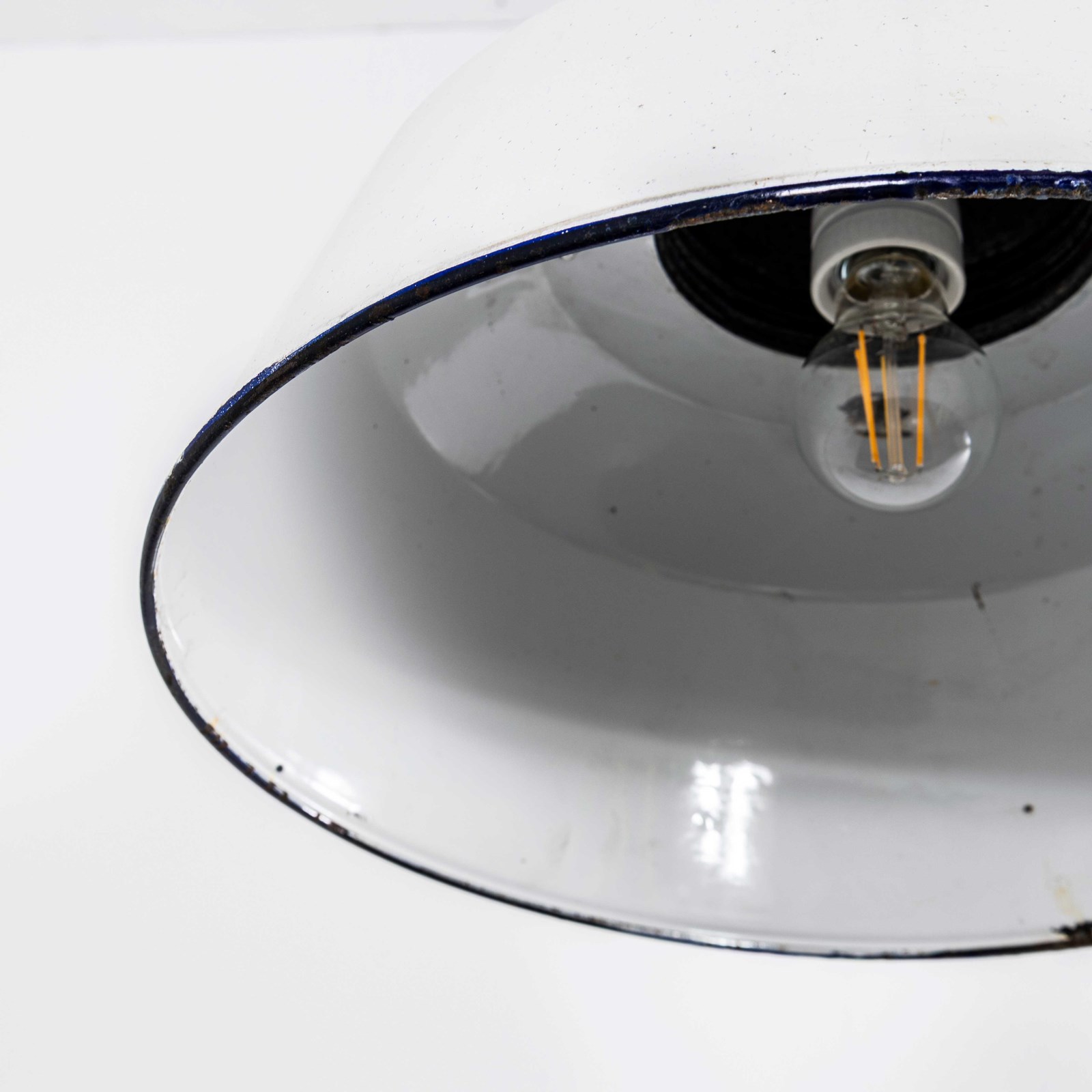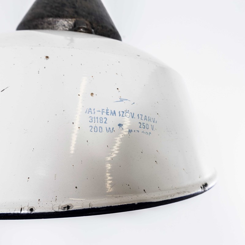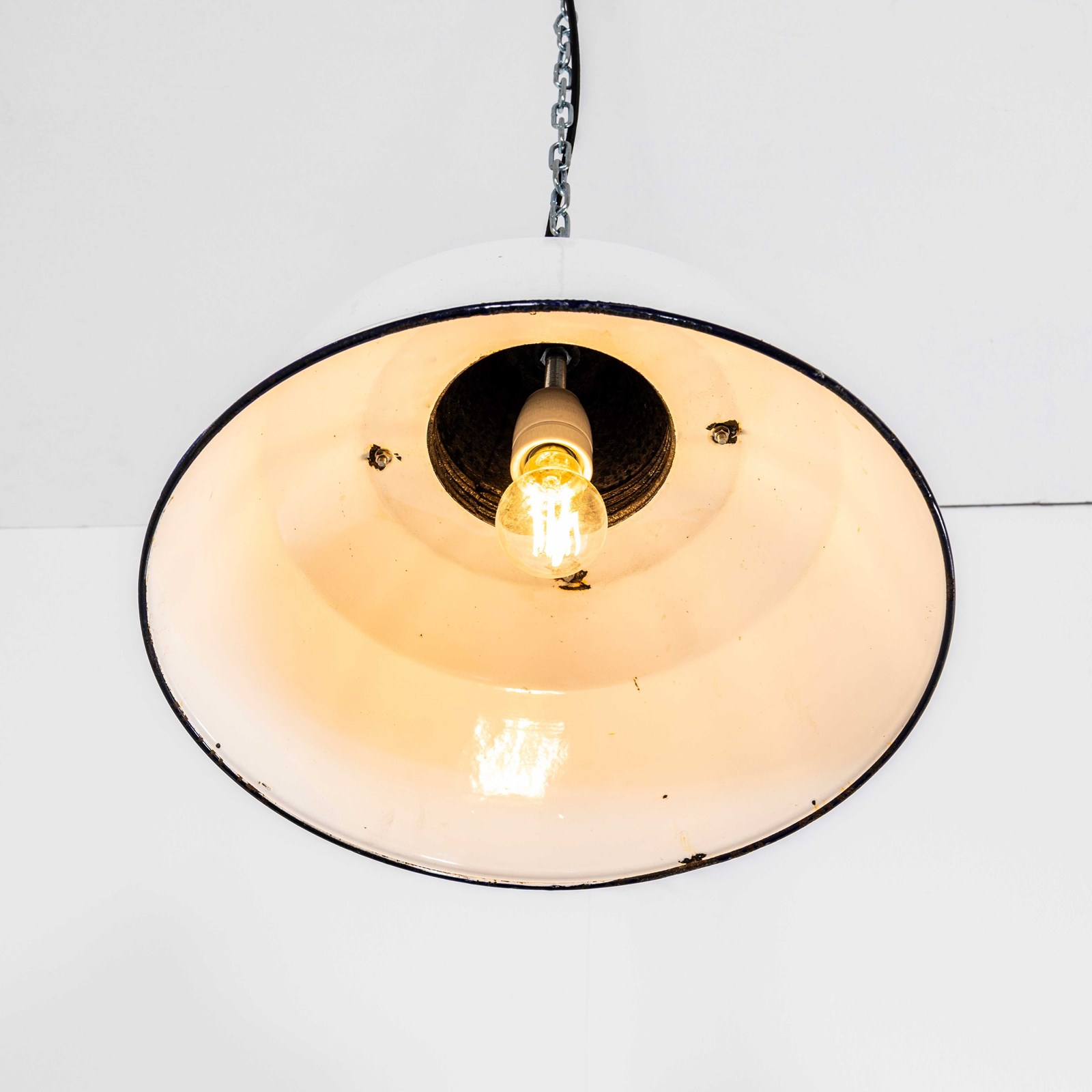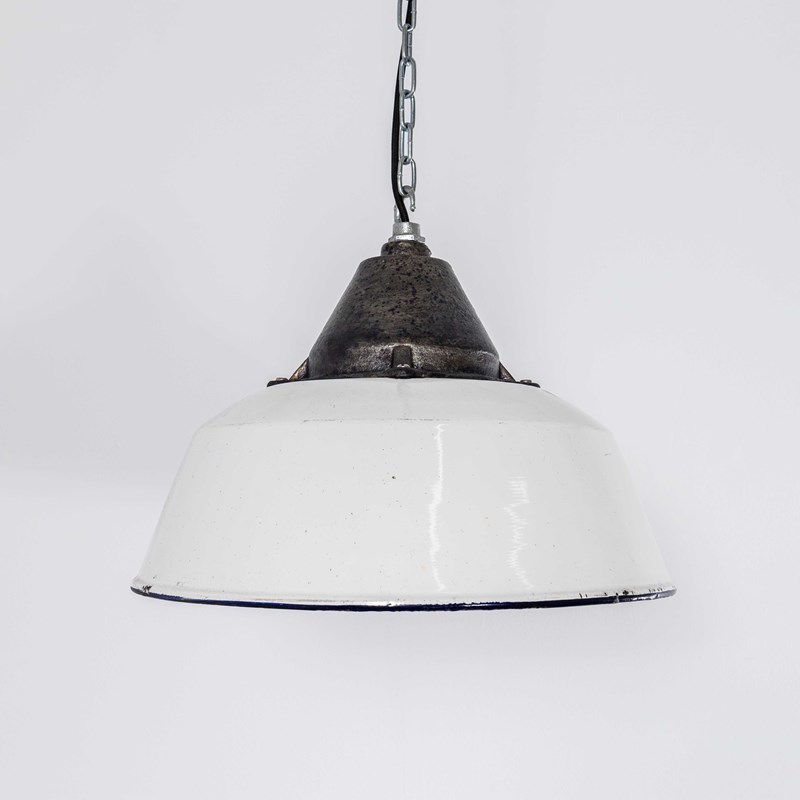 Classic industrial lamp from Eastern Europe, the shade and reflector are enamelled white, the top is a substantial cast gallery. The lamp has been cleaned and restored and all electrical components have been removed and replaced with modern European CE standard components to BS EN 60598 and is tested and labelled to BS EN 60598. INCLUDED: The lamp comes completely wired and ready to install including; 2 metres of chain for hanging the lamp, 2 metres of black fabric covered electrical cable and a ceiling hook as shown. The lamp is fitted with a standard E27 threaded lamp holder for which a wide range of modern and vintage style filament bulbs are widely available. We do not currently sell bulbs and recommend LED bulbs 6W maximum. We can also supply more than 2 metres of hanging cable/wire/chain etc. as required, please contact us separately to discuss. We are specialists in refurbishment of vintage lighting, please contact us with any questions regarding purchase or installation. The lamp is currently wired and fitted for UK and EU compliance. The lamp can be wired for compliance in the US or any global market. Listing is for one lamp.