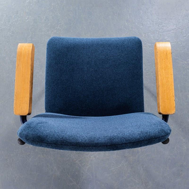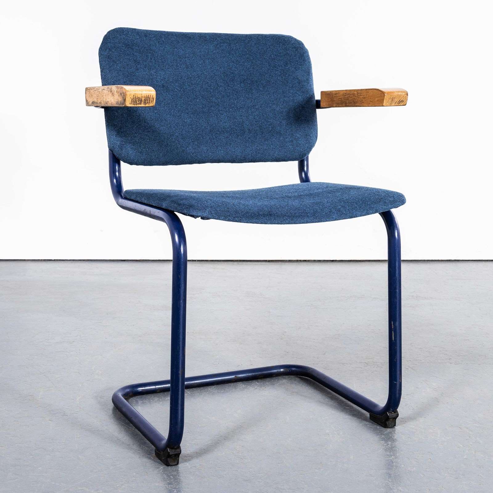 Classic Bauhaus style cantilever frame dining chair produced with chrome frames and reupholstered seats and backs and beech capped arms. Of good size and proportion the chairs are very comfortable with a slight spring thanks to the classic cantilever frame. The upholstery has been replaced by our workshop with a cotton/linen velvet. Seat Height: 47cm