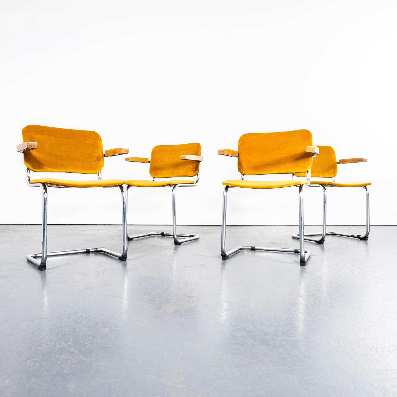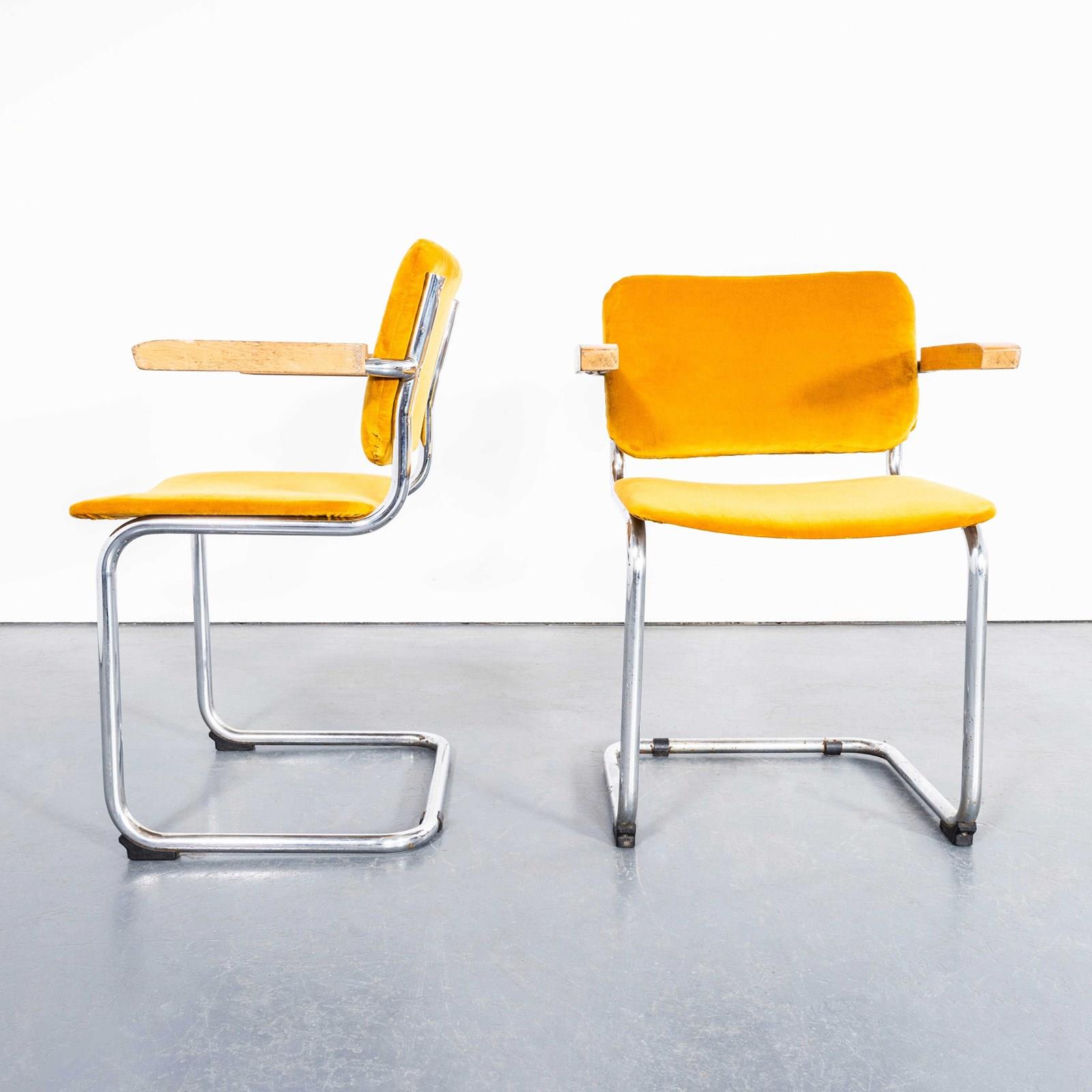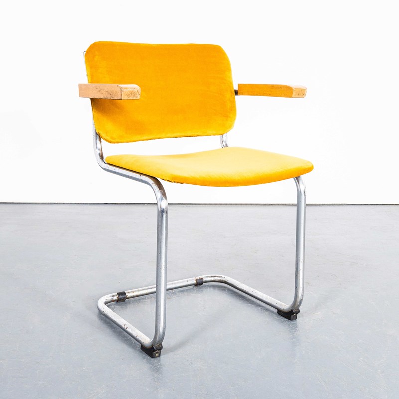 Classic Bauhaus style cantilever frame dining chair produced with chrome frames and reupholstered mustard seats and backs and beech capped arms. Of good size and proportion the chairs are very comfortable with a slight spring thanks to the classic cantilever frame. The upholstery has been replaced by our workshop with a cotton/linen velvet. Seat Height: 47cm